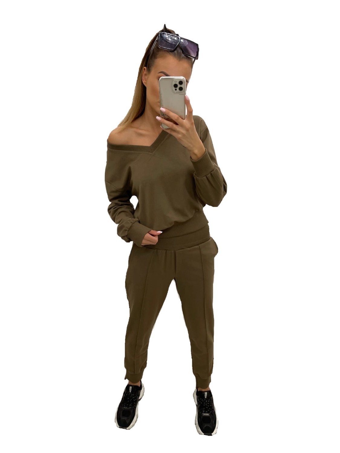 Brązowy dres damski świetnie sprawdza się zarówno w stylizacjach sportowych jak i eleganckich.