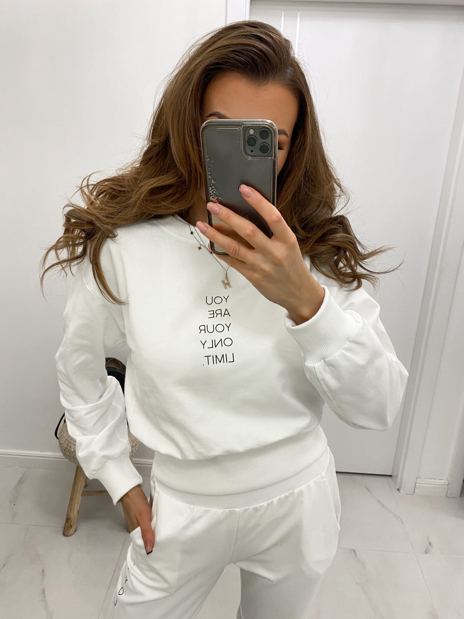Dopełnieniem jest biała bluza dresowa. Modna bluza damska posiada: