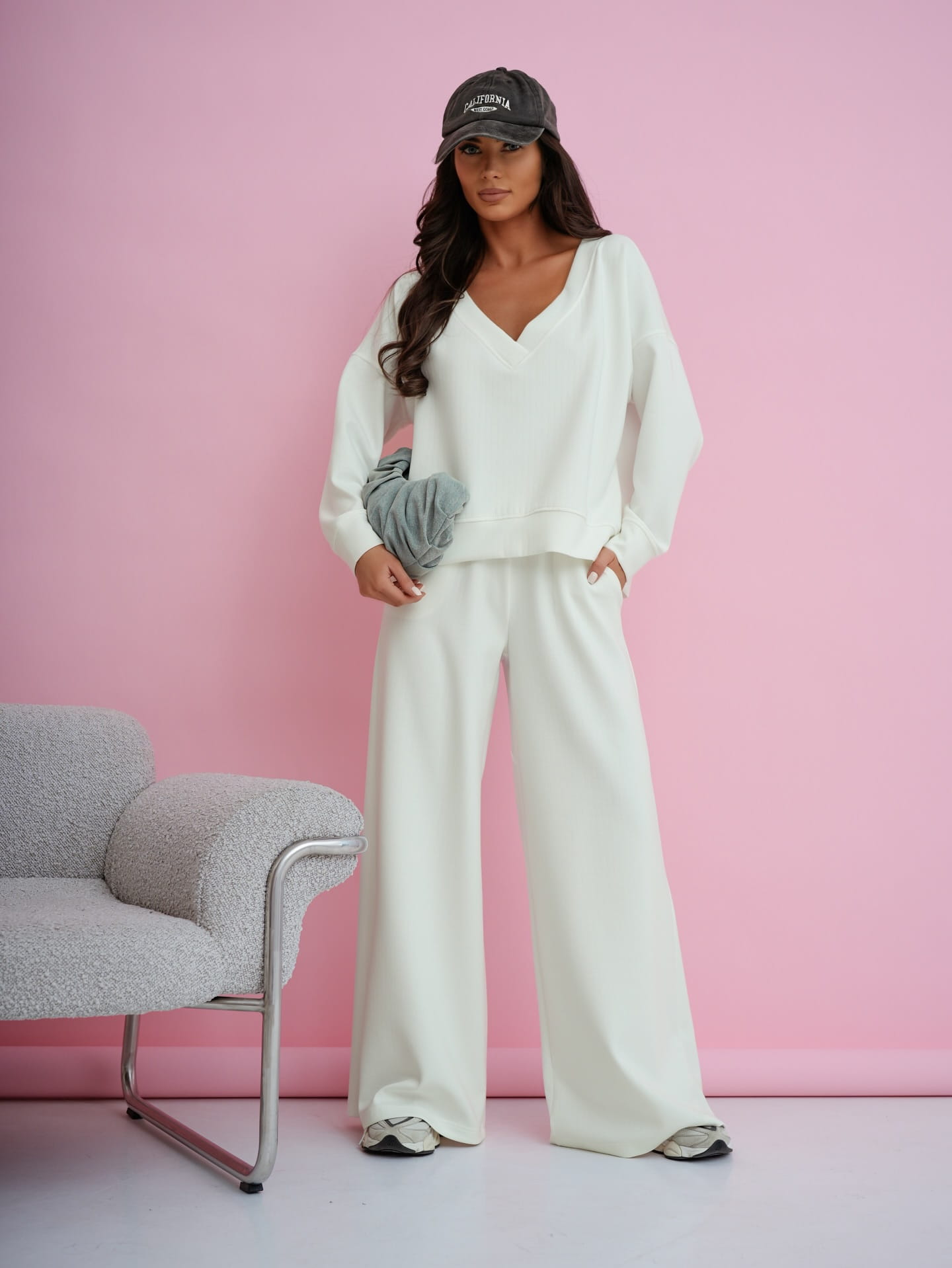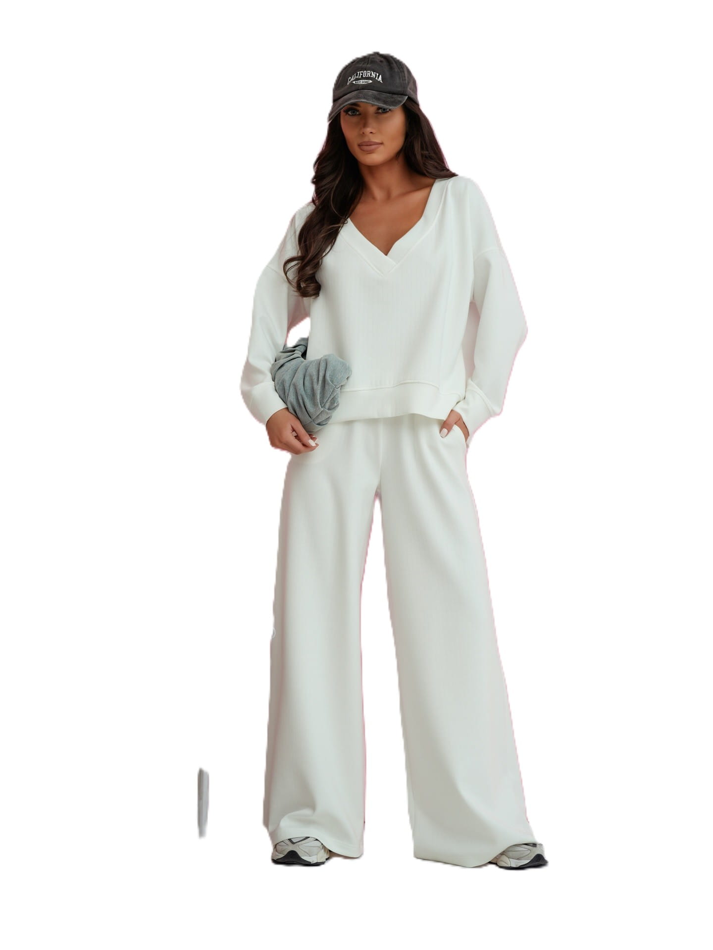 Dres damski komplet szerokie spodnie i bluza z dekoltem V biały Me Gusta