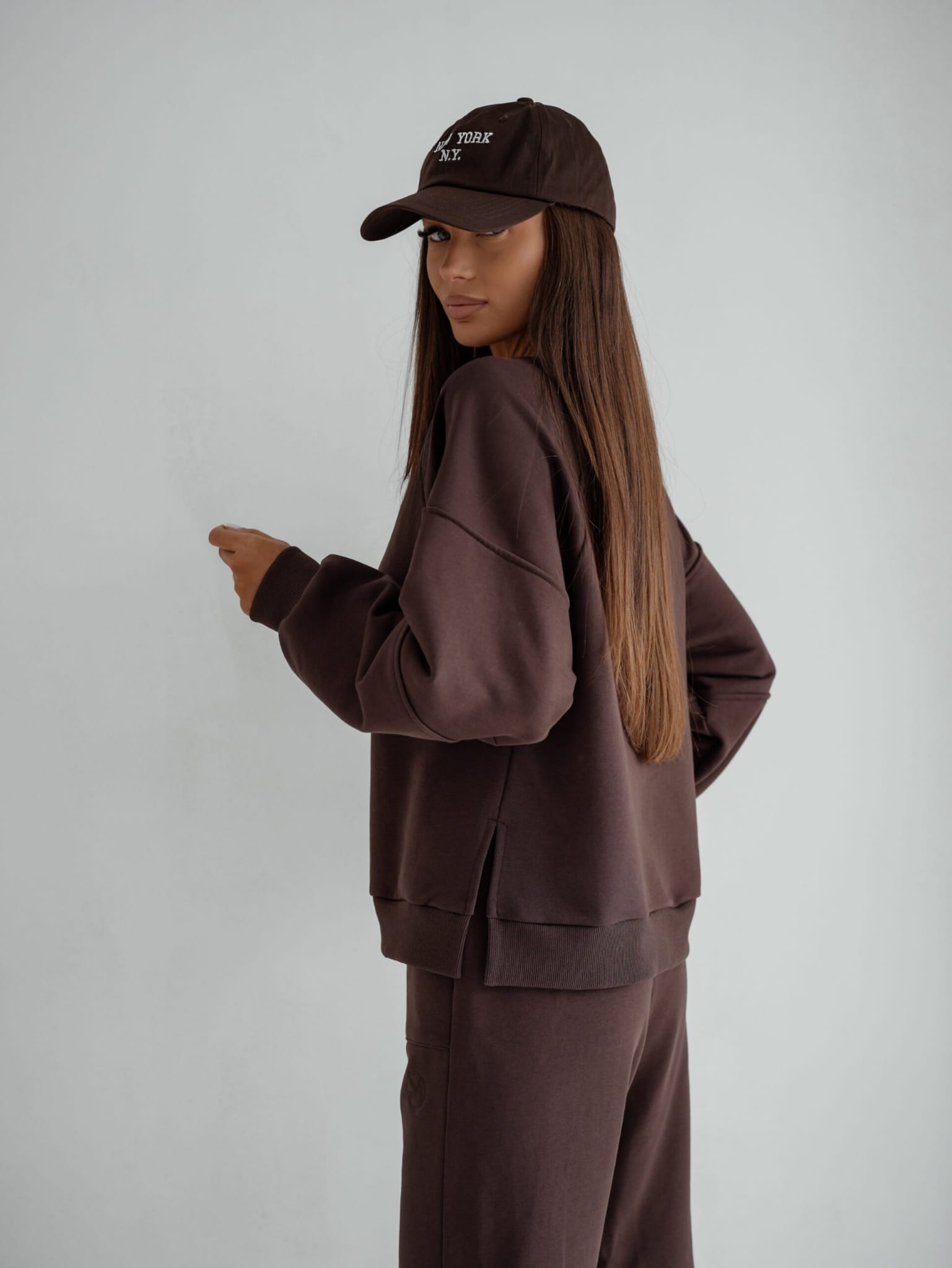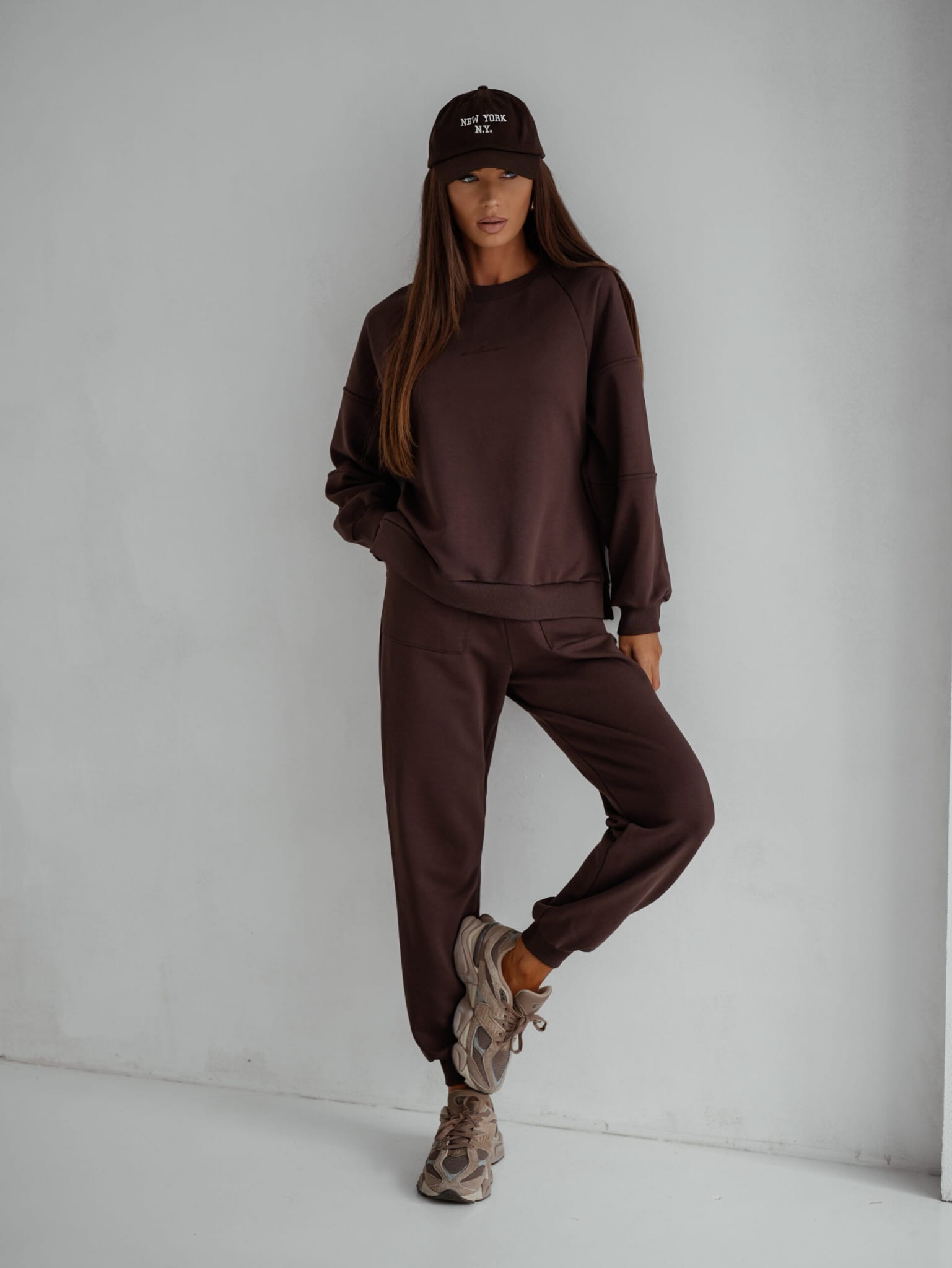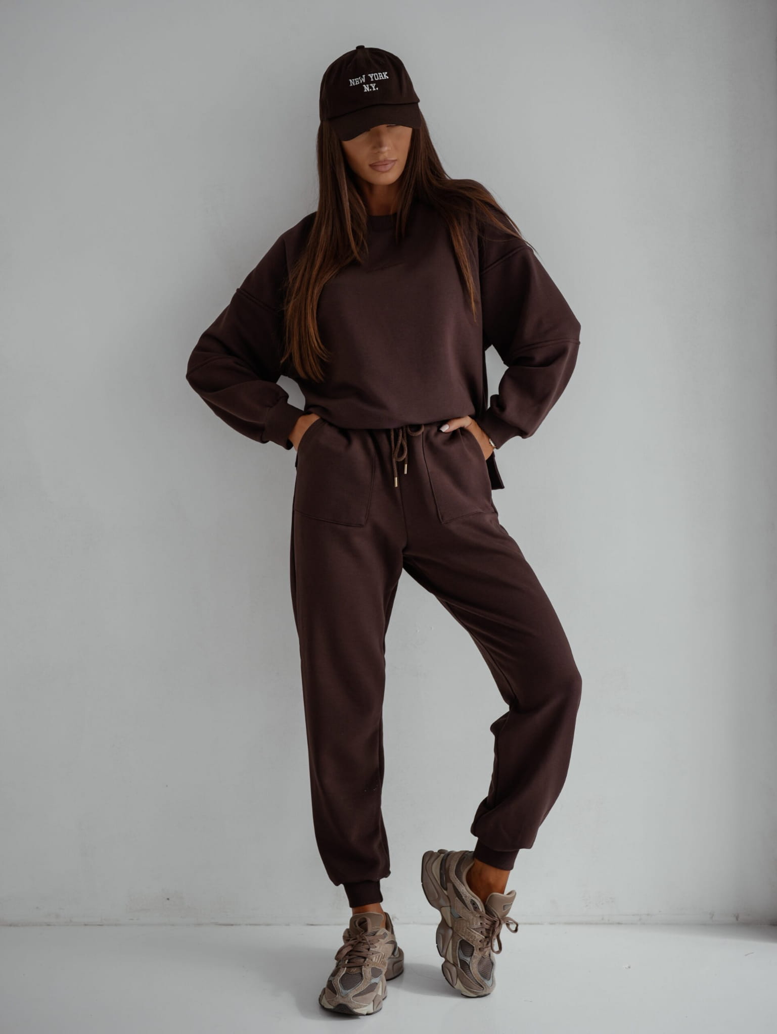 Czekoladowy kolor nadaje całości elegancki i modny look. Ten brązowy dres to doskonały wybór dla kobiet ceniących sobie nie tylko wygodę, ale również modny wygląd.