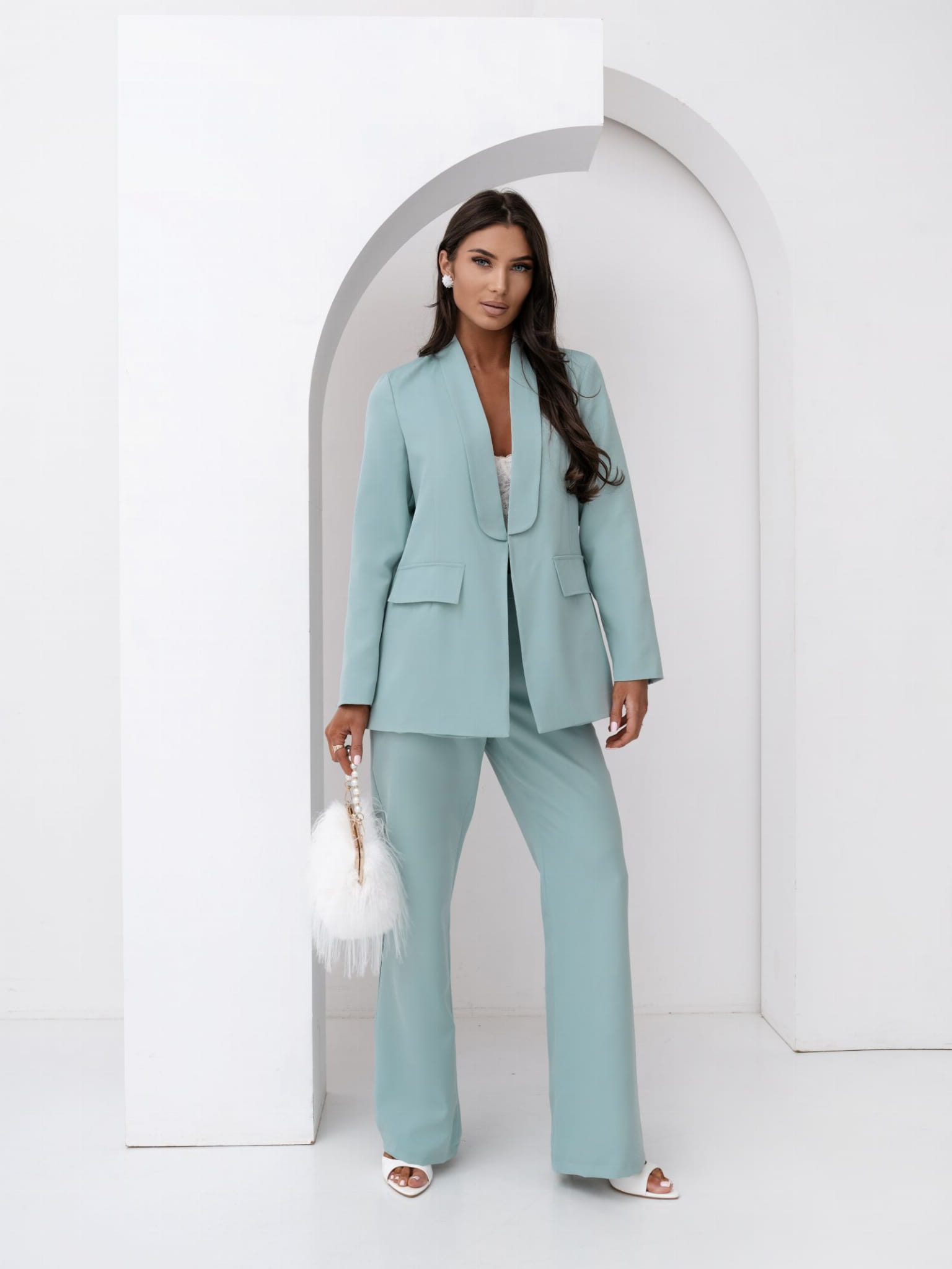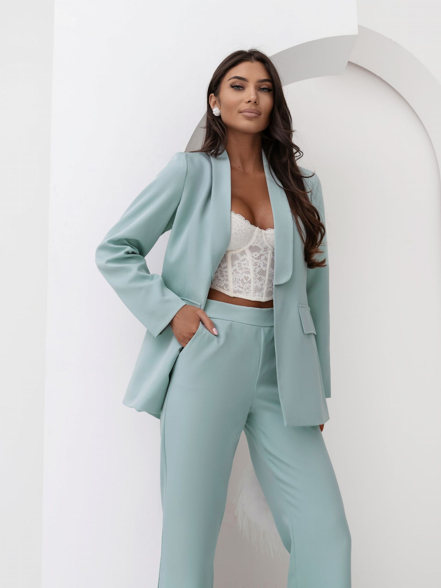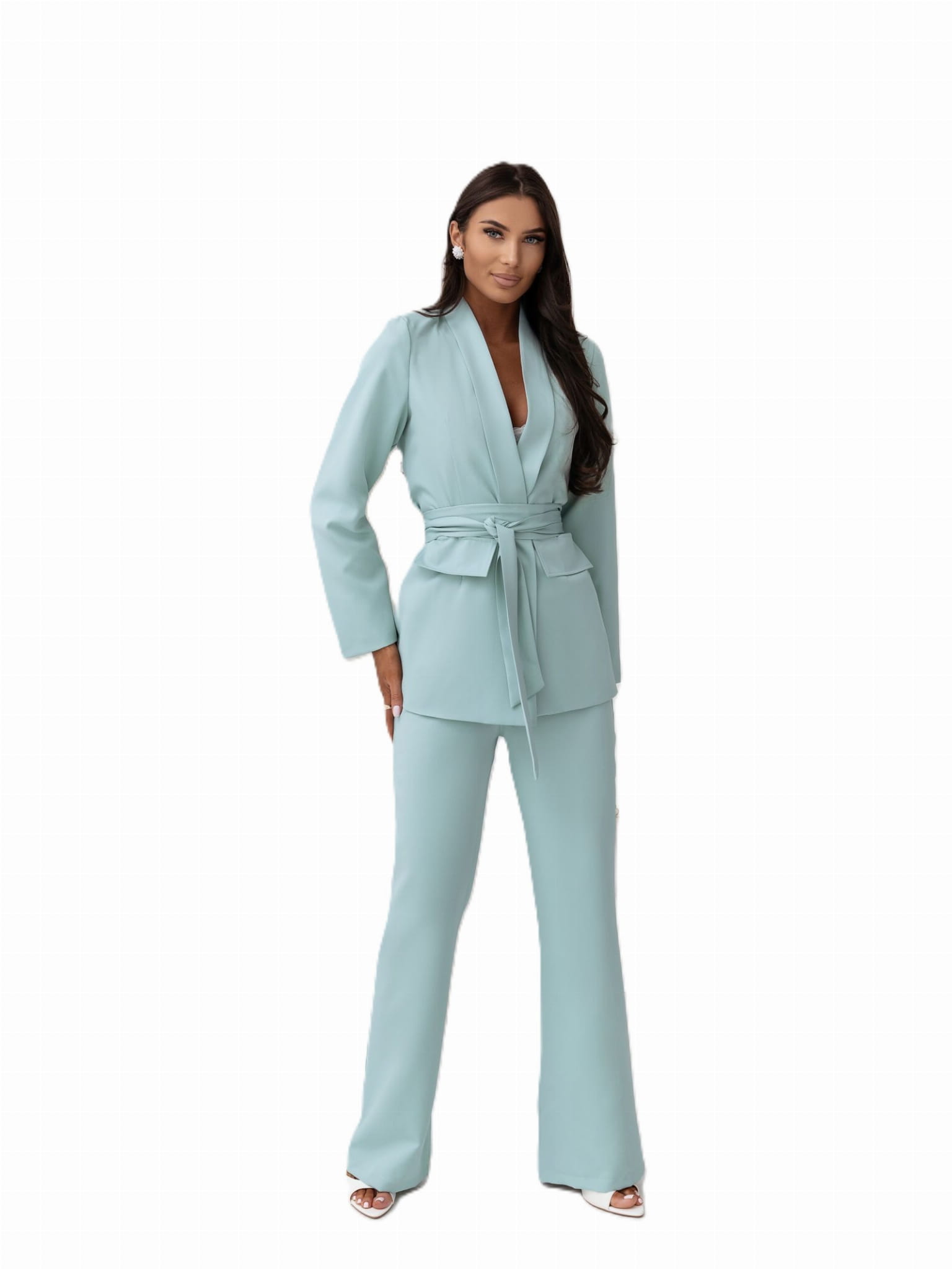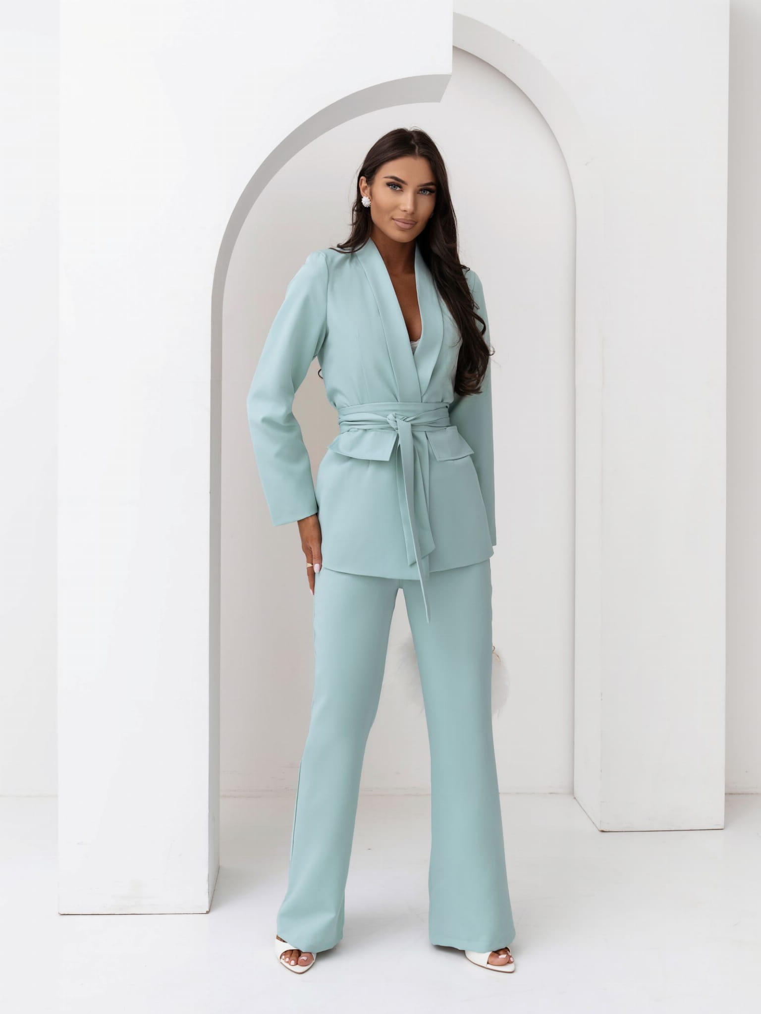 Garnitur komplet damski szerokie spodnie + marynarka z pasem szałwia Moon