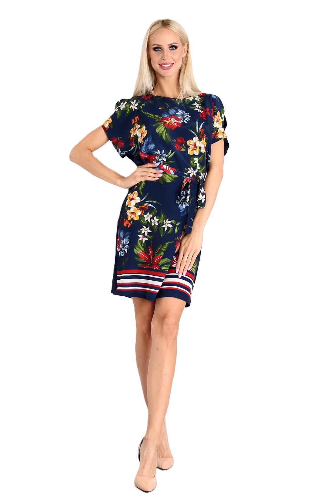 Krótki rękaw z delikatnym rozcięciem dodaje jej lekkości i elegancji, a cienki zwiewny materiał zapewnia komfort noszenia nawet w najgorętsze dni. Kwiatowy wzór umieszczony z przodu sukienki sprawia, że wyglądasz jak z prawdziwego ogrodu, podczas gdy tył zdobi gładki materiał. Sukienka posiada także materiałowy pasek, który podkreśla talię i dodaje kobiecego uroku. Jej długość sięga przed kolana, co sprawia, że jest idealna na różnego rodzaju imprezy i uroczystości.