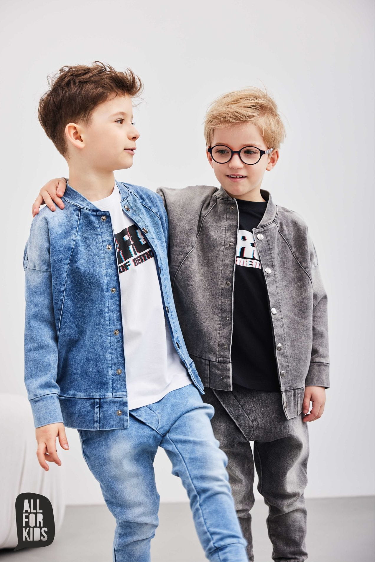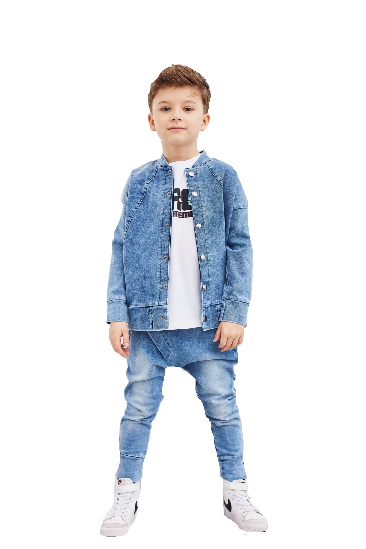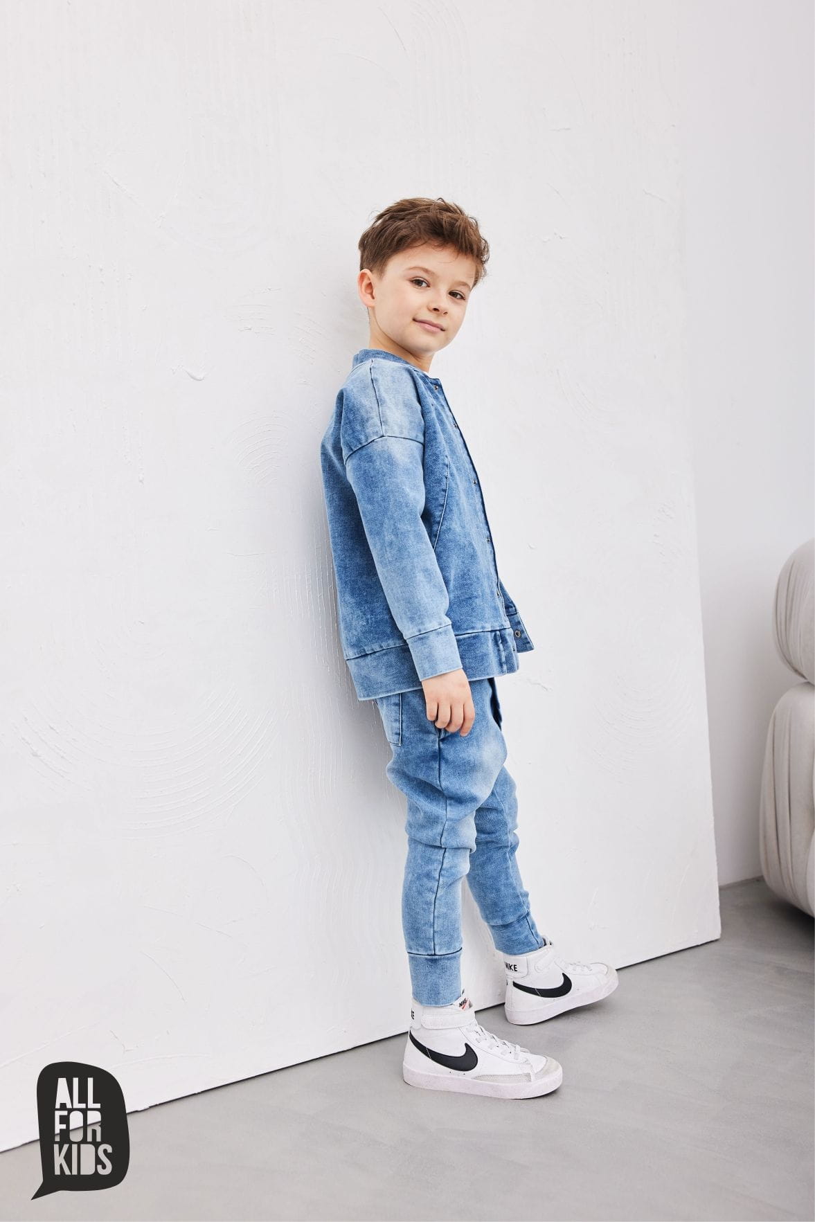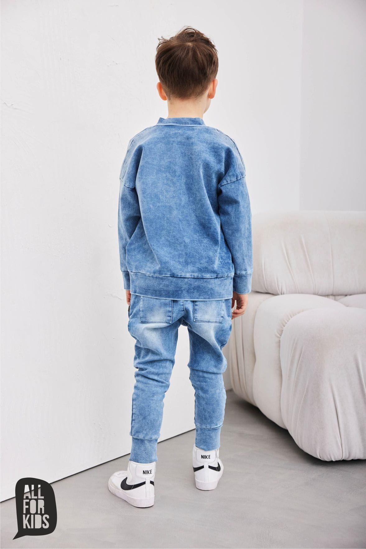 Jeansowa bluza bomberka powstała w Polsce przez markę All For Kids z komfortowej w noszeniu dzianiny jeansowej, dzięki czemu jest miękka i komfortowa w noszeniu.