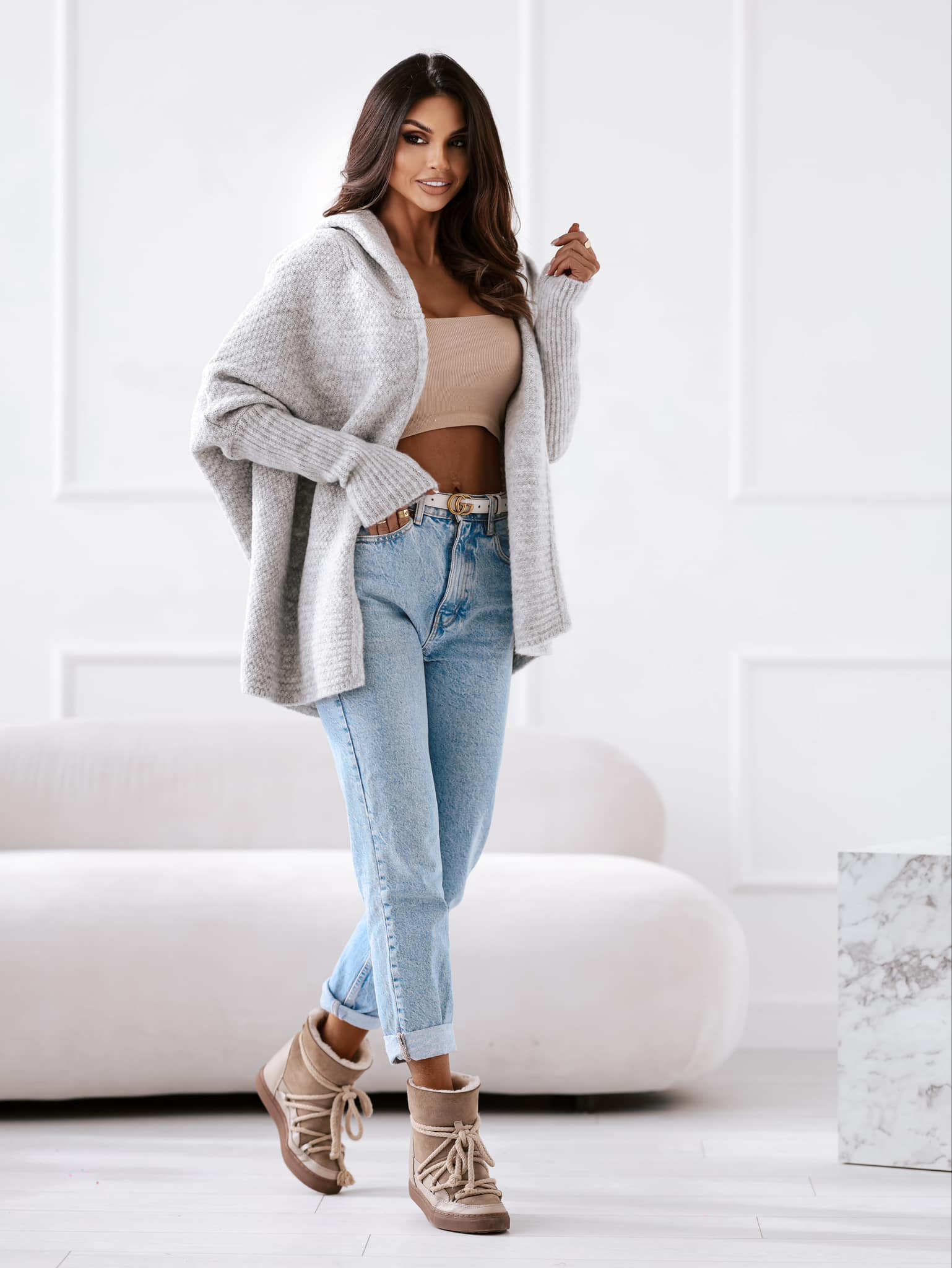 Ciepły sweter z kapturem o kroju oversize to sweter, który pięknie wygląda na każdej sylwetce.