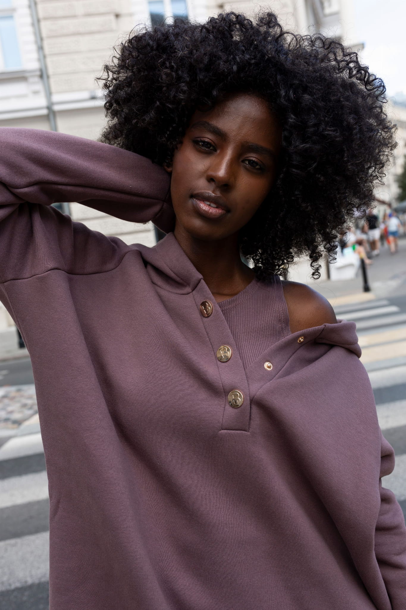 - Zapinana na zatrzaski przy dekolcie z możliwością odsłonięcia ramienia dla bardziej swobodnego looku.