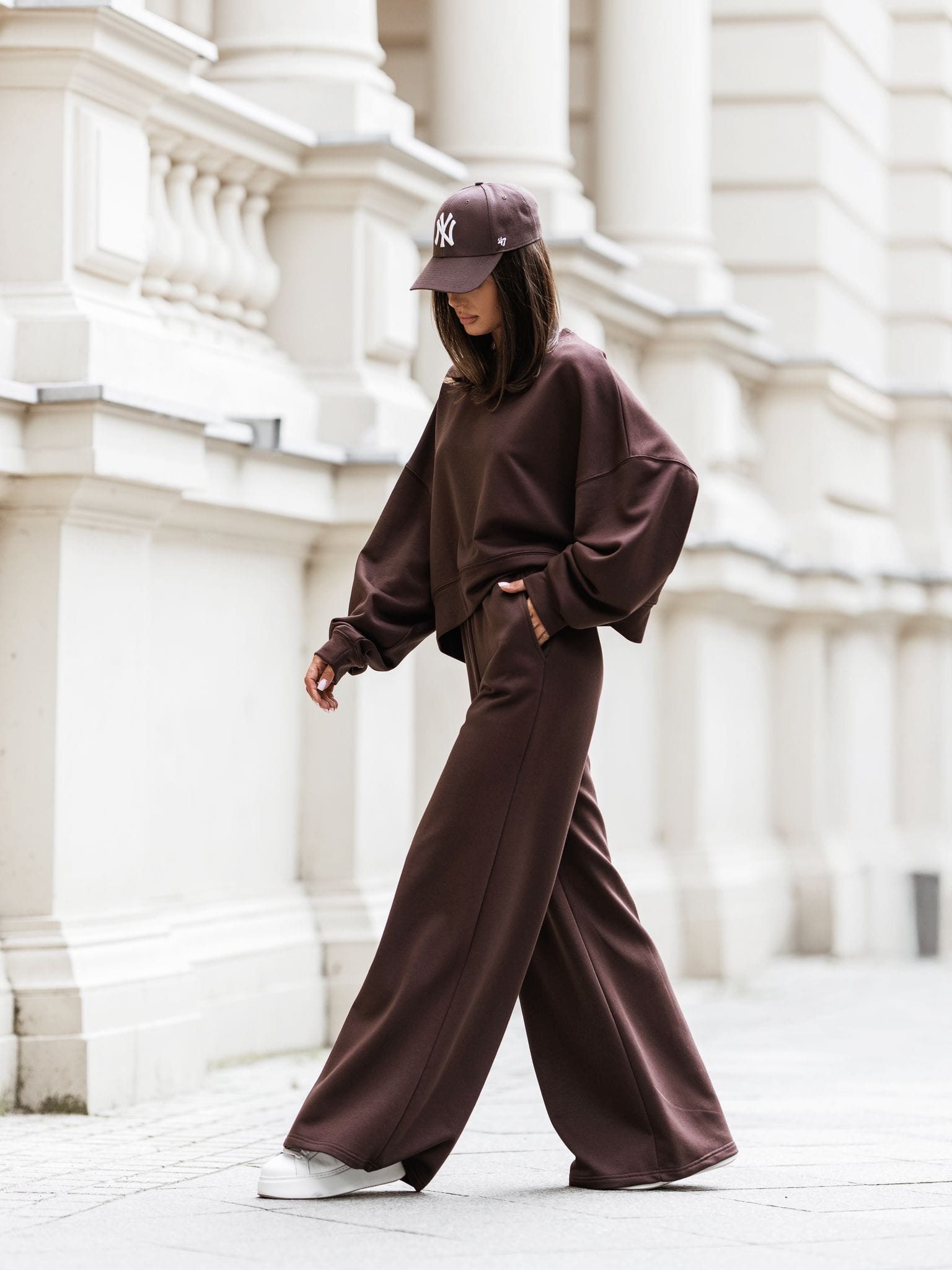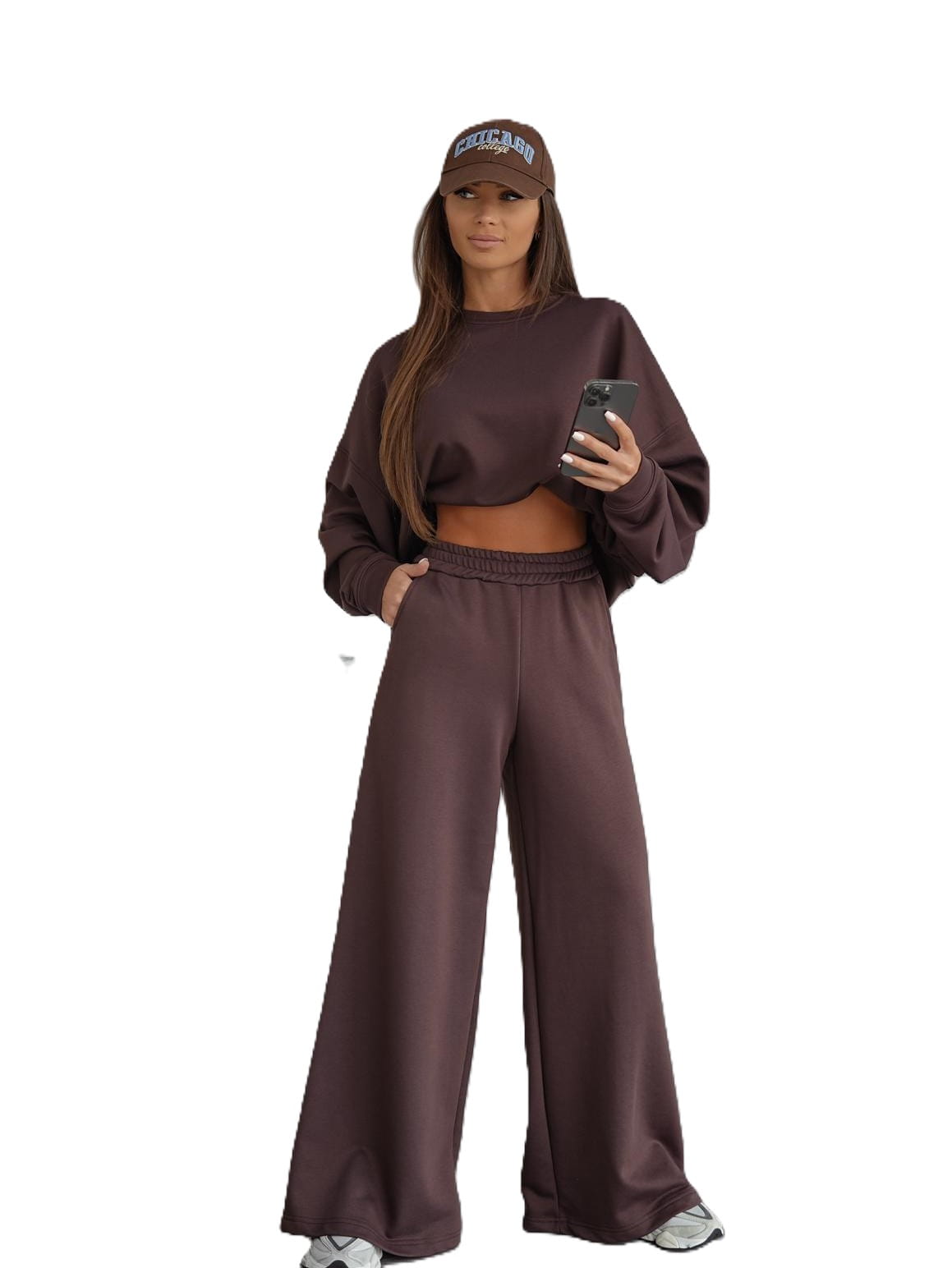 Ten czekoladowy komplet dresowy składa się z szerokich spodni i luźnej bluzy, które idealnie sprawdzą się zarówno w codziennych stylizacjach, jak i podczas relaksu w domowym zaciszu.