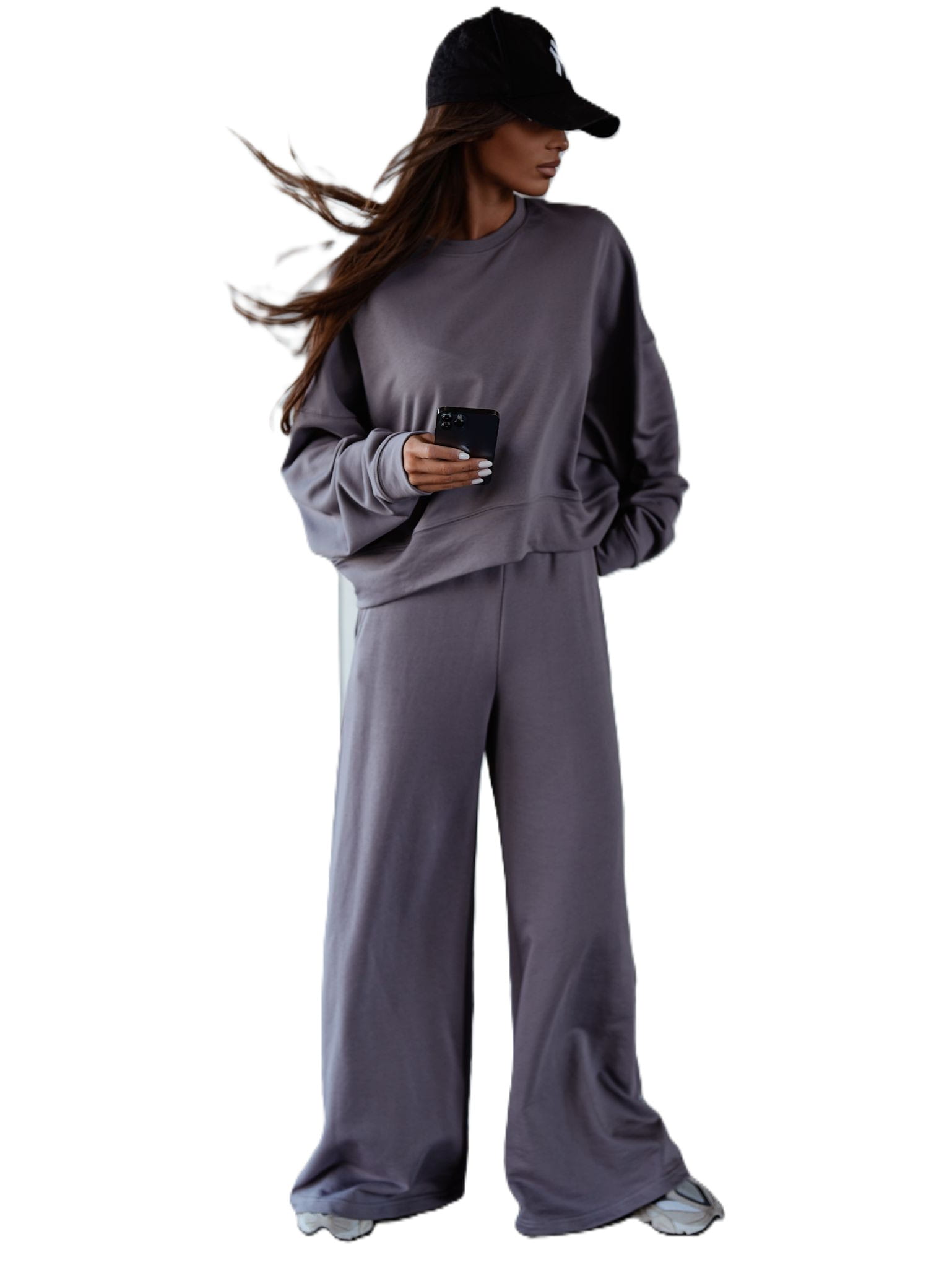 Ten szary komplet dresowy składa się z szerokich spodni i luźnej bluzy, które idealnie sprawdzą się zarówno w codziennych stylizacjach, jak i podczas relaksu w domowym zaciszu.