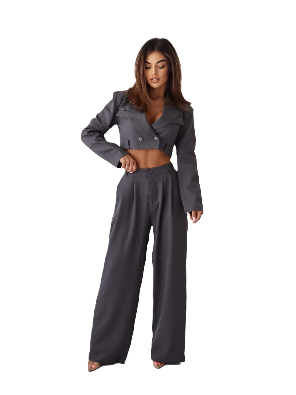 Ten modny komplet szerokie spodnie i krótka marynarka to połączenie klasyki z nowoczesnością. Idealny dla kobiet, które chcą wyglądać stylowo, ale nie rezygnują z komfortu. Grafitowy kolor dodatkowo podkreśla uniwersalność zestawu - pasuje do wielu innych kolorów i dodatków.