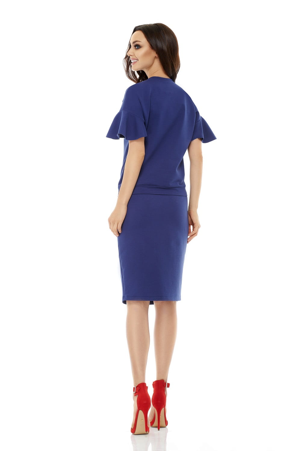Bawełniany komplet to bluzka z rękawkami w kształcie falbanki i klasyczna ołówkowa spódnica. Granatowa bluzka i spódnica tworzą zestaw, który sprawdzi się razem jak i osobno, tworząc kreacje świetne zarówno do pracy jak i na spotkanie z przyjaciółmi.
