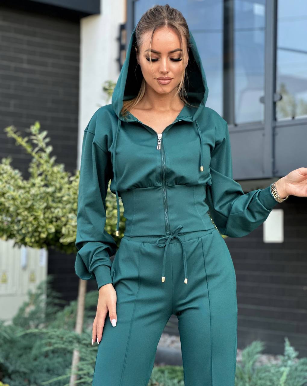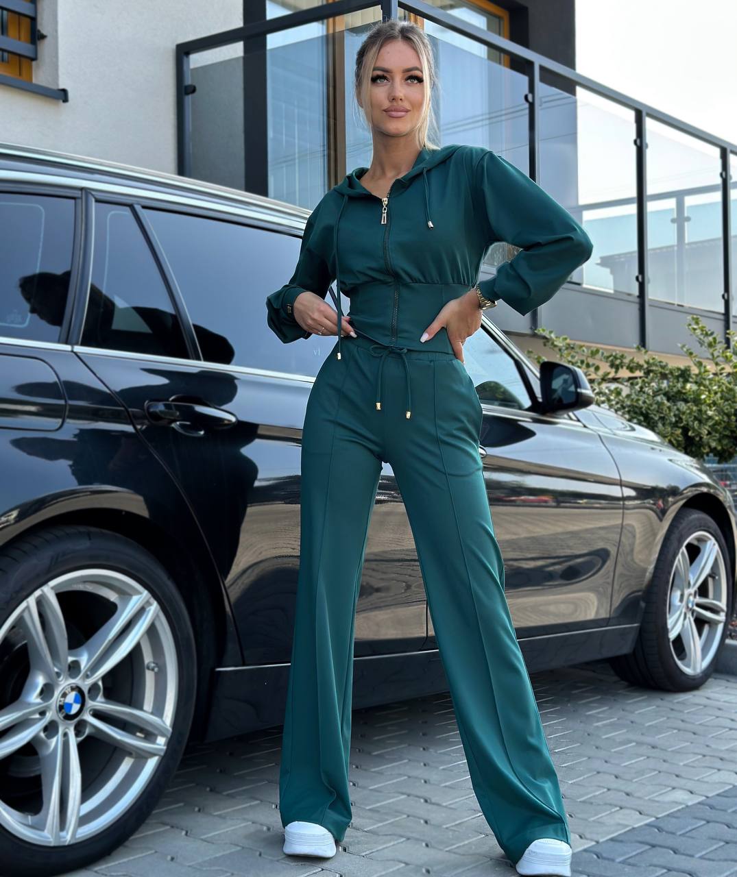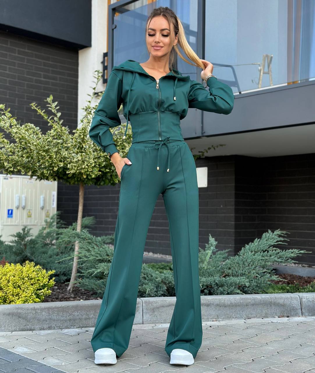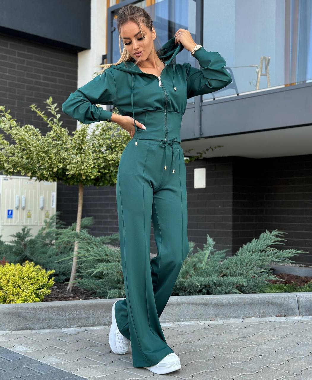 Bawełniany komplet damski składa się z szerokich spodni z ozdobnym przeszyciem wzdłuż nogawki oraz bluzy z kapturem zapinanej na zamek.