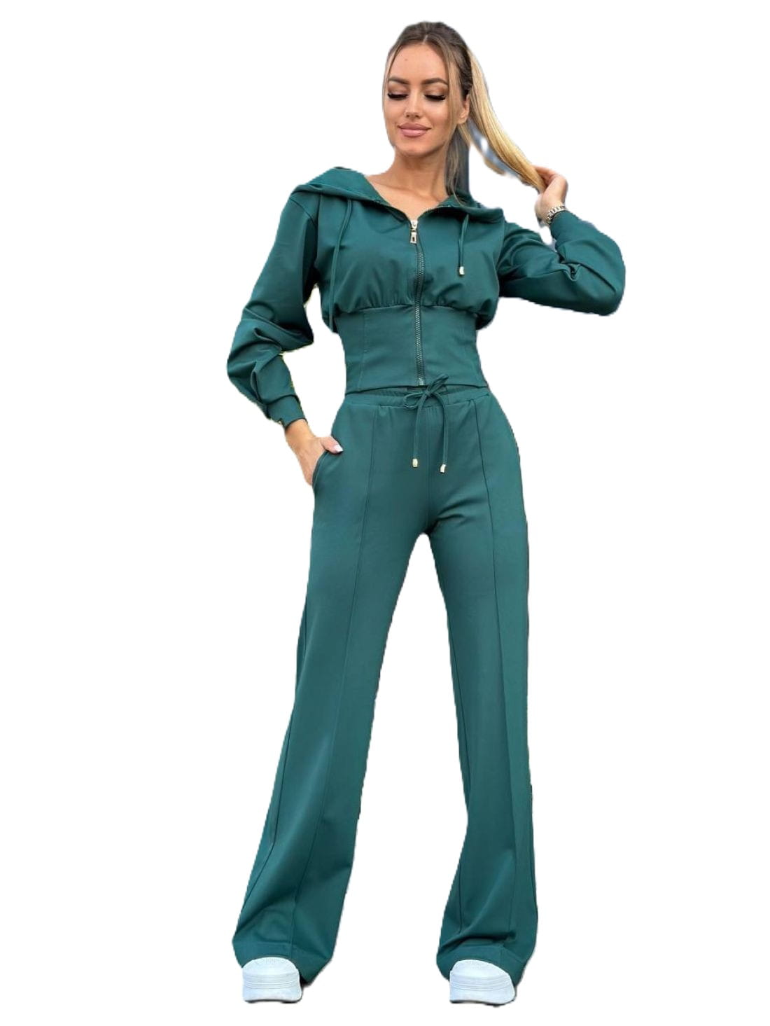 Zielony komplet bawełniany z szeroką nogawką.