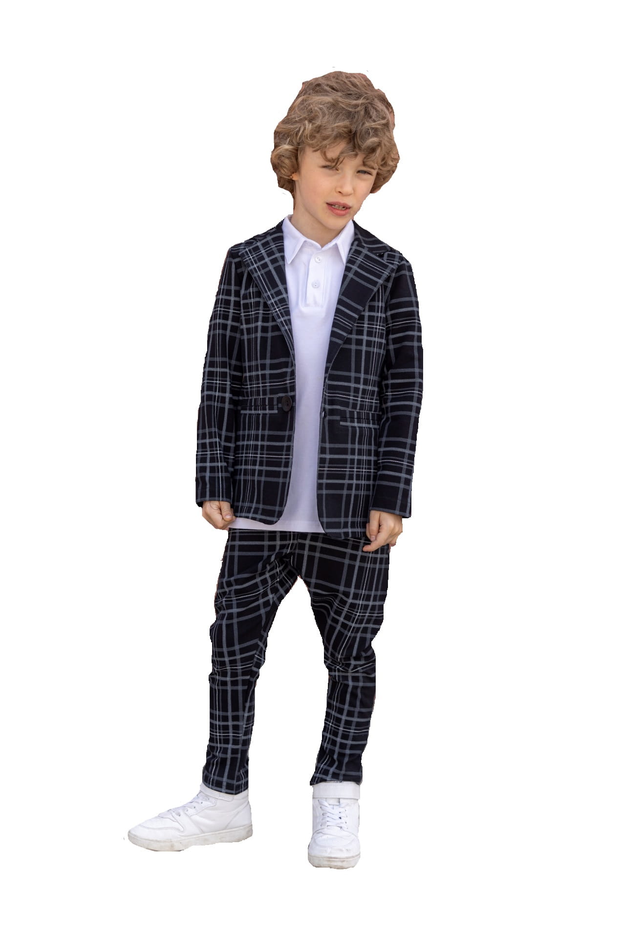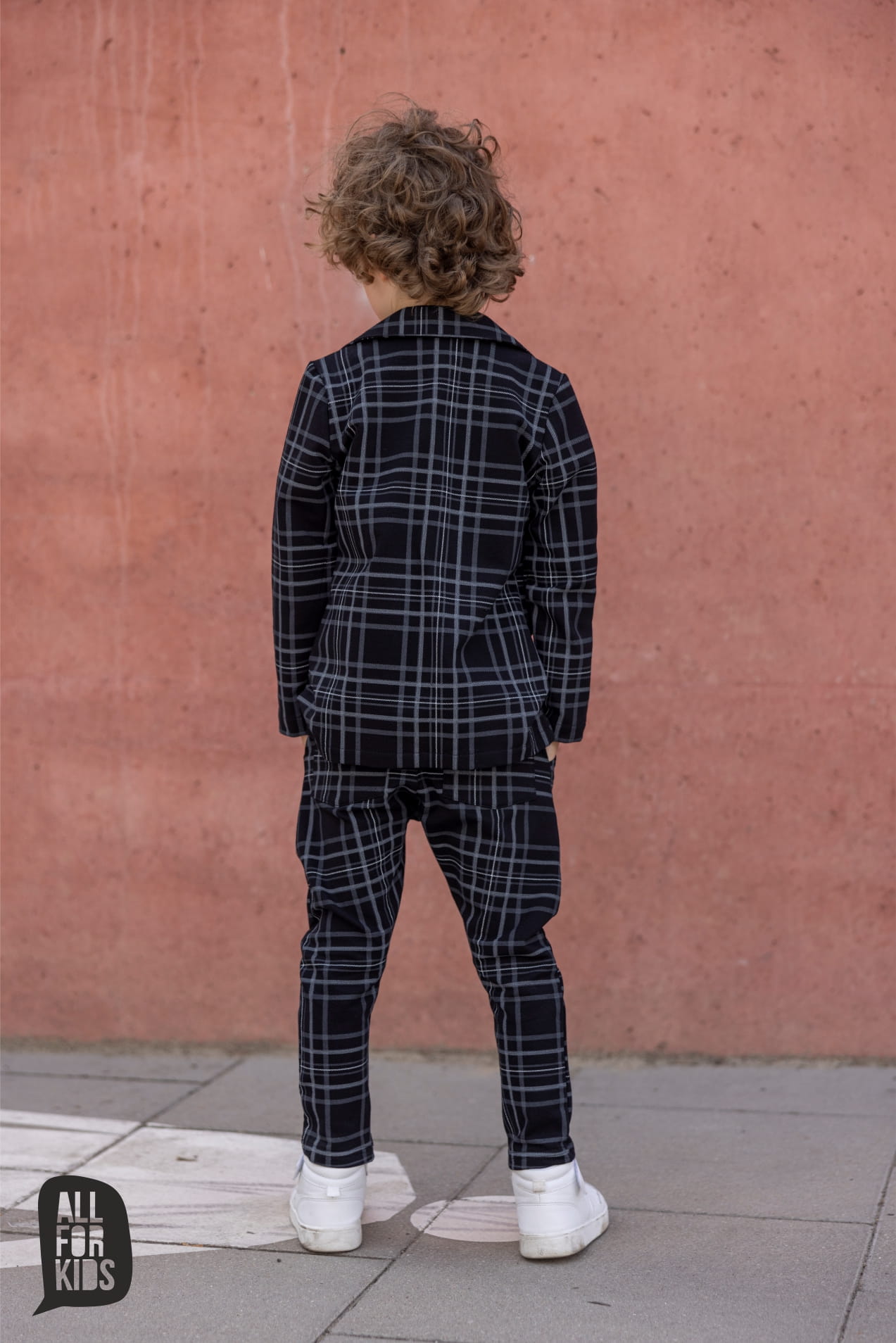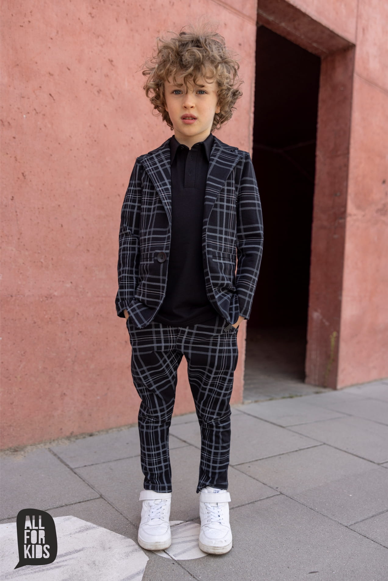 Zjawiskowa marynarka w kratę dla fanów sportowej elegancji. Modna marynarka chłopięca wykonana z komfortowej w noszeniu dzianiny dresowej.