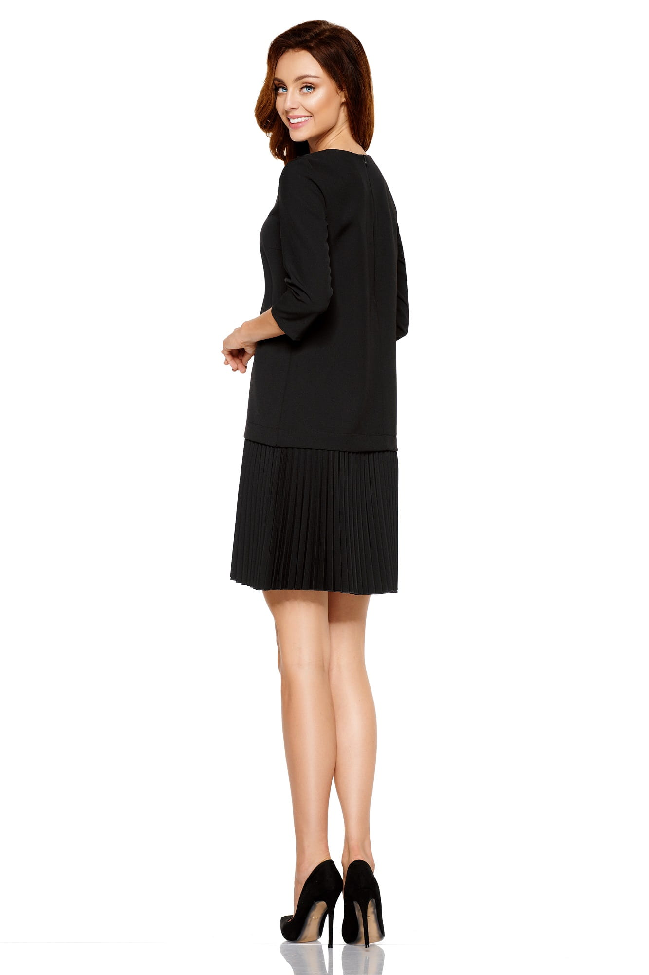 Charakteru dodają jej modne plisowania, które tworzą doskonałe dopełnienie obniżonej talii. Elegancka sukienka posiada okrągły dekolt, prosty krój, kryty zamek na plecach oraz komfortowy w noszenu rękaw 3/4.