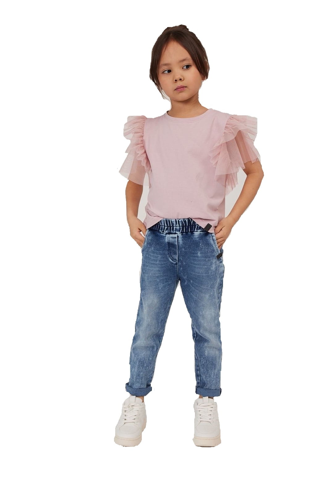 Bawełniana bluzka z tiulowymi falbankami przy rękawie świetnie sprawdzi się na wiele różnych okoliczności.