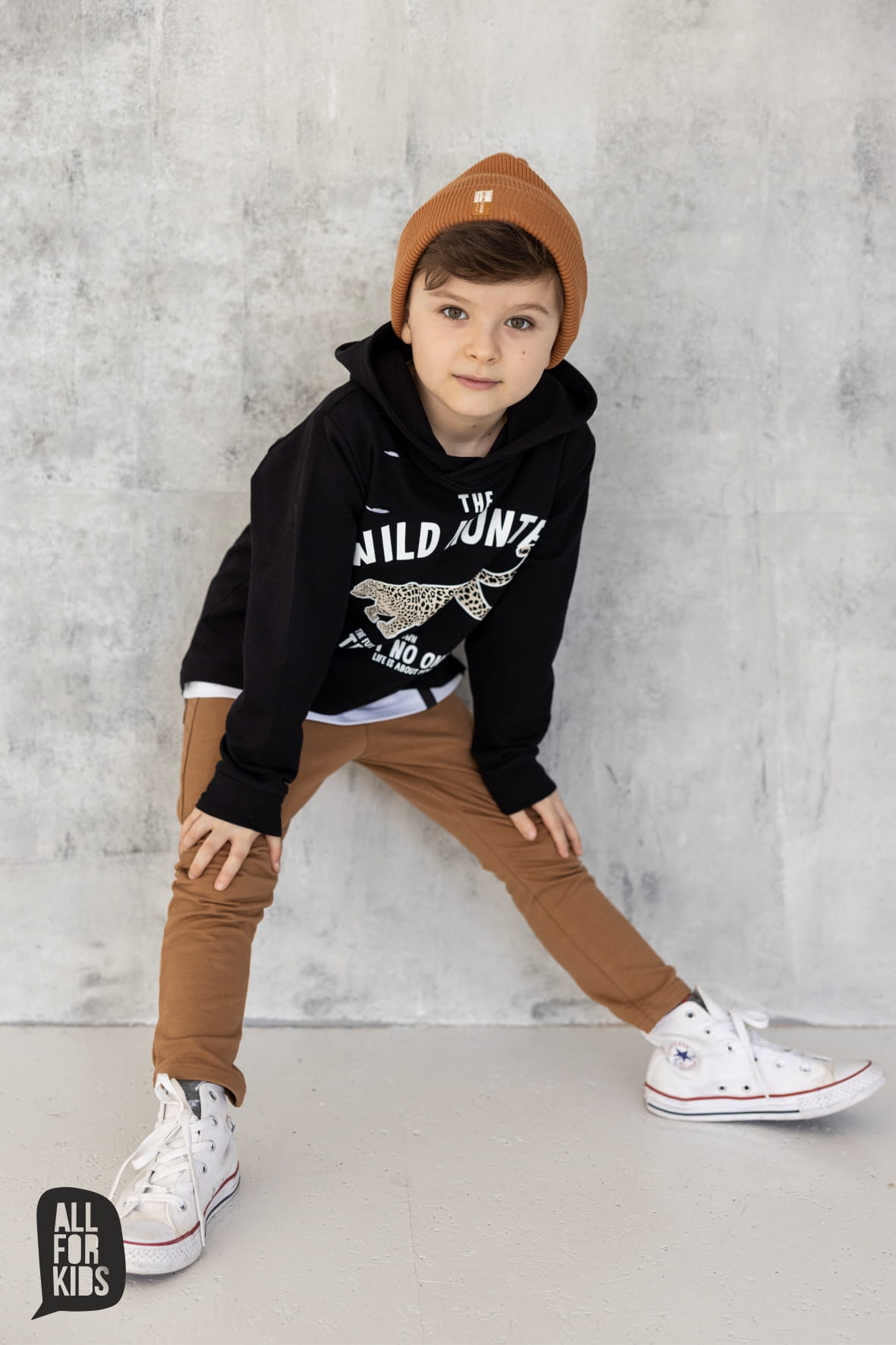 Karmelowe spodnie basic od polskiej marki All For Kids. Klasyczne spodnie dziecięce wykonane z wysokiej jakości, komfortowej w noszeniu dzianiny dresowej.
