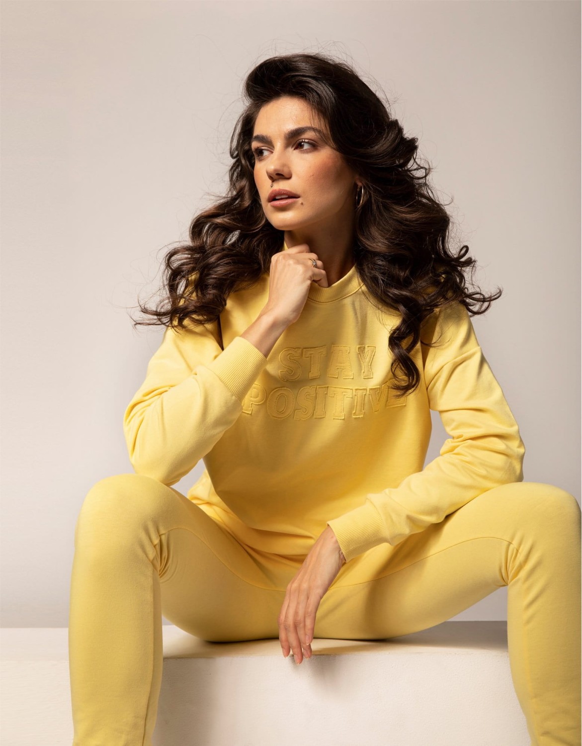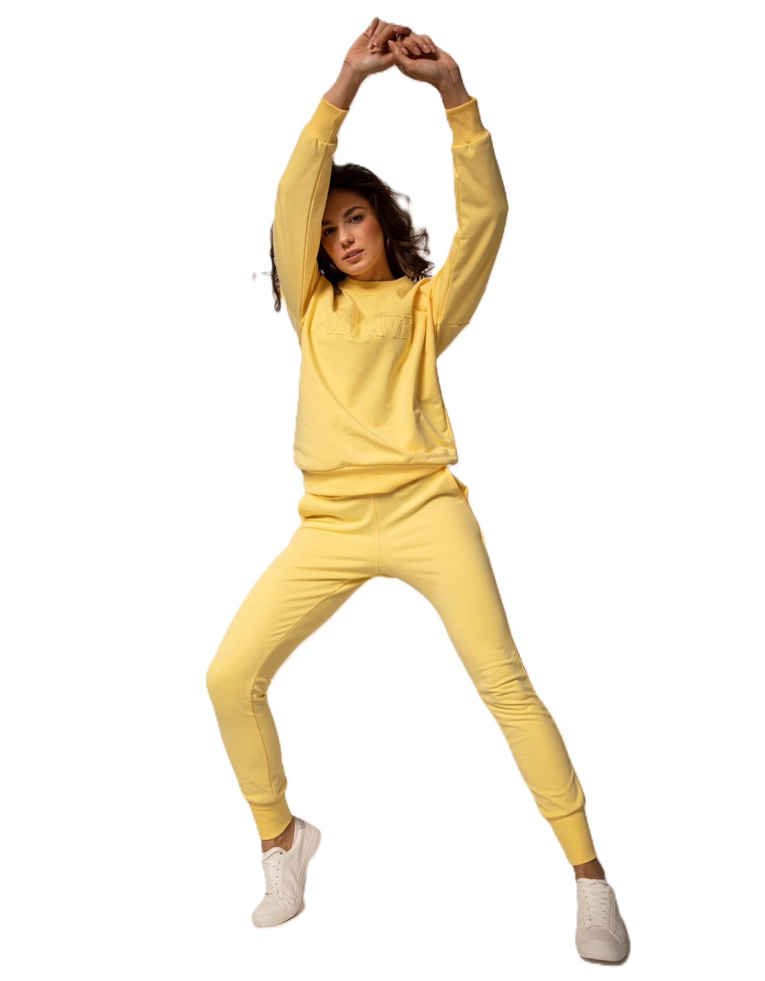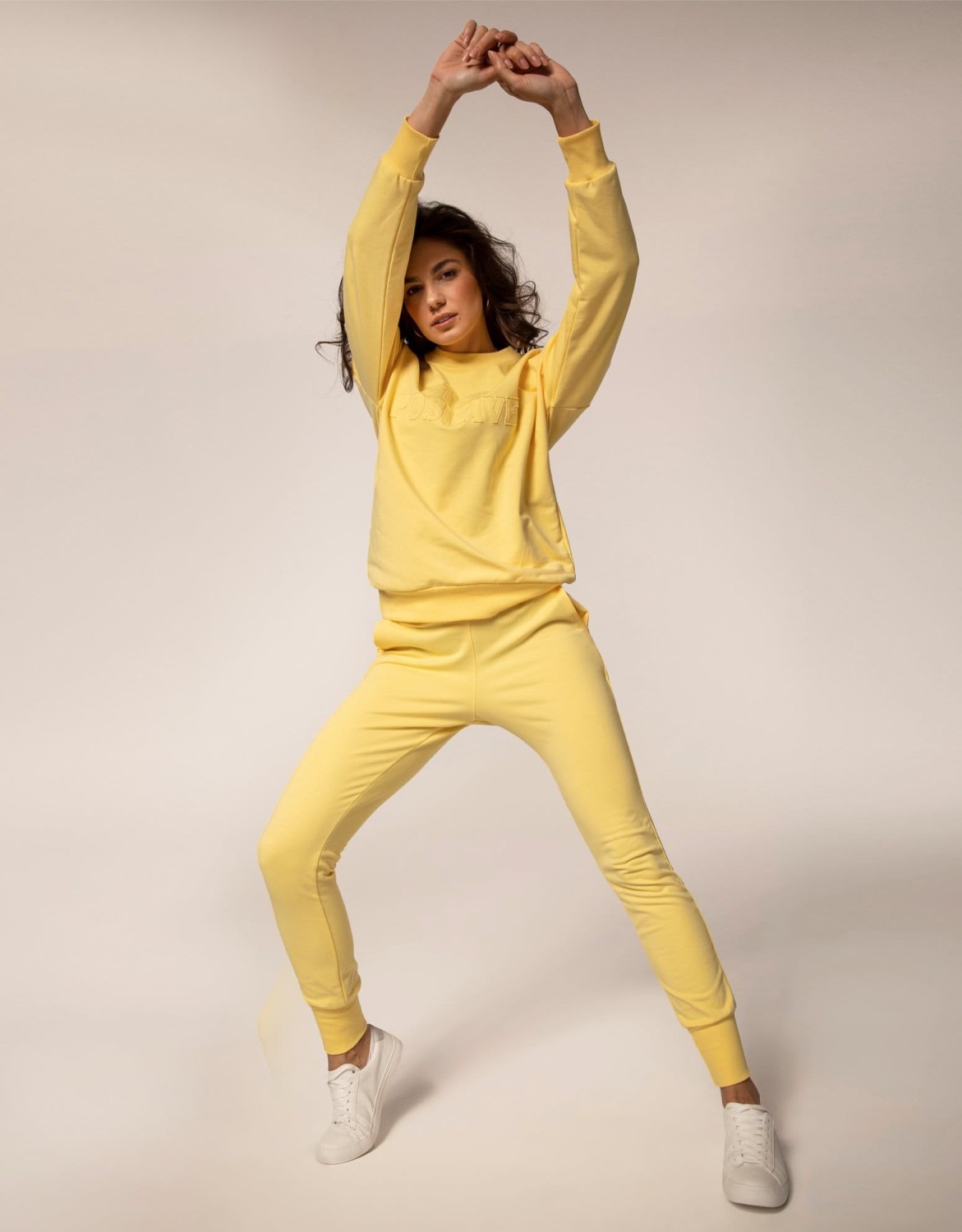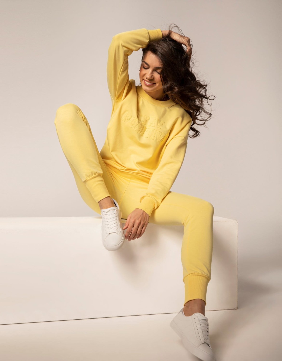 Żółte spodnie dresowe od polskiej marki BOPOCO true stories. Modne spodnie damskie wykonane z wysokiej jakości komfortowej w noszeniu dzianiny dresowej.