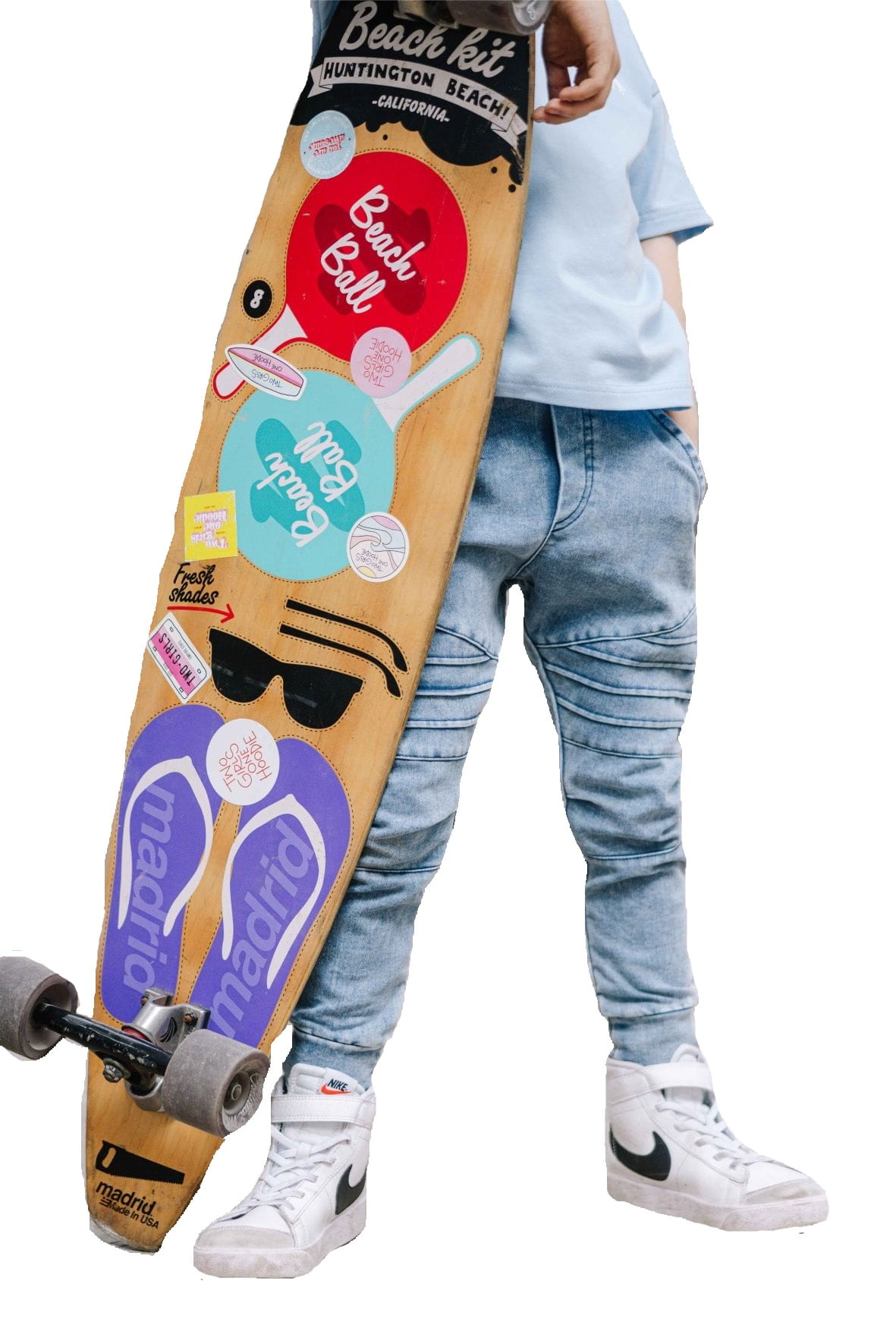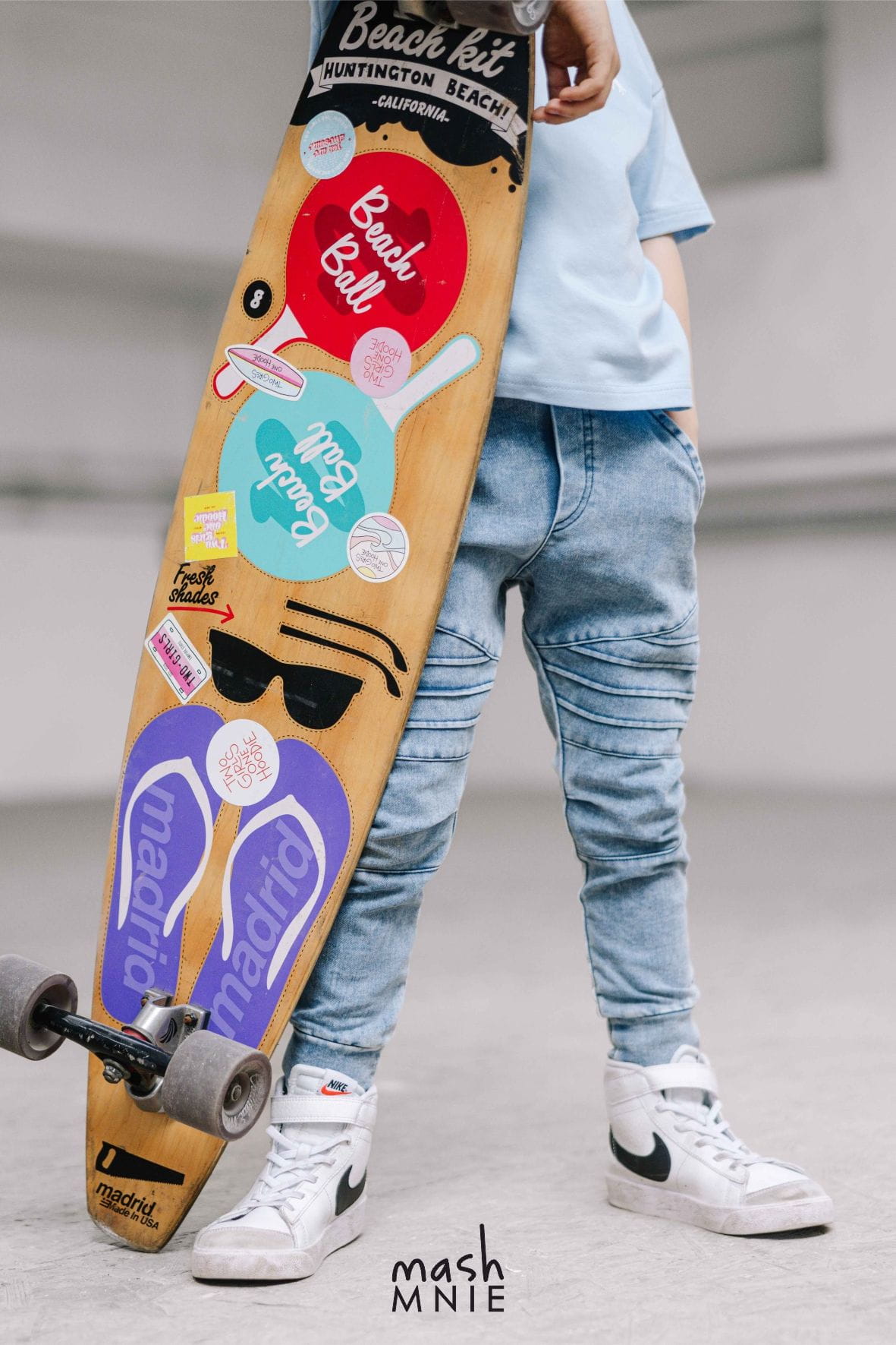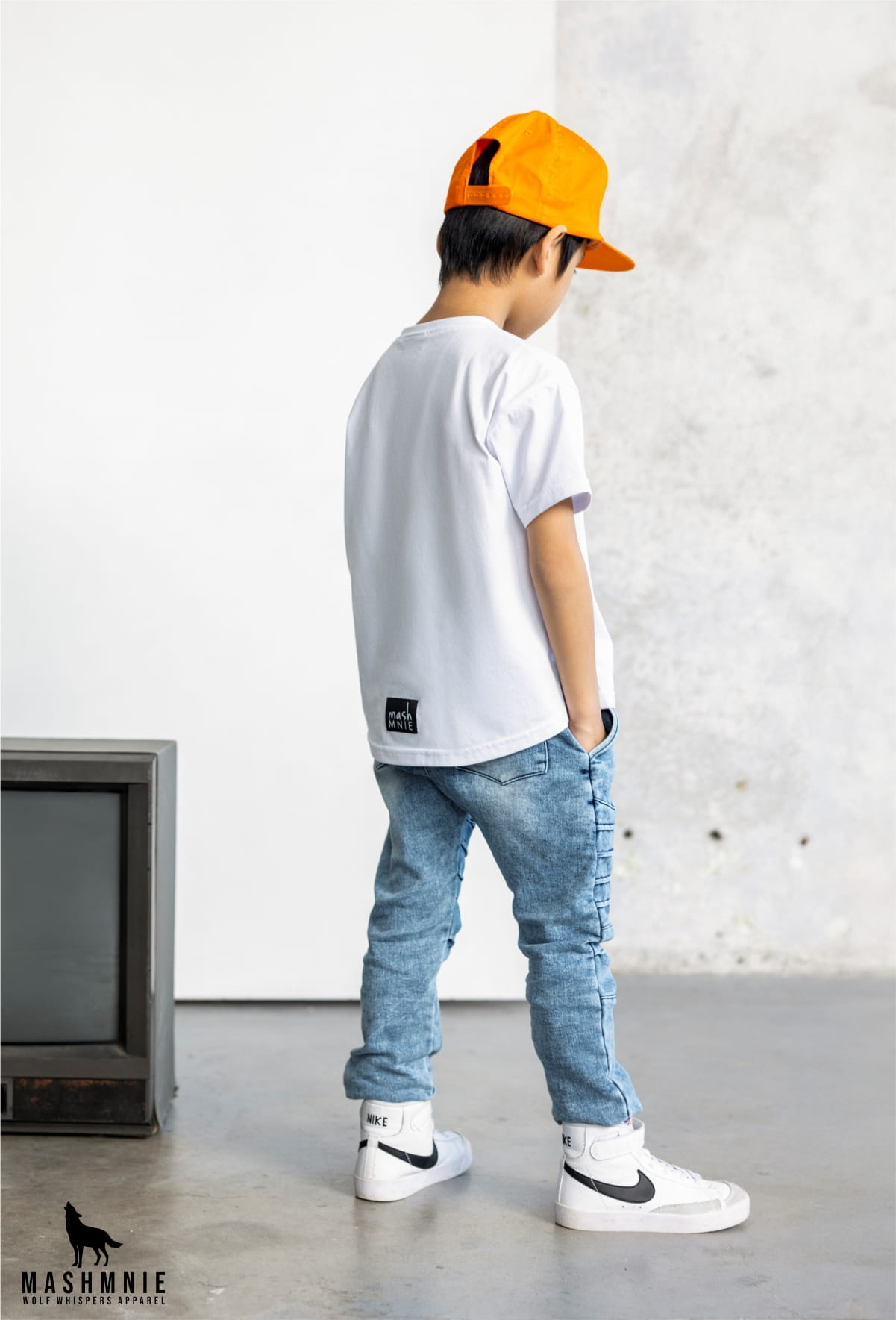 Zjawiskowe spodnie jeansowe od polskiej marki Mash MNIE. Modne jeansy dziecięce powstały z dzianiny dresowej o wyglądzie modnego jeansu, dzięki czemu są miękkie i komfortowe w noszeniu.