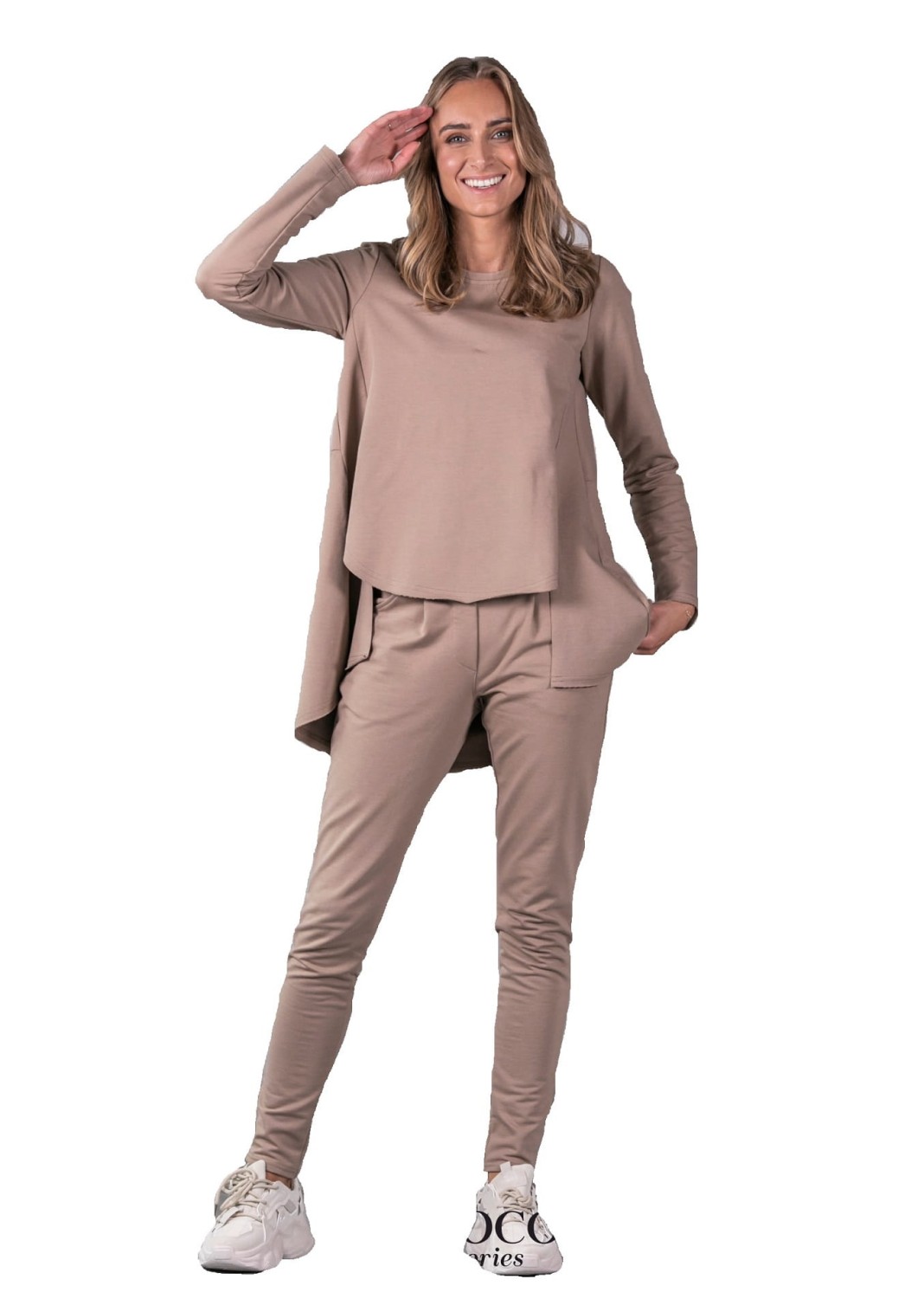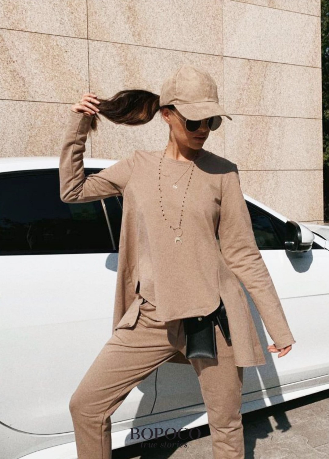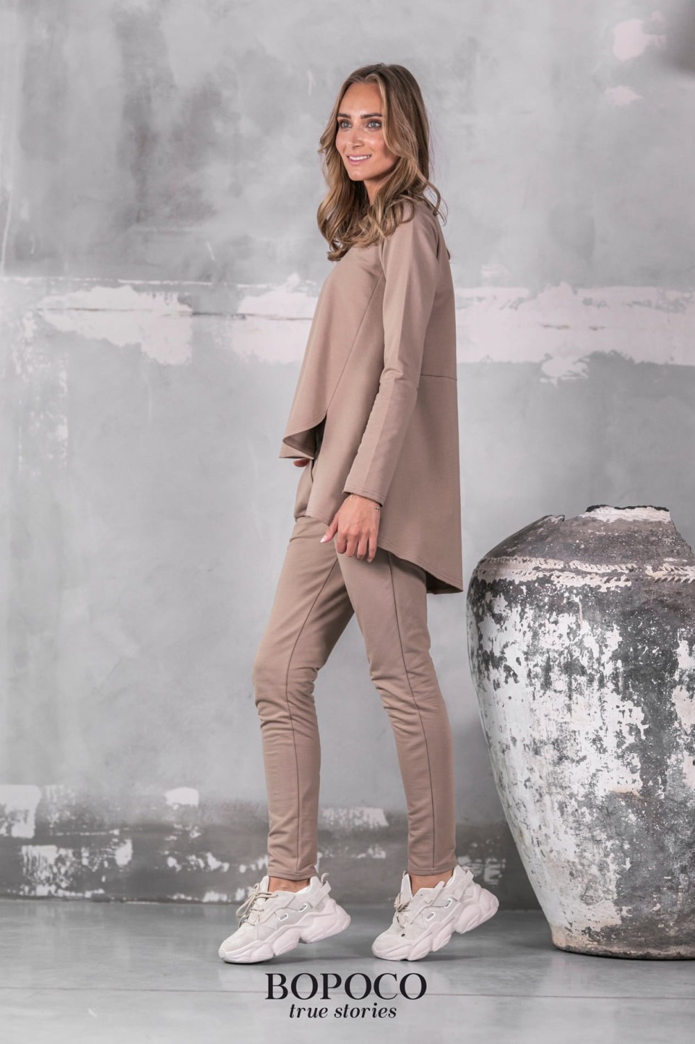 Beżowe spodnie z zakładkami dla fanek sportowej elegancji od polskiej marki BOPOCO true stories. Modne spodnie damskie wykonane z wysokiej jakości, komfortowej w noszeniu dzianiny dresowej.