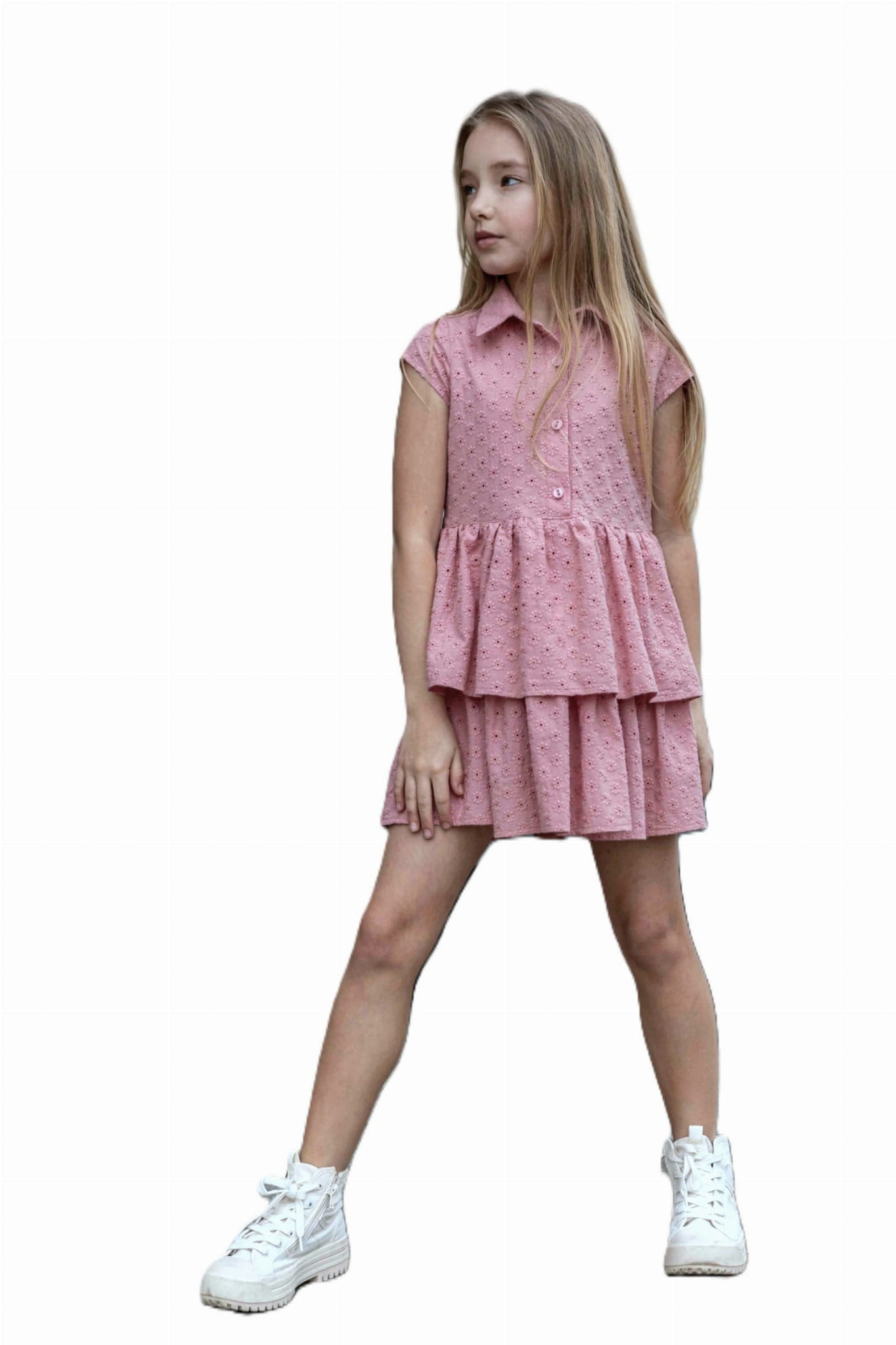 Różowa sukienka ażur to hit wśród letnich sukienek. Modna sukienka dla dziewczynki wykonana w Polsce z wysokiej jakości, komfortowej w noszeniu bawełny 100%, w piękny haftowany wzór z dziurkami.