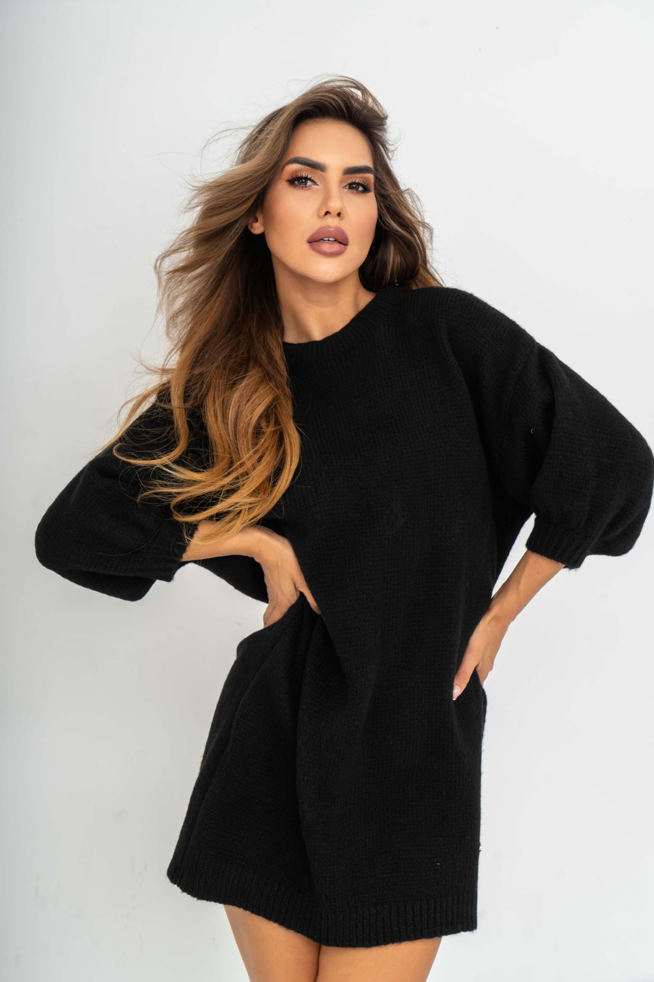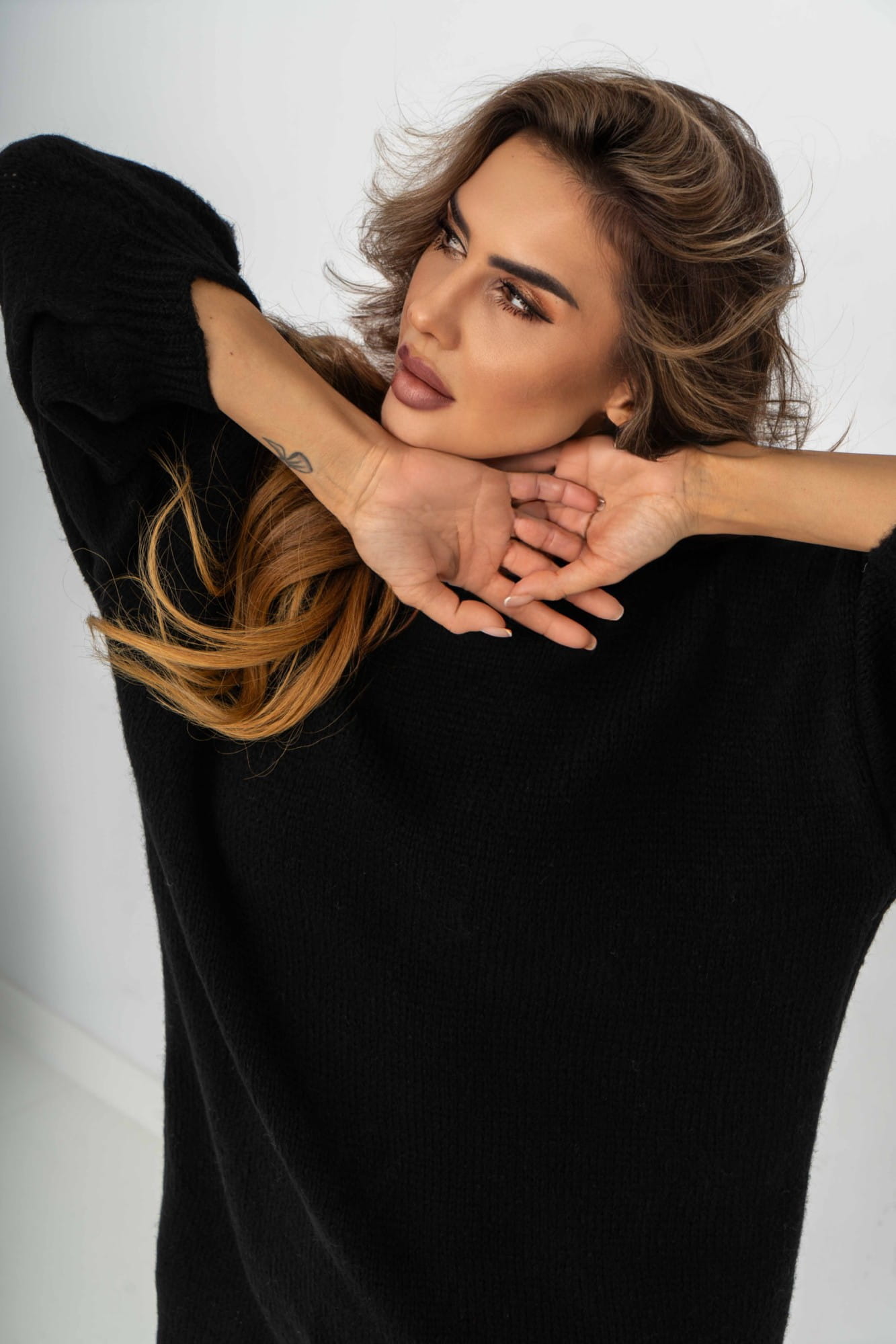 Czarna sukienka sweterkowa świetnie sprawdzi się noszona solo lub z ulubionym paskiem w zestawieniu z kozakami, workerami lub botkami...