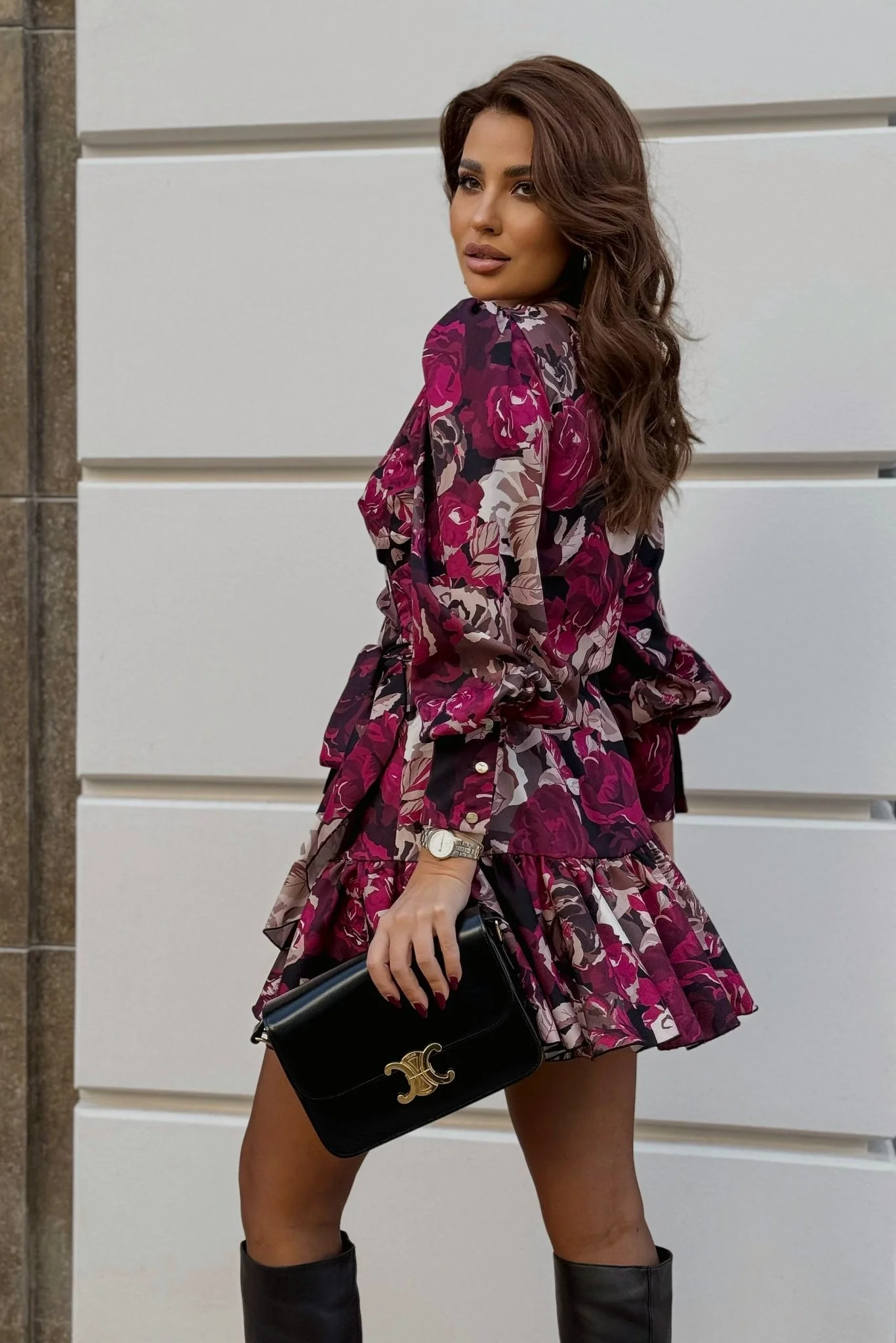 Jej wyjątkowy wzór w kwiaty ożywi każdą stylizację, a długie rękawy z mankietem zapinanym na subtelne złote guziki dodają całości szyku i elegancji. Kopertowy dekolt w kształcie litery "V" podkreśla kobiecą linię szyi, natomiast wiązany pasek w talii pozwala na indywidualne dopasowanie, eksponując atuty sylwetki. Falbana u dołu sukienki wprowadza lekkość i romantyzm, sprawiając, że jest idealnym wyborem na wiele okazji – od spotkań biznesowych po wieczorne wyjścia.