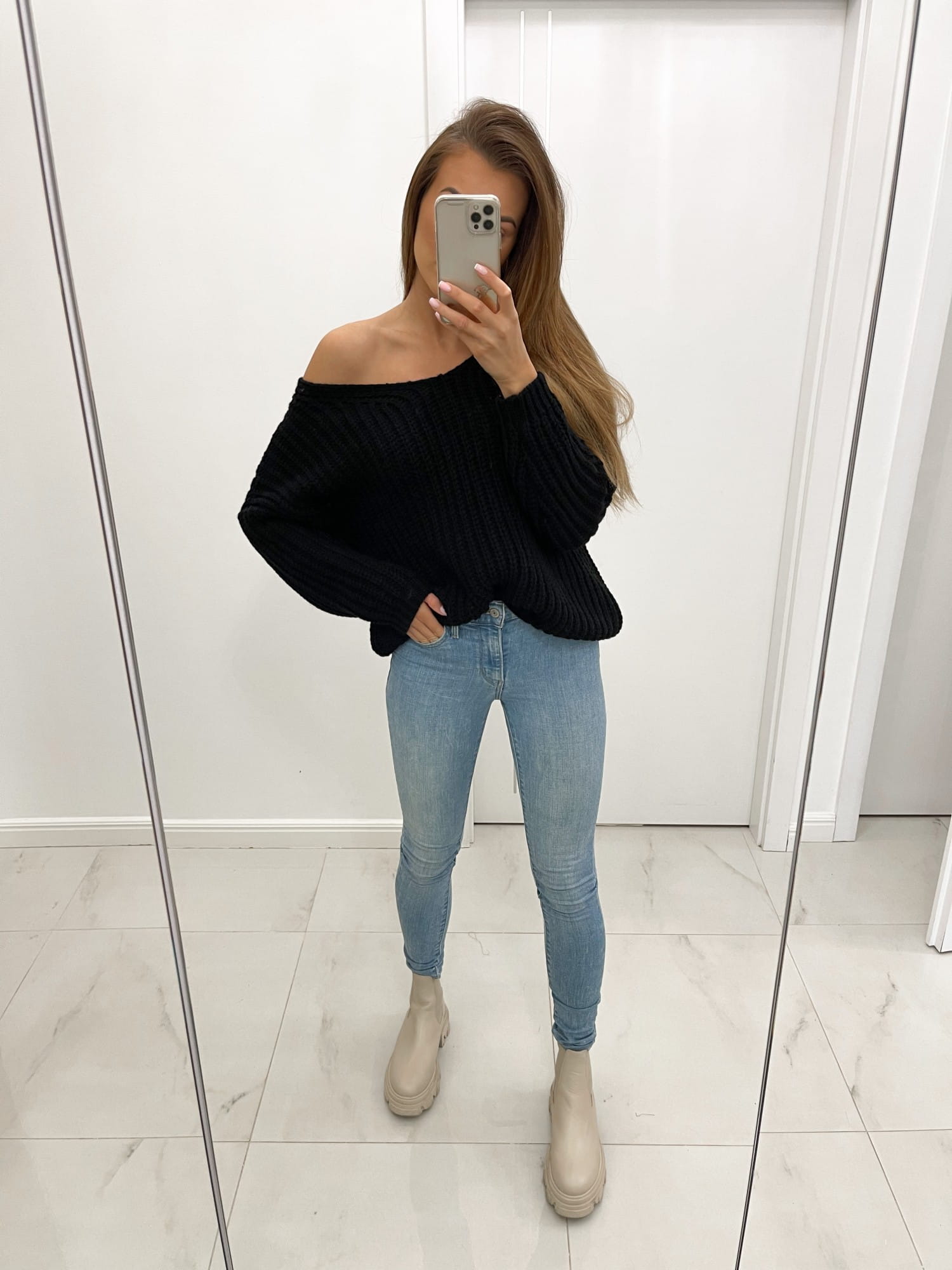 Czarny sweter z dekoltem V od polskiego producenta TMC Moda. Luźny sweter damski zawiera w składzie dodatek wełny, dzięki czemu jest ciepły, a zarazem miękki i miły w dotyku.