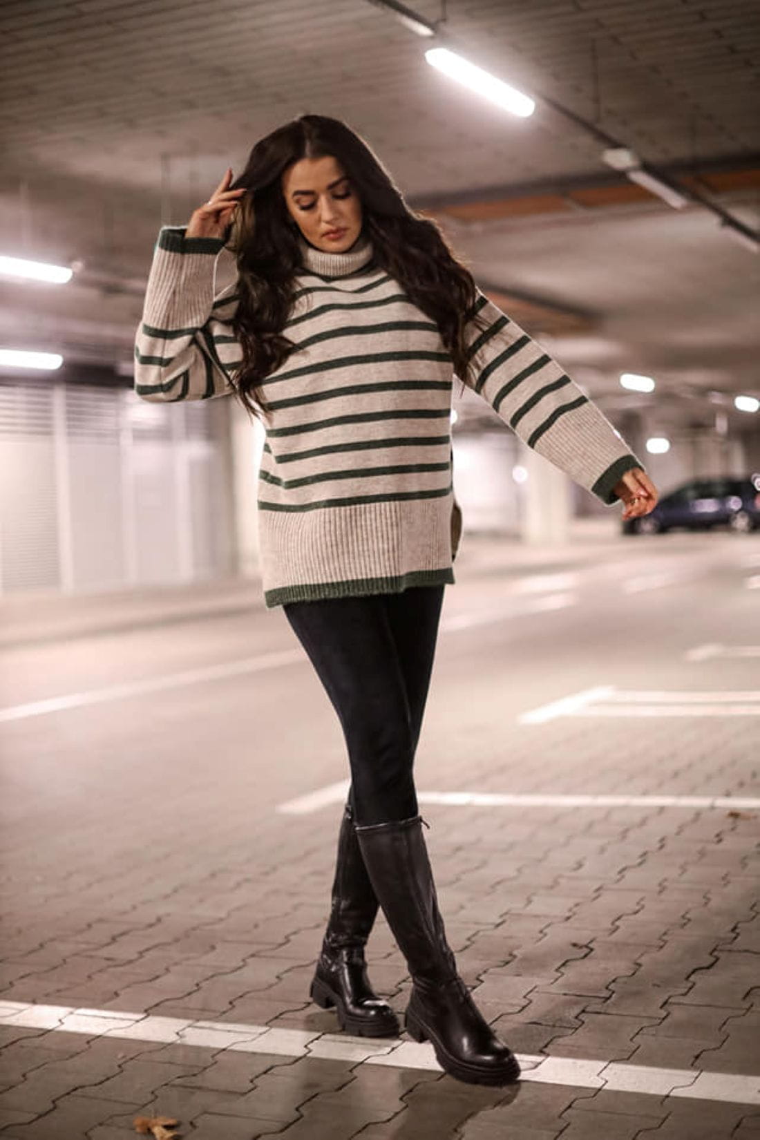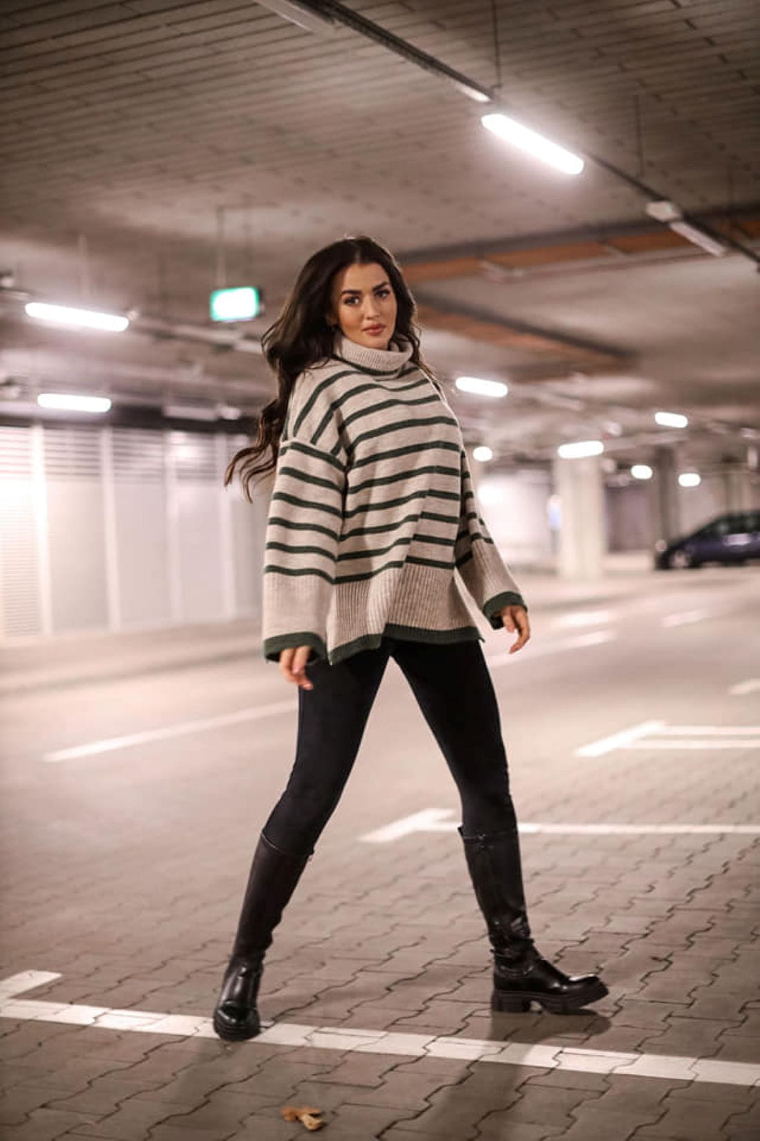Beżowy sweter w zielone paski od polskiej marki Me Gusta. Modny sweter damski posiada w składzie wełnę, dzięki czemu jest ciepły i miękki w dotyku.