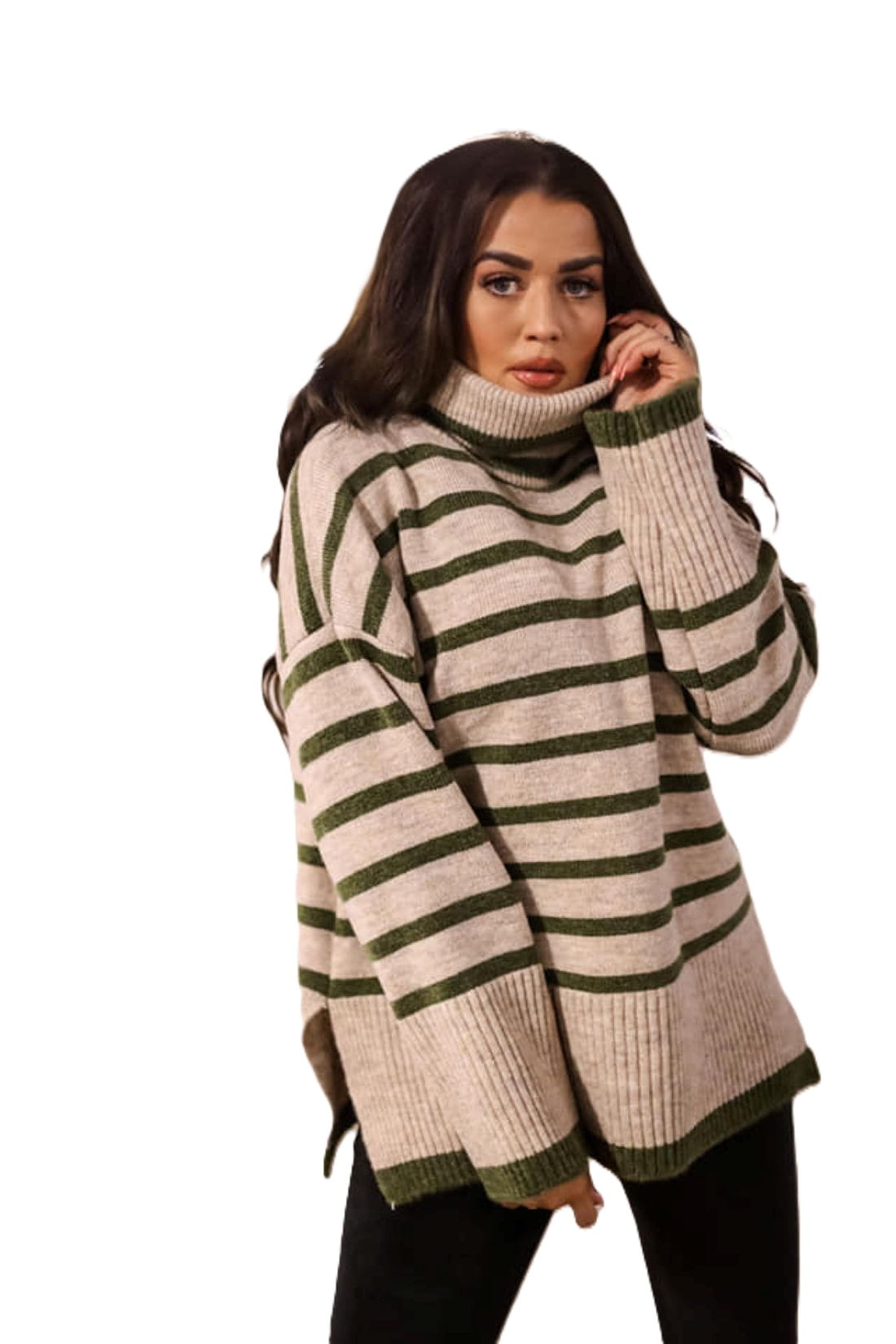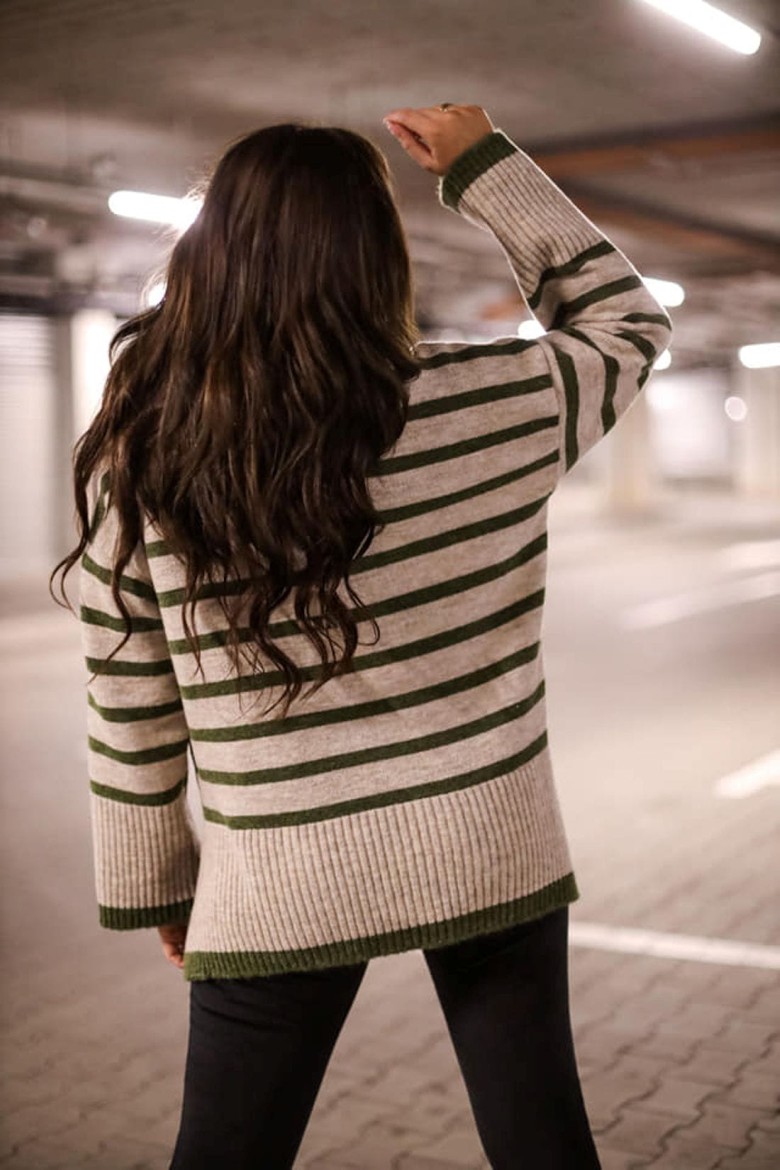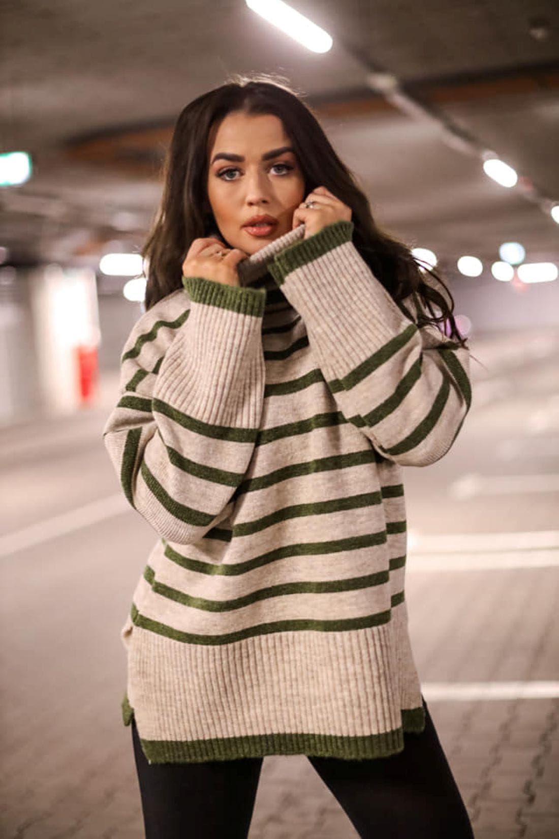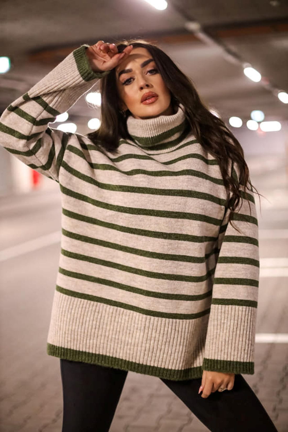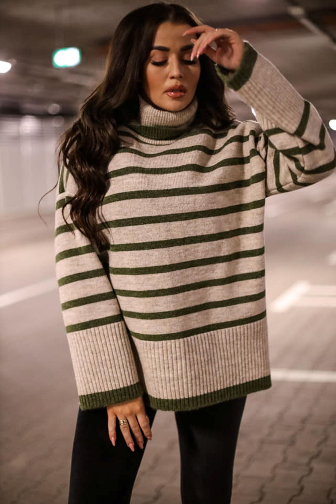 Sweter damski oversize golf paski beżowy khaki Me Gusta