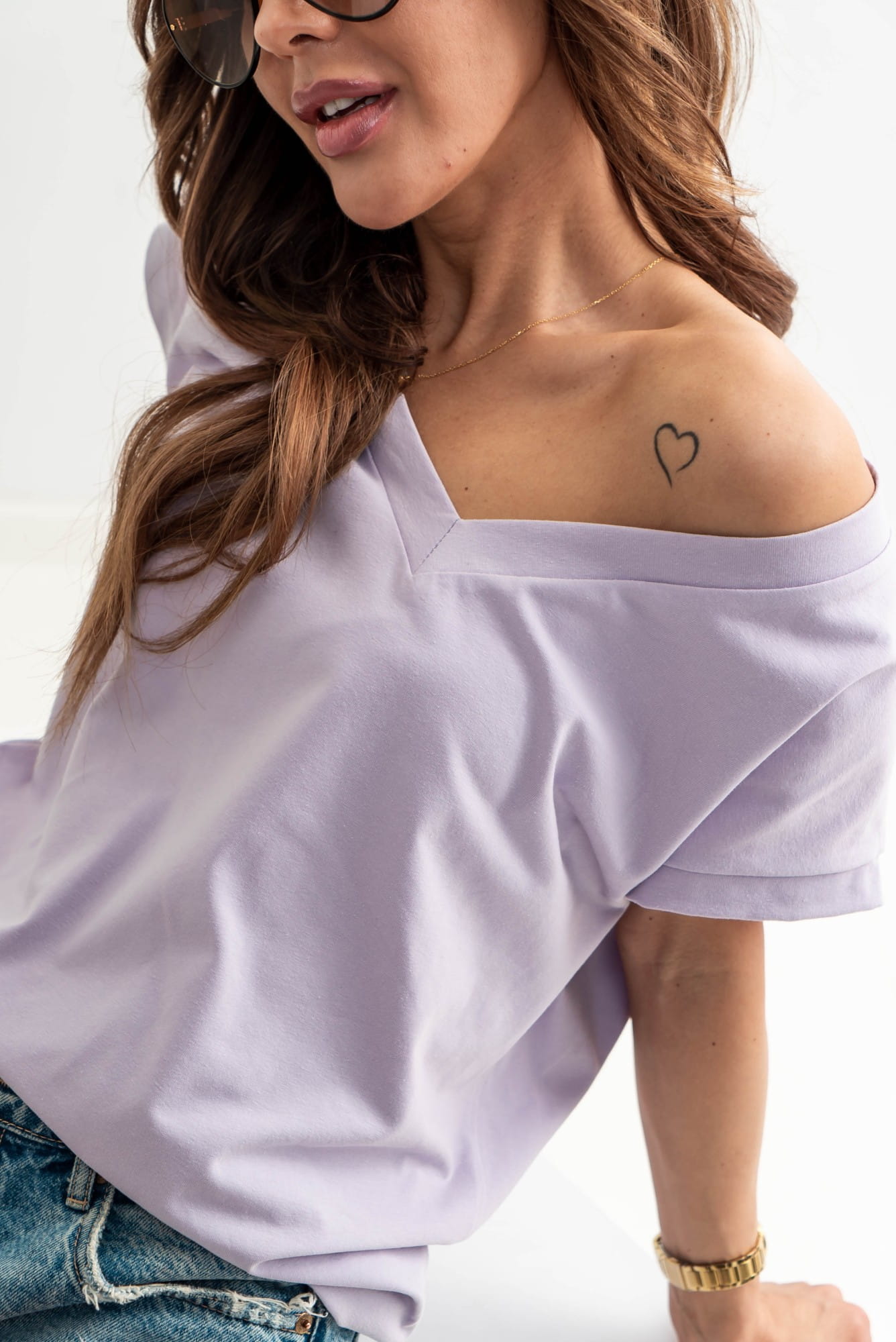 Fioletowy t-shirt V-neck to podstawa każdej kobiecej garderoby. Bluzka z dekoltem V powstała w Polsce przez markę Top Moda Collection z komfortowej w noszeniu, gładkiej dzianiny.