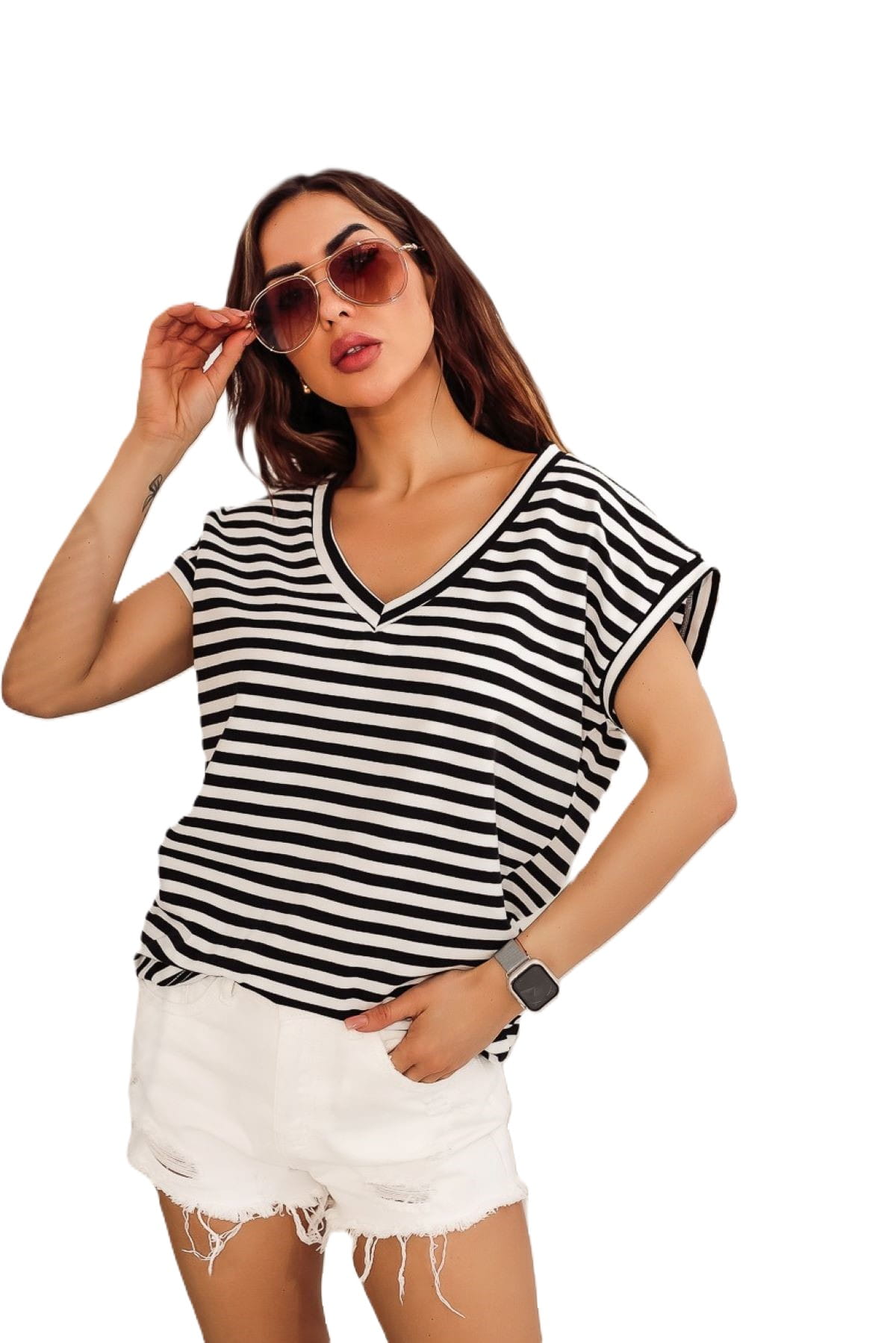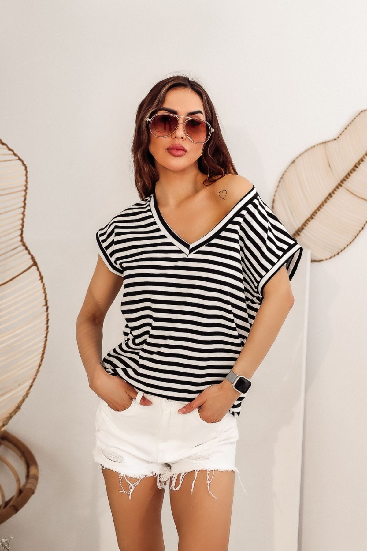 T-shirt V neck paski biały czarny TMC Moda