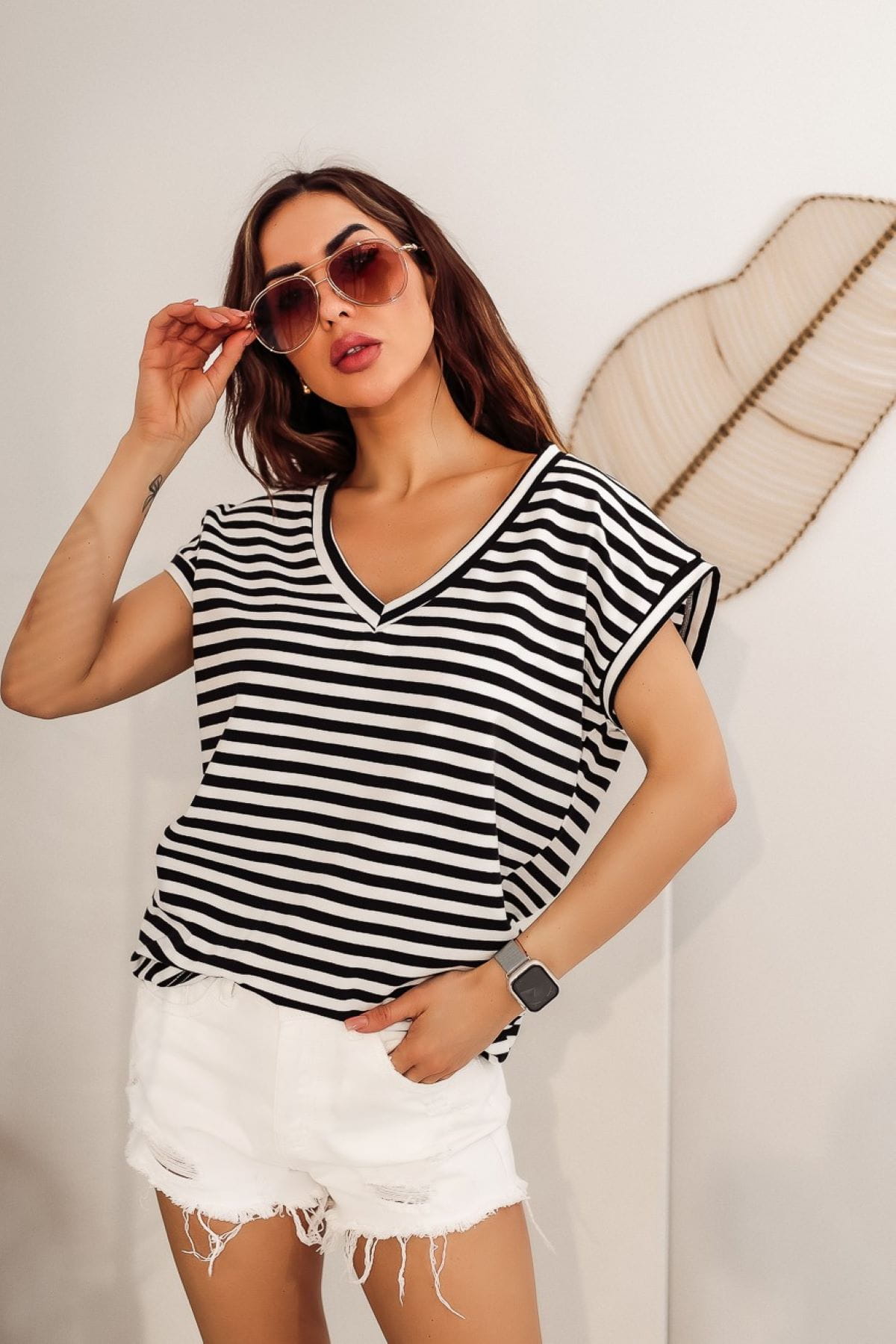 Szukasz idealnego t-shirtu na nadchodzące ciepłe dni? Oto coś dla Ciebie! Nasz damski t-shirt wykonany jest z wysokiej jakości bawełny, która zapewnia komfort noszenia przez cały dzień. Ponadczasowy wzór w paski nadaje mu świeży i letni look, idealny na spacer po plaży czy spotkanie ze znajomymi.