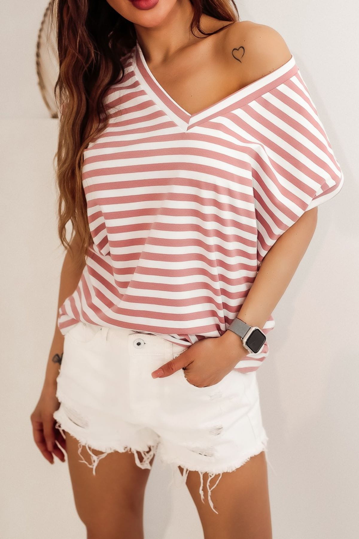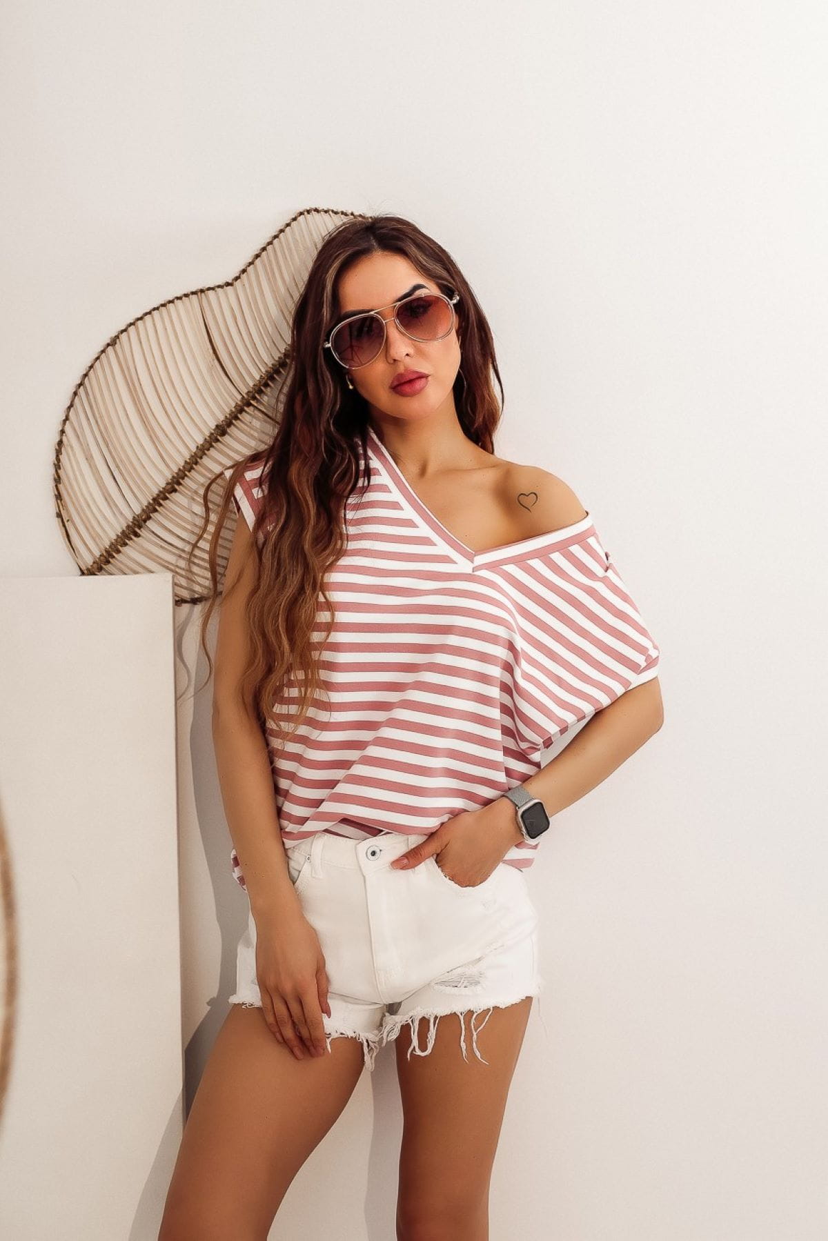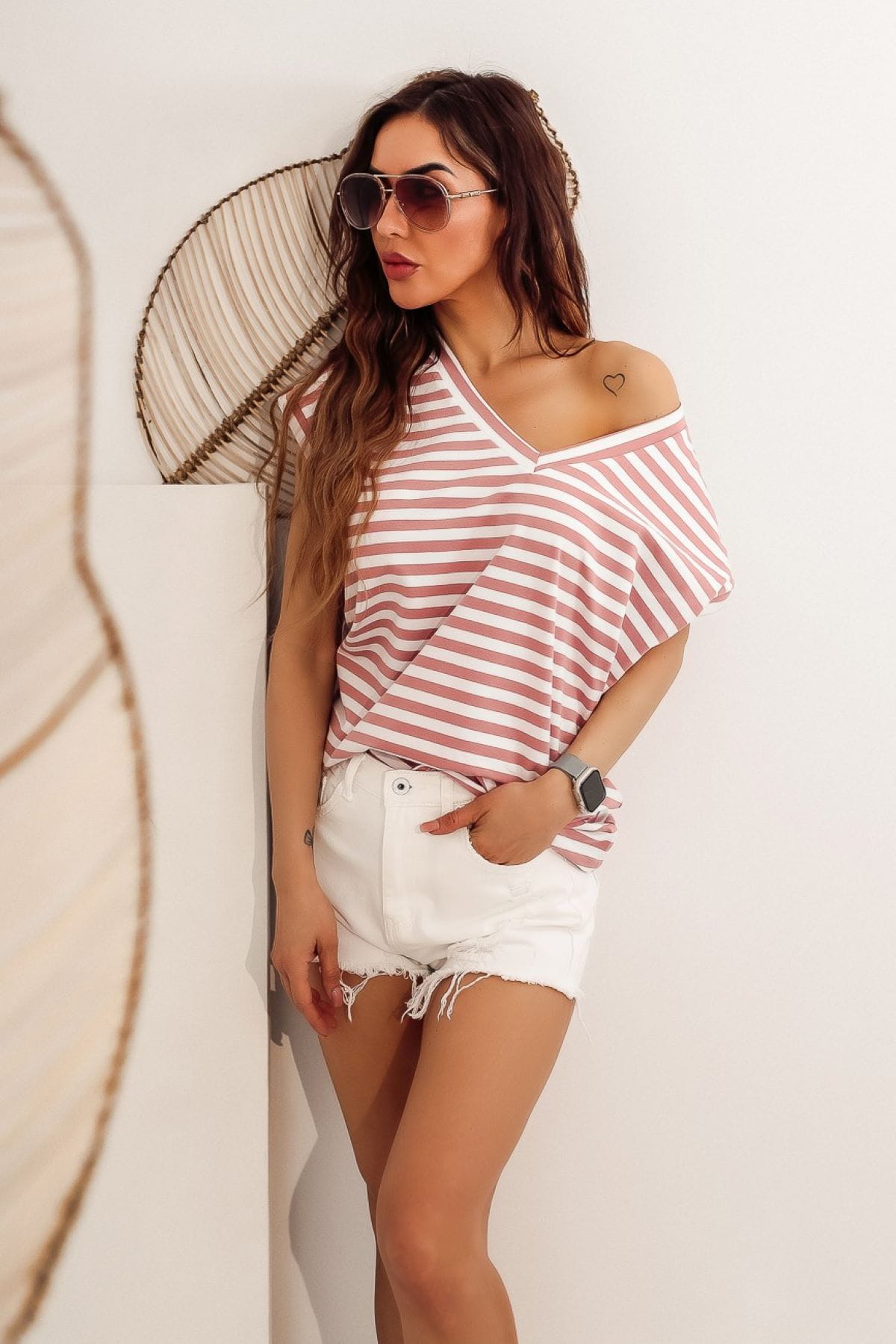 Szukasz idealnego t-shirtu na nadchodzące ciepłe dni? Oto coś dla Ciebie! Nasz damski t-shirt wykonany jest z wysokiej jakości bawełny, która zapewnia komfort noszenia przez cały dzień. Ponadczasowy wzór w paski nadaje mu świeży i letni look, idealny na spacer po plaży czy spotkanie ze znajomymi.