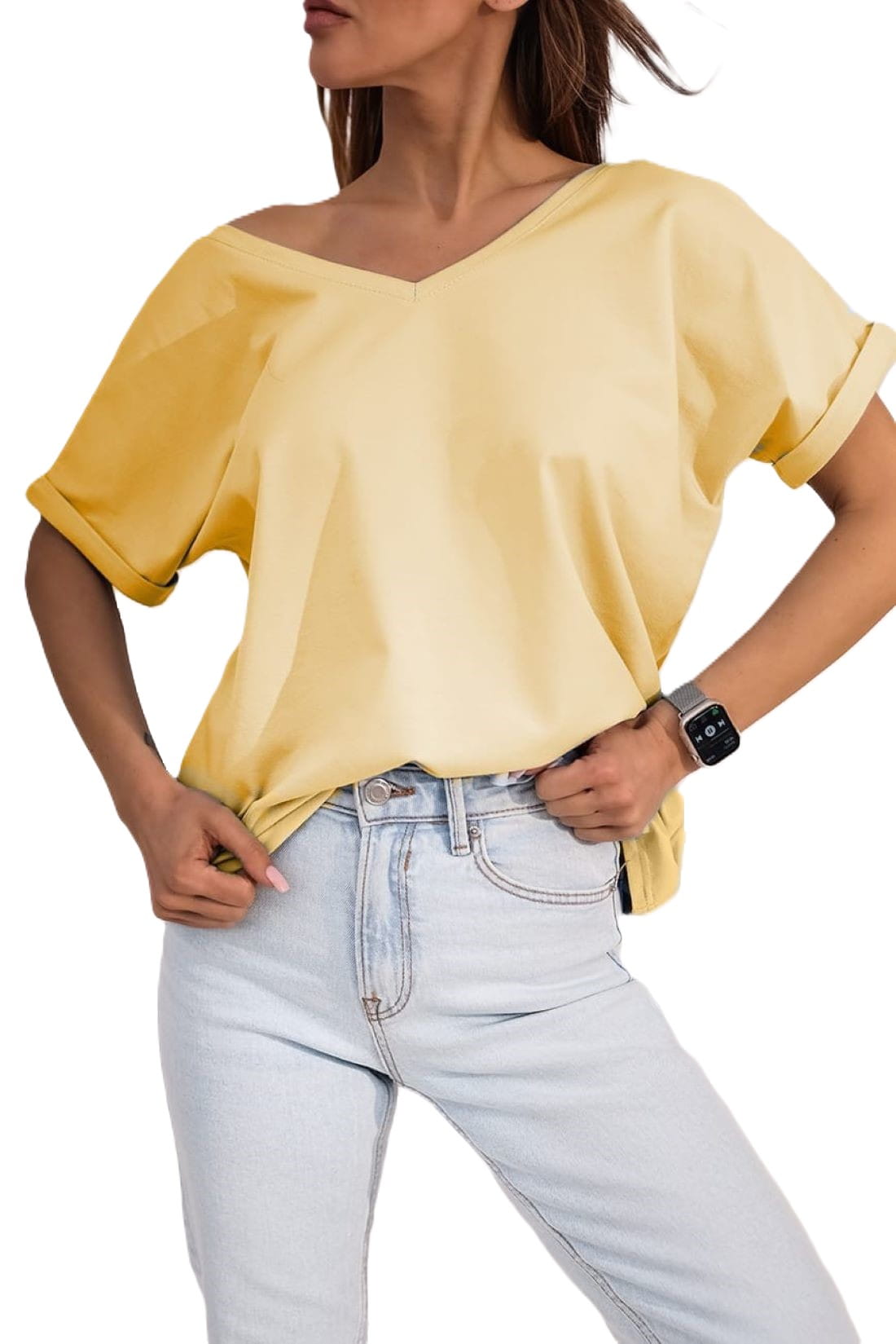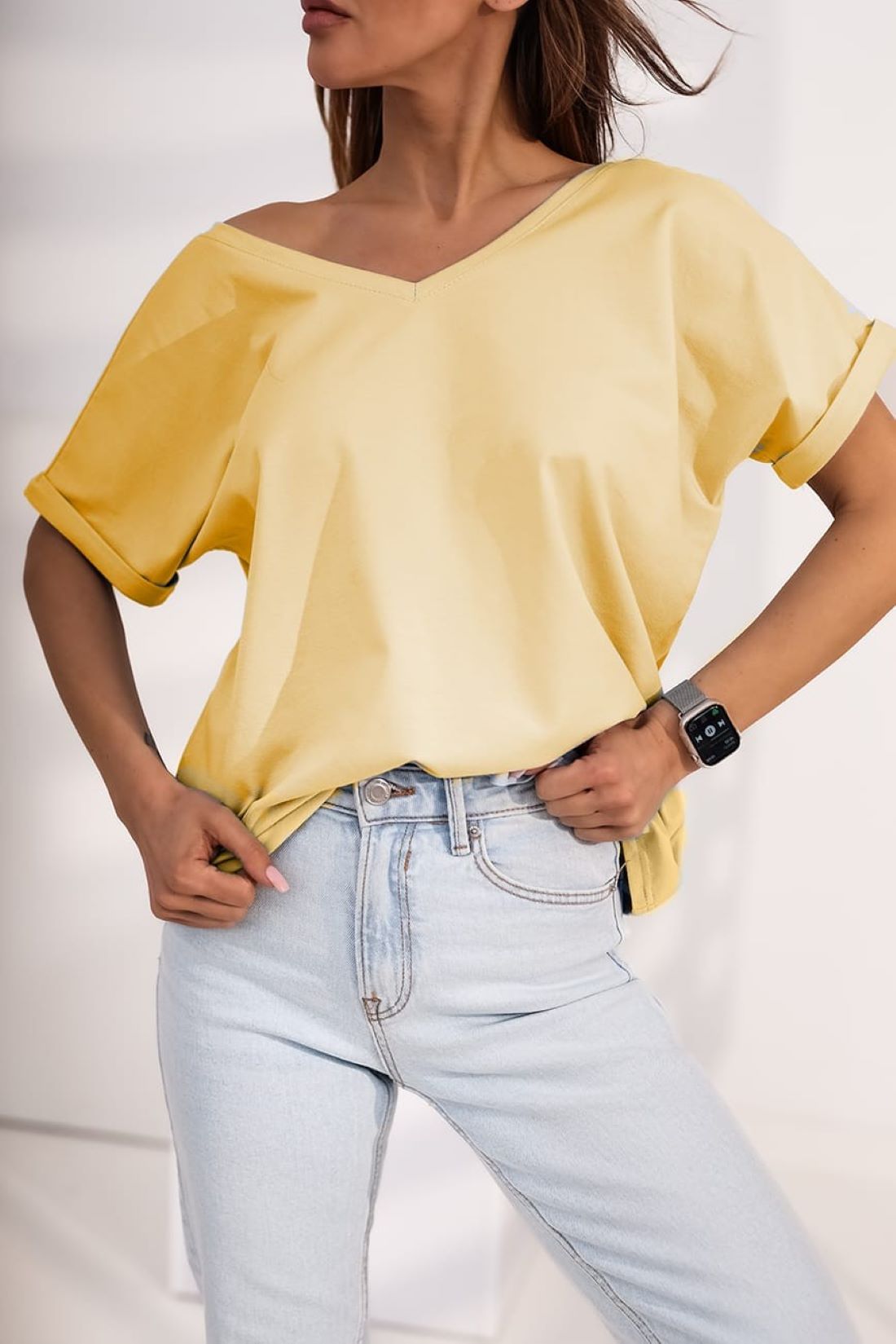 Luźny t-shirt V neck będzie doskonałym uzupełnieniem letniej garderoby, dodając jej niepowtarzalnego uroku.