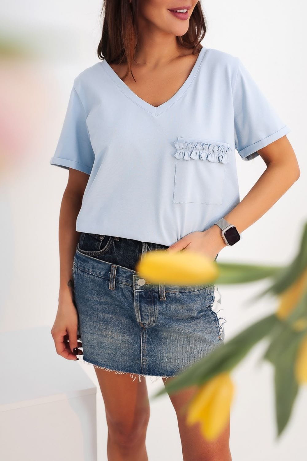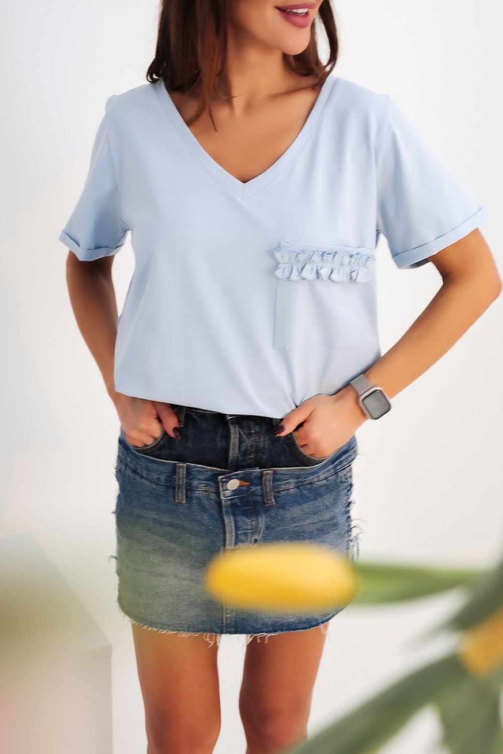 Niebieski t-shirt z dekoltem w serek i kieszonką to idealna propozycja na letnie dni. Wykonany przez polskiego producenta z miękkiej bawełny co sprawia., że jest miękki, przyjemny w dotyku i zapewnia komfort noszenia.