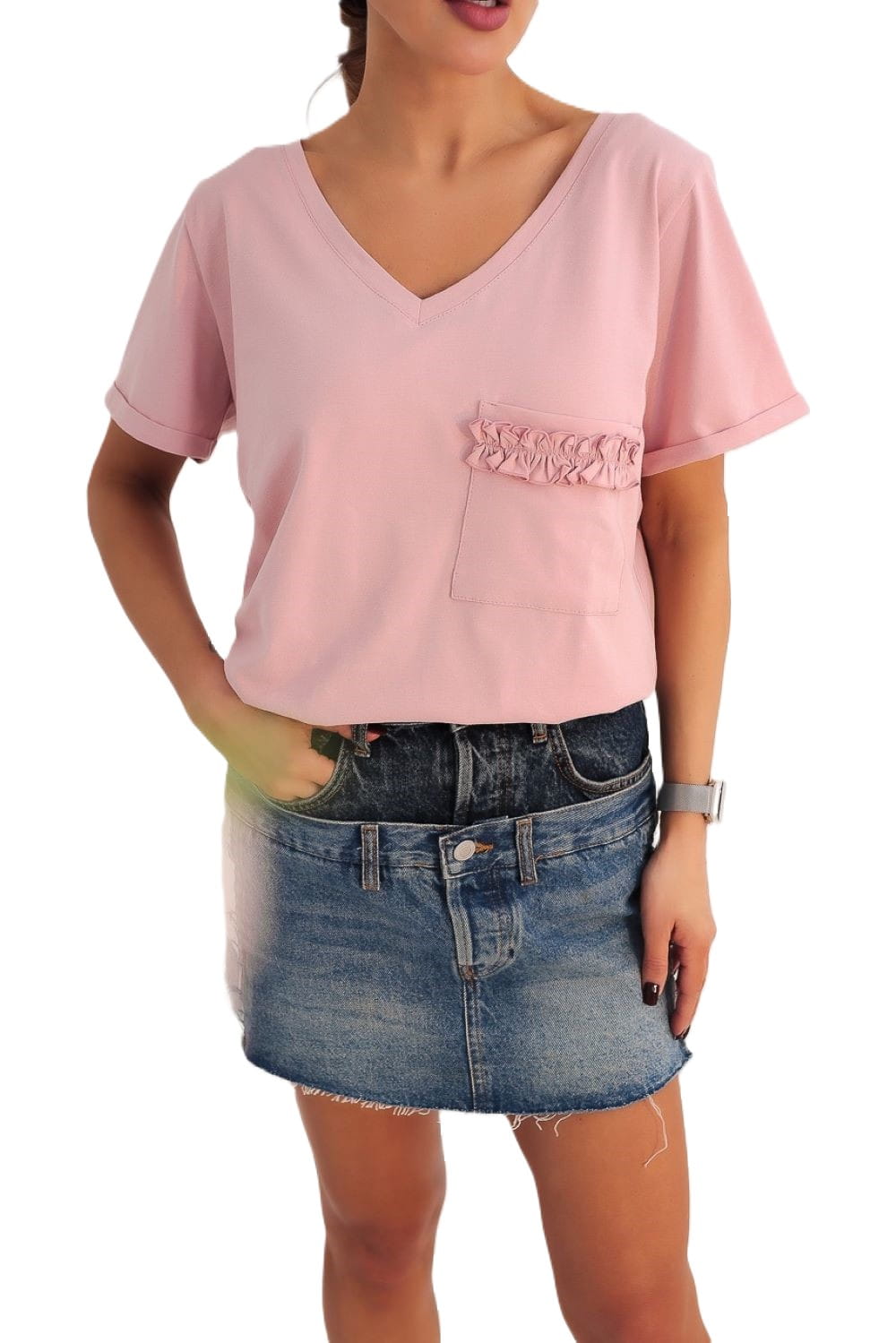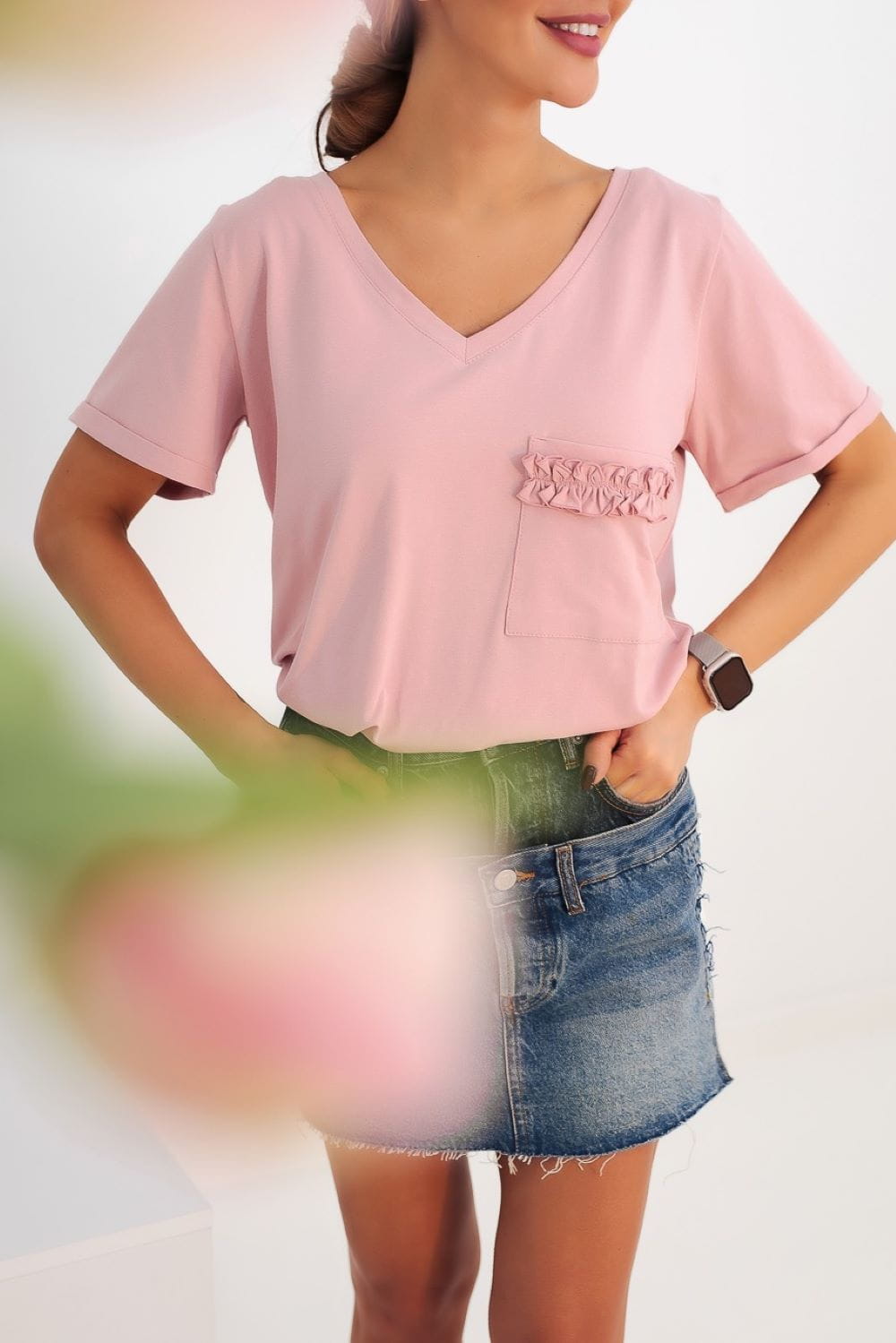 T-shirt V neck z kieszonką różowy pudrowy Tmc Moda