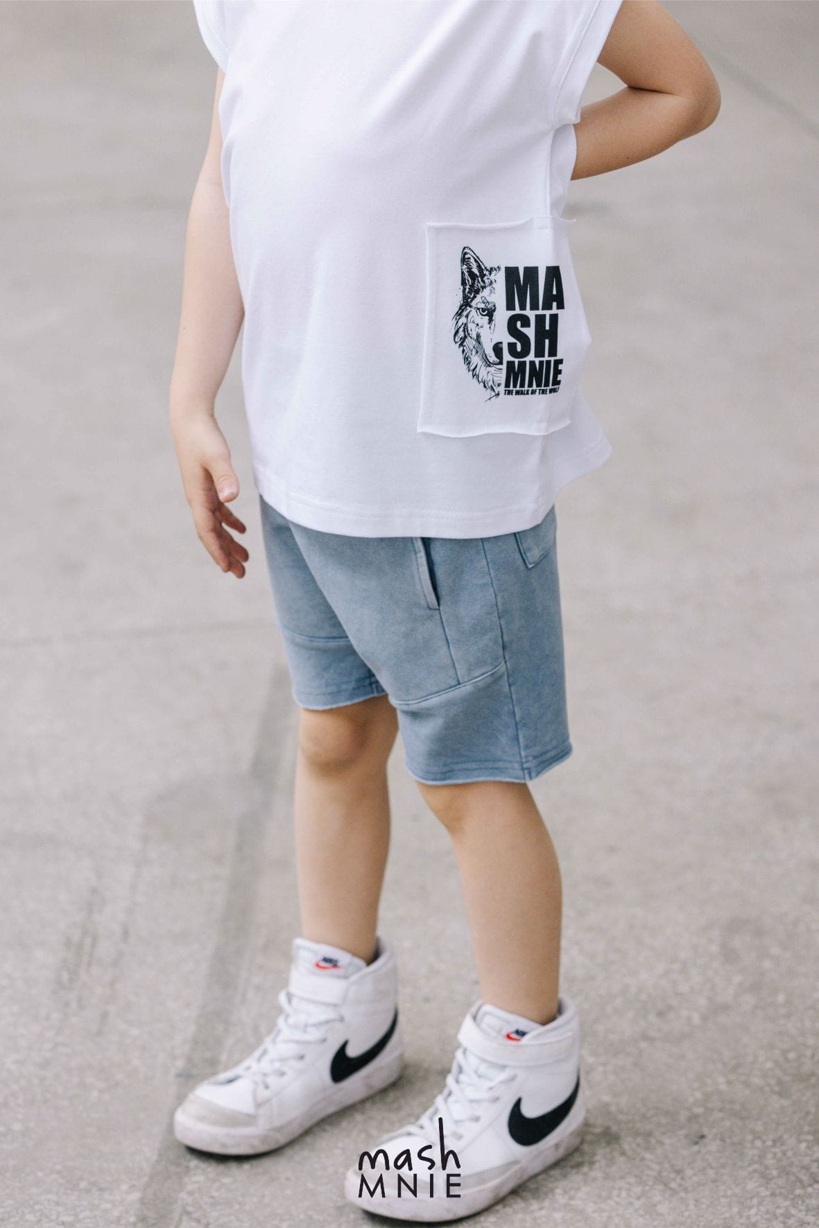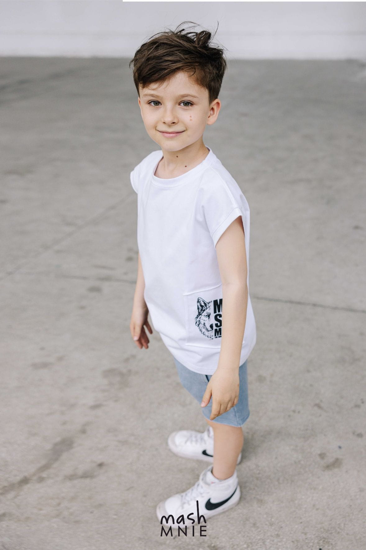 Biały t-shirt z wilkiem zaprojektowany został dla dziewczynki i dla chłopca.