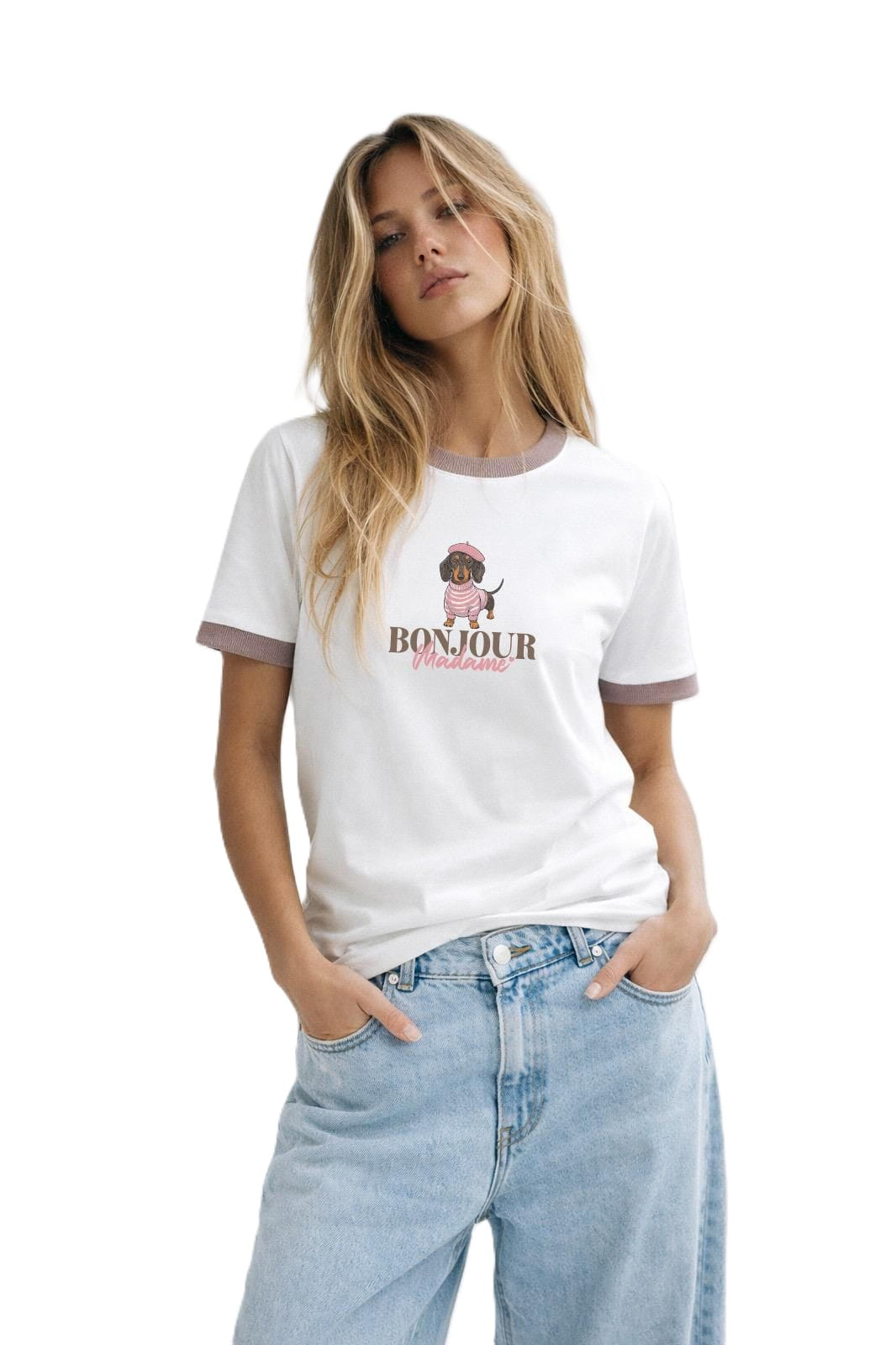 - Stylowy nadruk z uroczym pieskiem i napisem Bonjour Madame