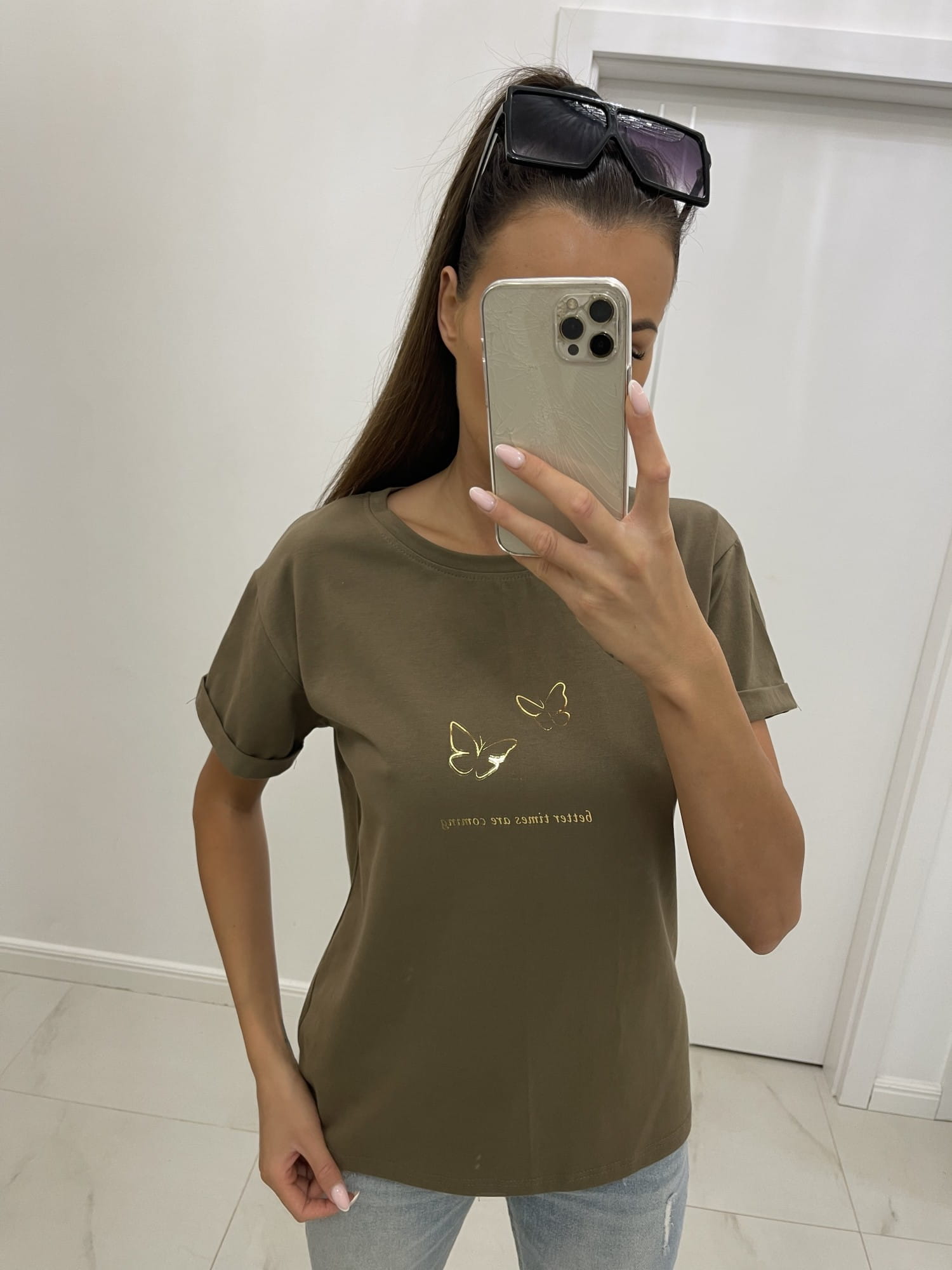 Bawełniany t-shirt khaki świetnie sprawdzi się do wielu różnych stylizacji. Zarówno solo jak i pod kardigan marynarkę lub kurtkę stworzy ciekawy look...