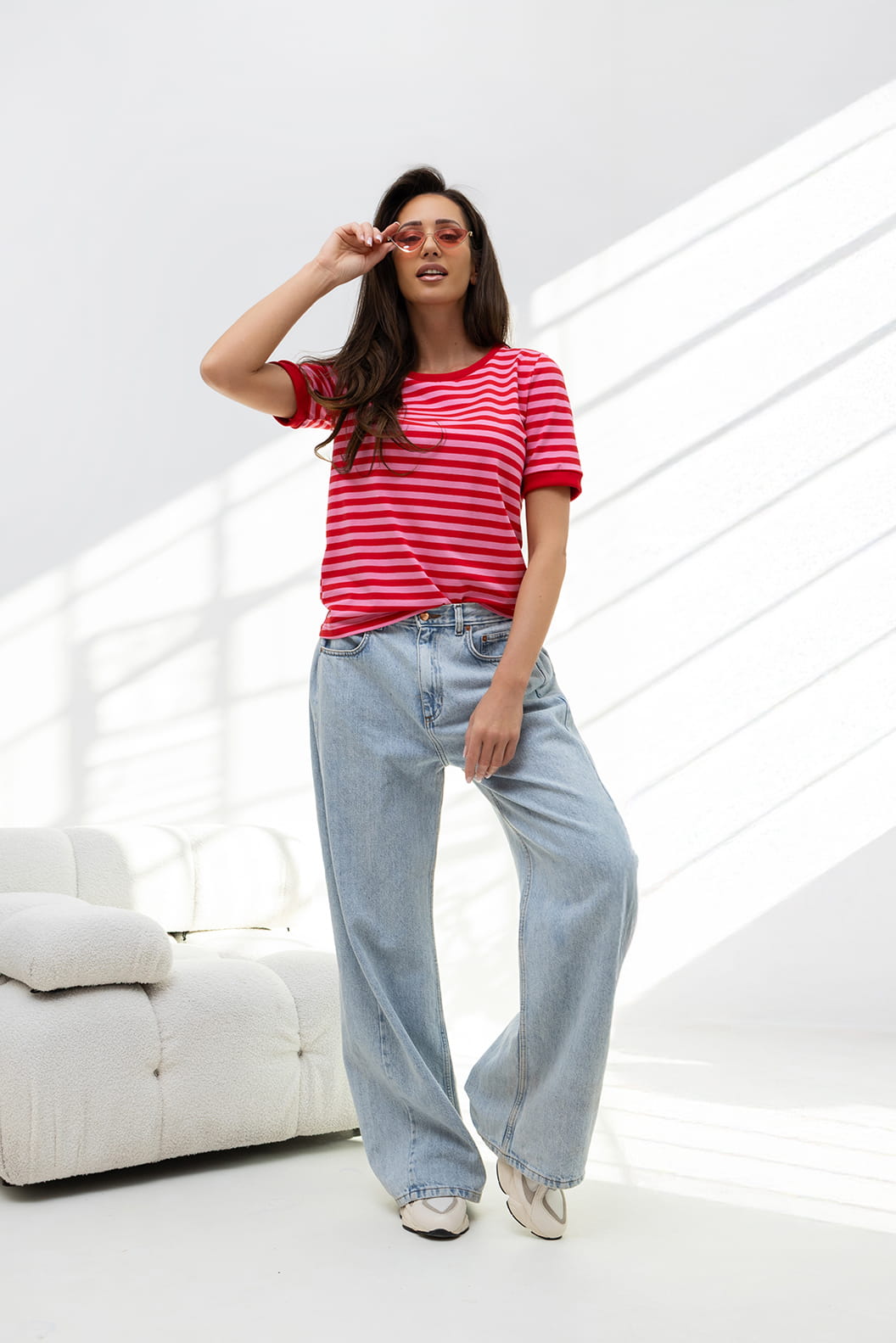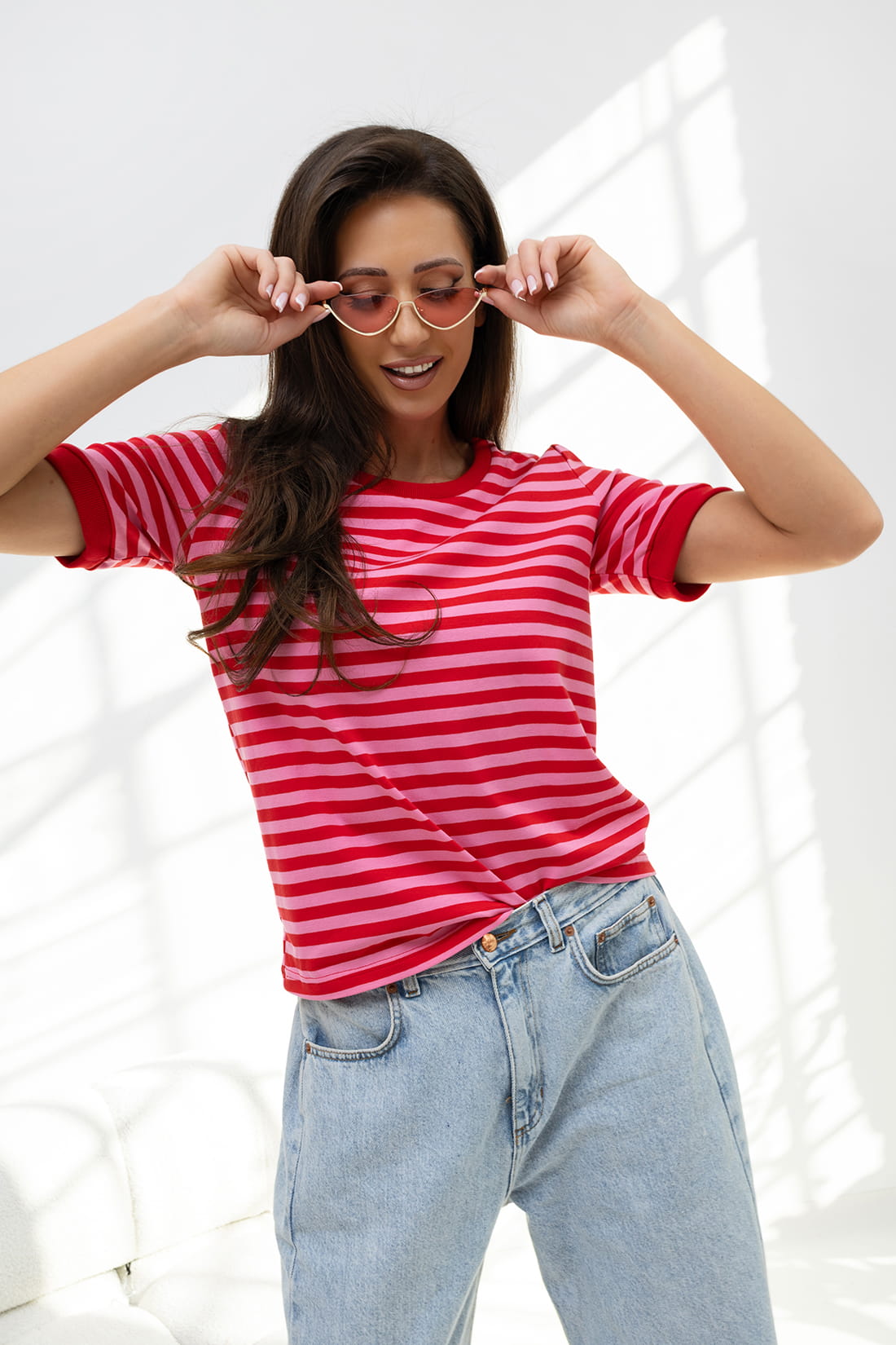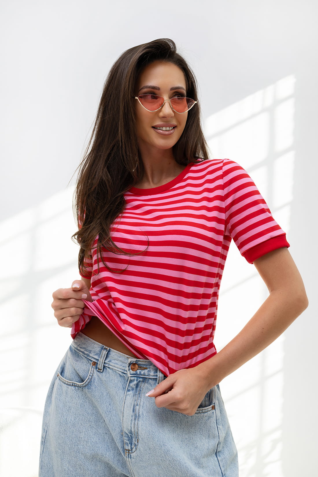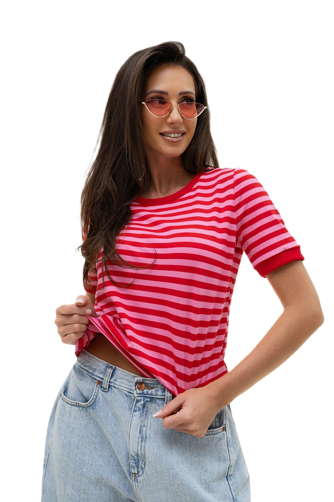T-shirt Damski Bopoco w Paski Czerwono-Różowy Modna Bluzka Casual Basic