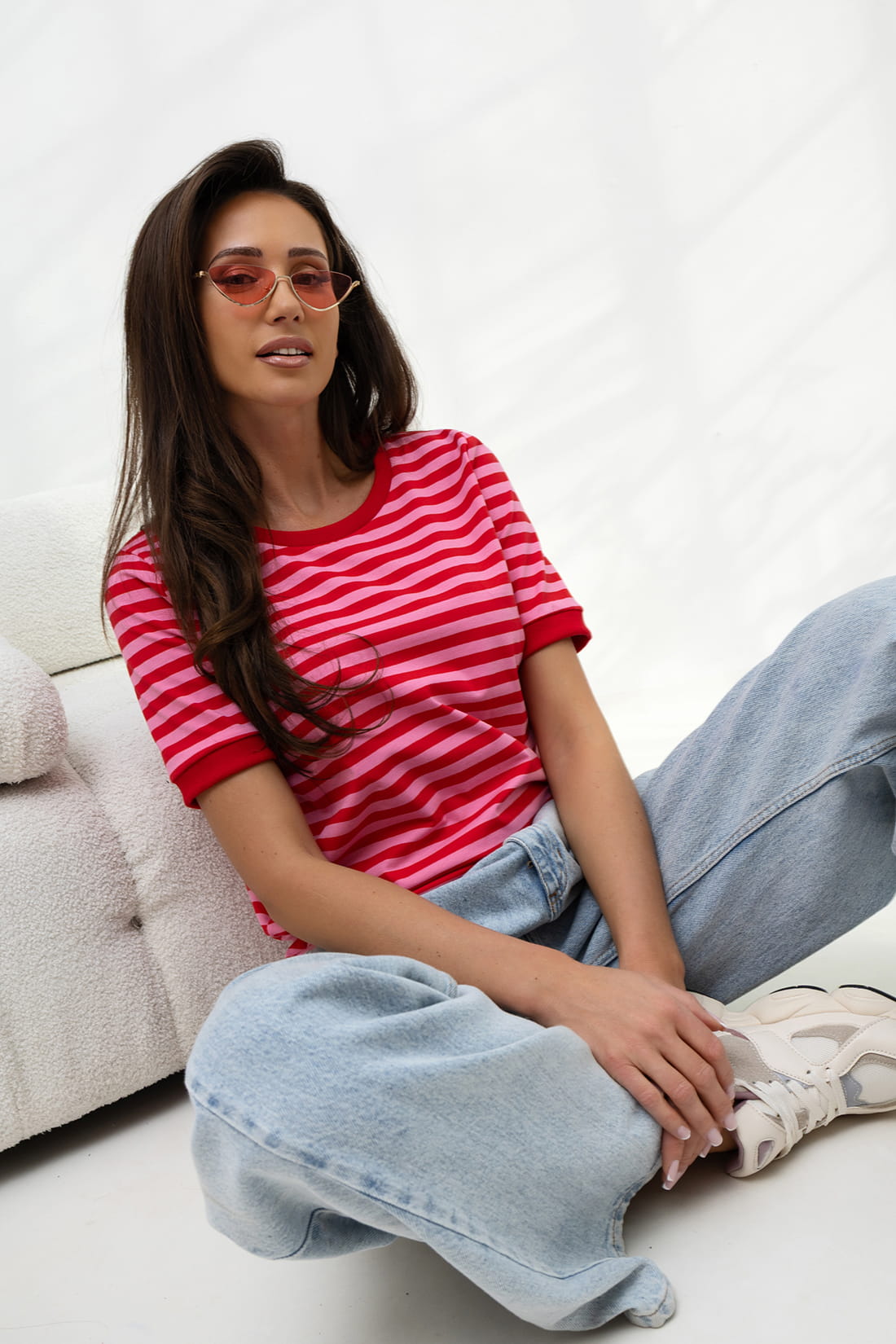 Jeśli szukasz wygodnej, a jednocześnie modnej koszulki na co dzień, to ten t-shirt damski marki Bopoco będzie idealnym wyborem. Klasyczny fason połączony z modnym wzorem w czerwono-różowe paski sprawia, że koszulka wygląda świeżo, kobieco i pasuje do wielu stylizacji.