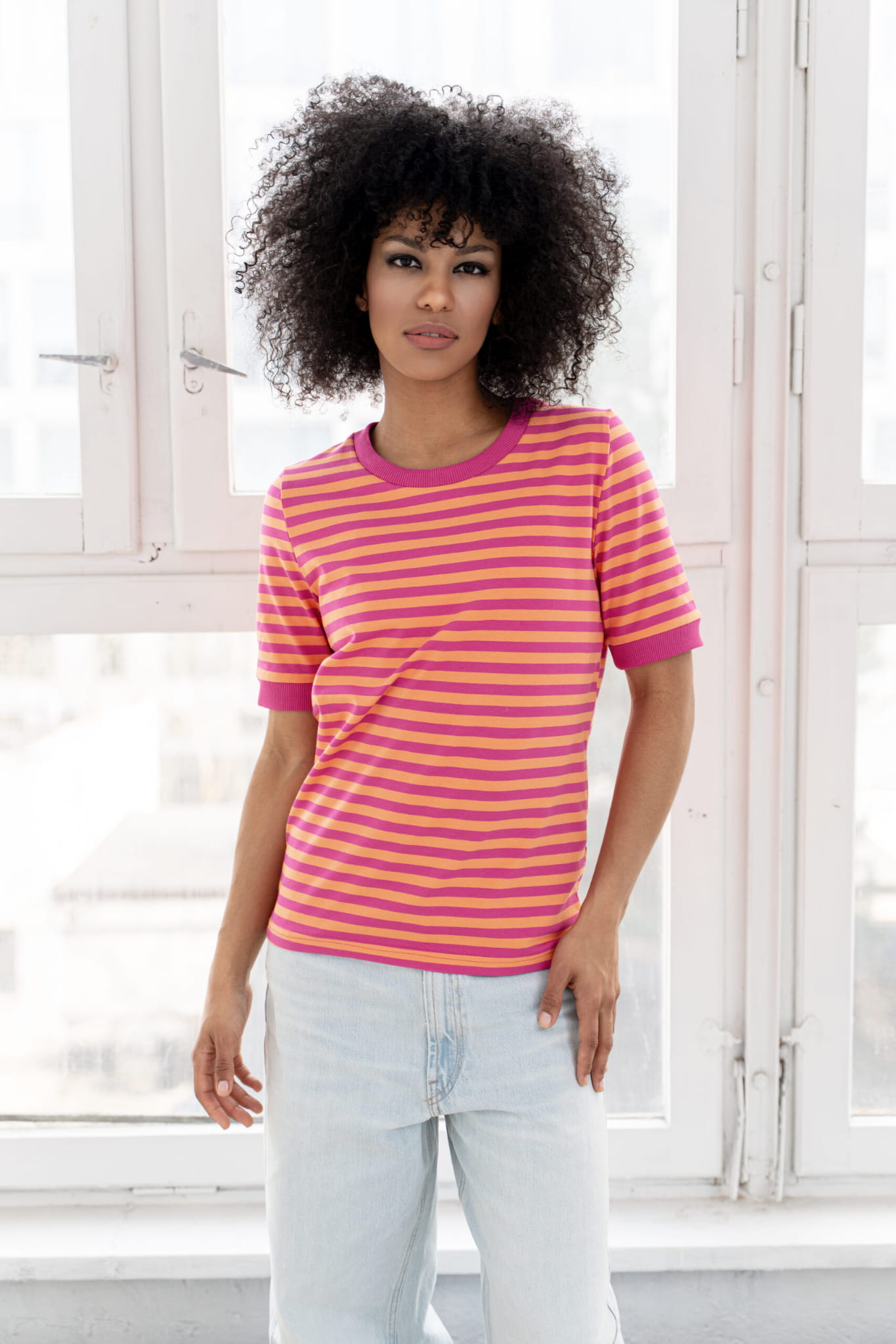 T-shirt damski w paski fuksja pomarańczowy Bopoco