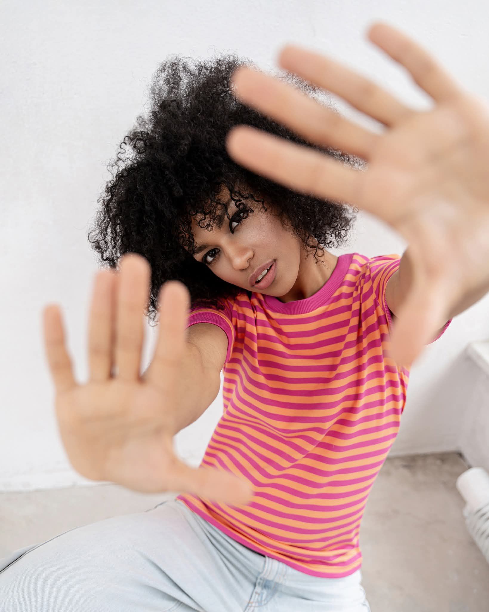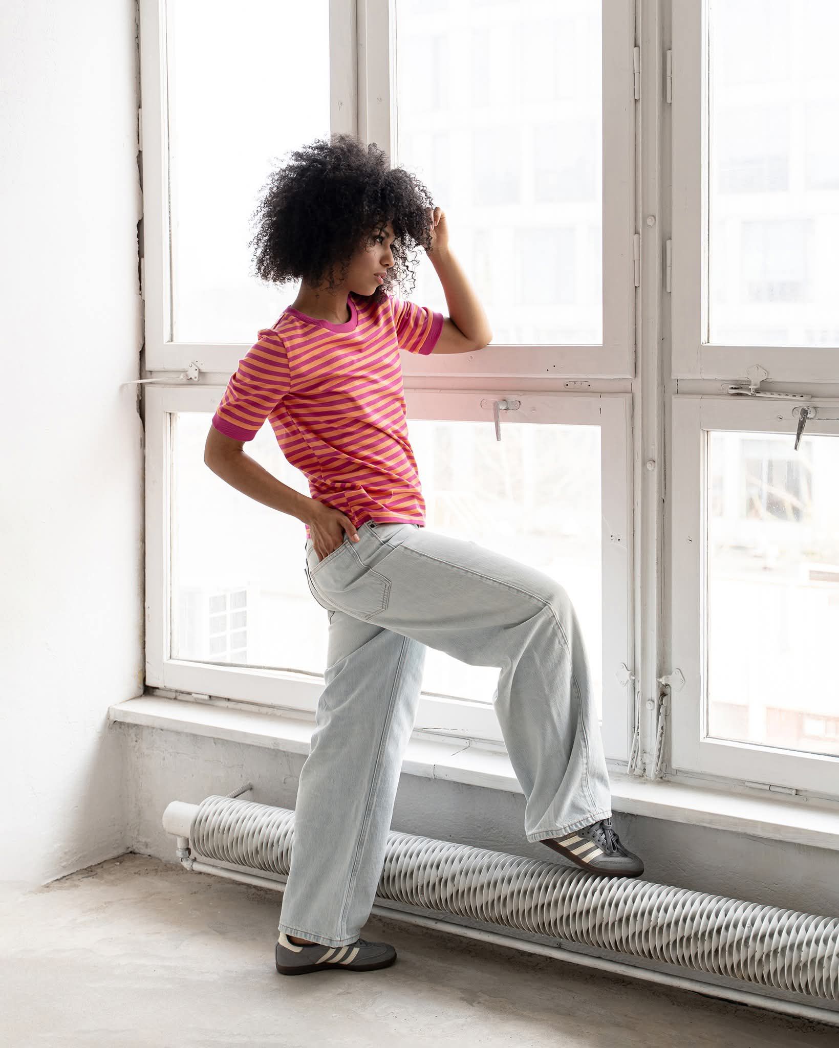 Jeśli szukasz wygodnej, a jednocześnie modnej koszulki na co dzień, to ten t-shirt damski marki Bopoco będzie idealnym wyborem. Klasyczny fason połączony z modnym wzorem w fuksjowo-pomarańczowe paski sprawia, że koszulka wygląda świeżo, kobieco i pasuje do wielu stylizacji.