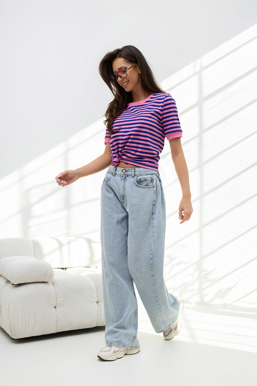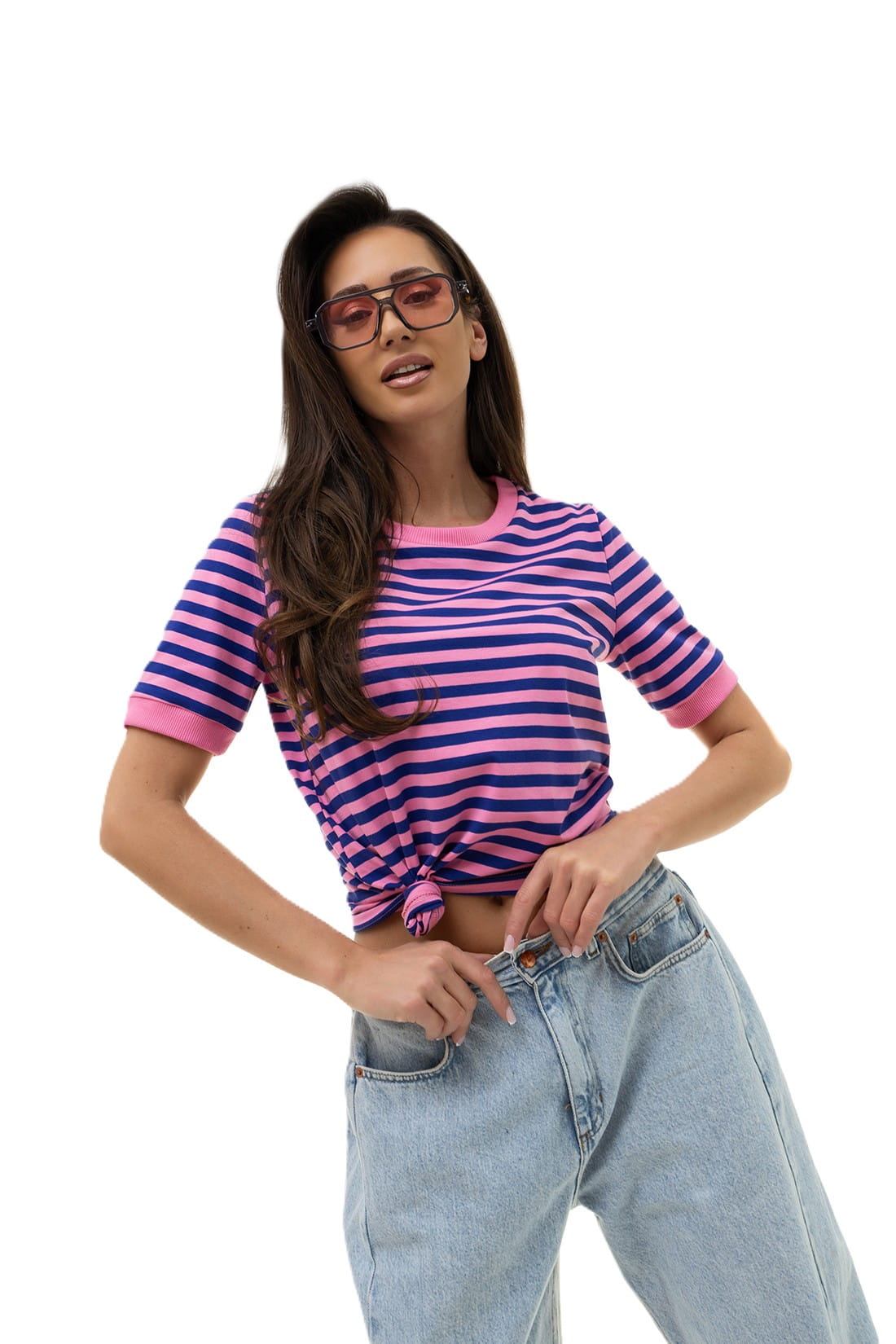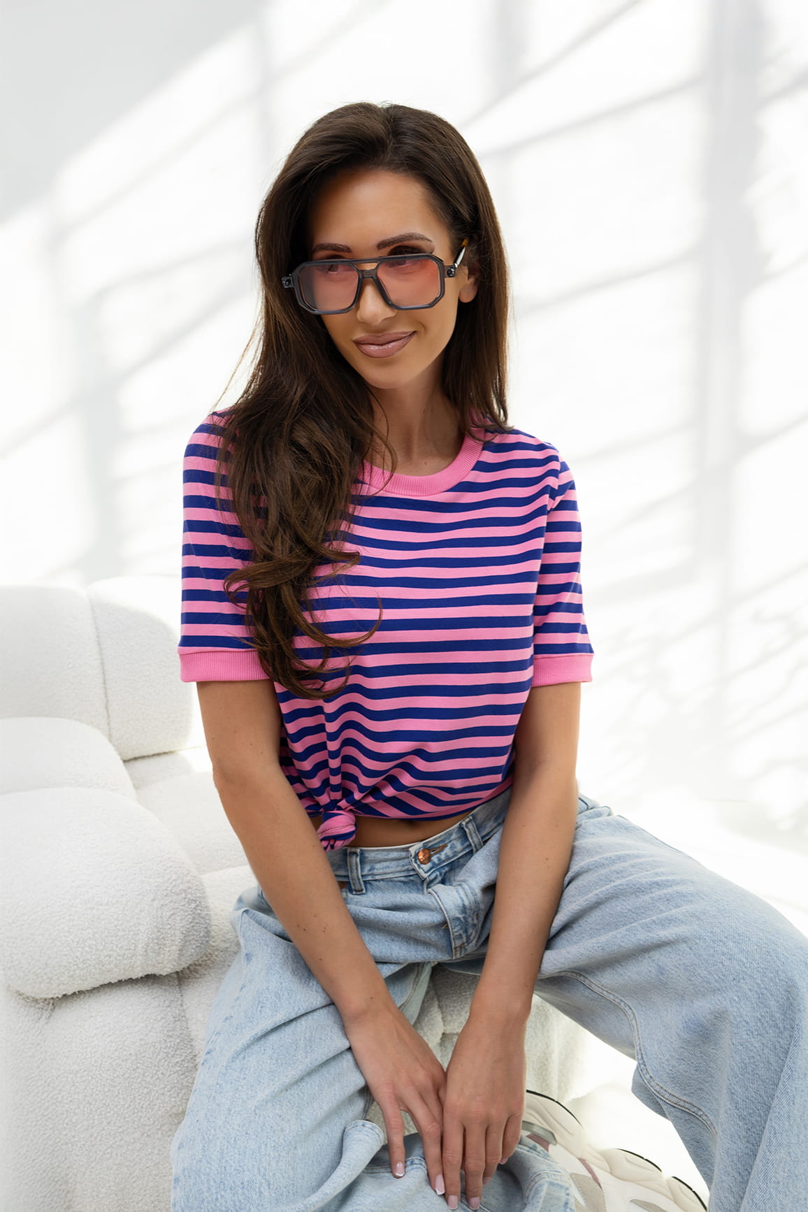 T-shirt Damski Bopoco w Paski Różowo-Granatowy Modna Bluzka Casual Basic