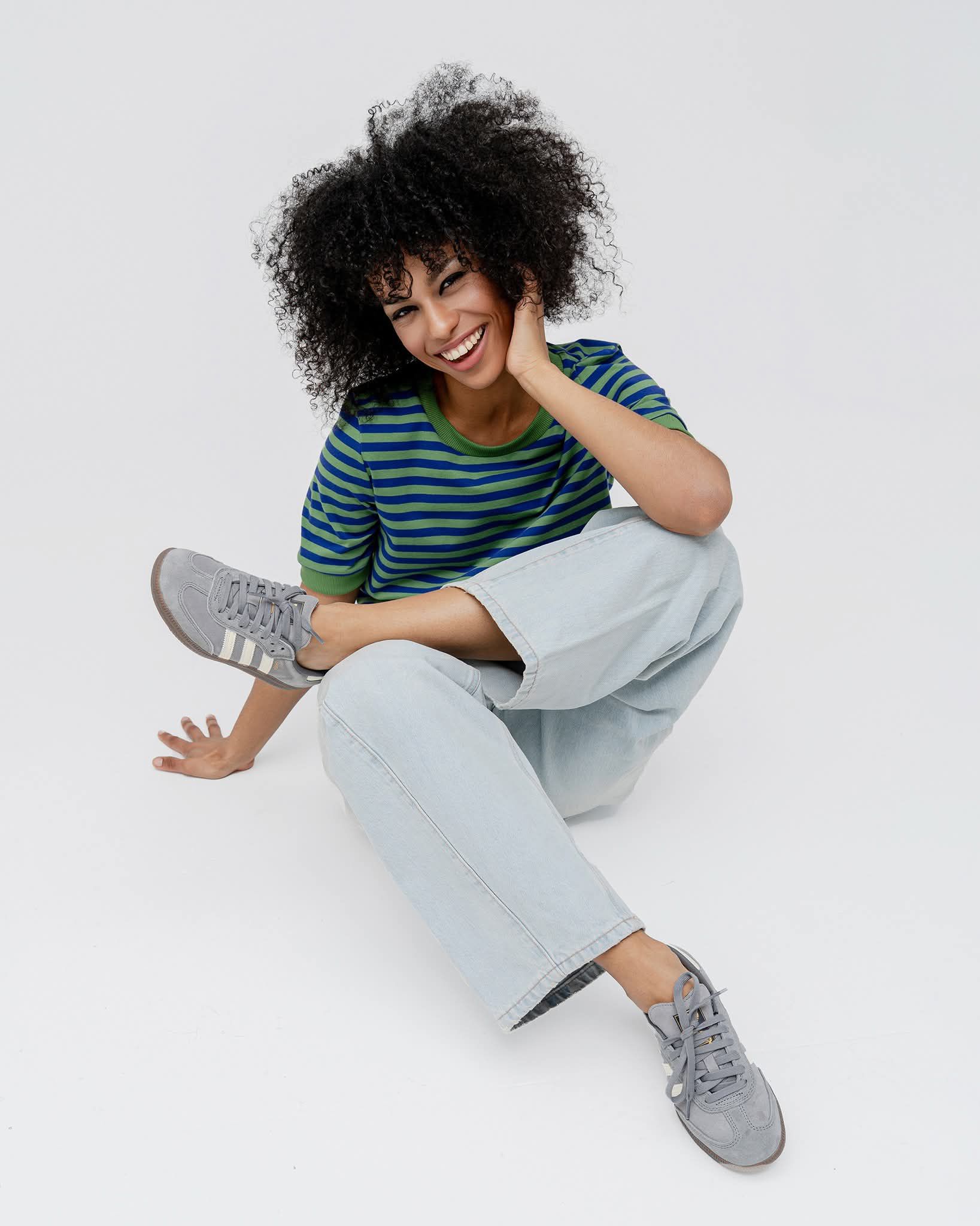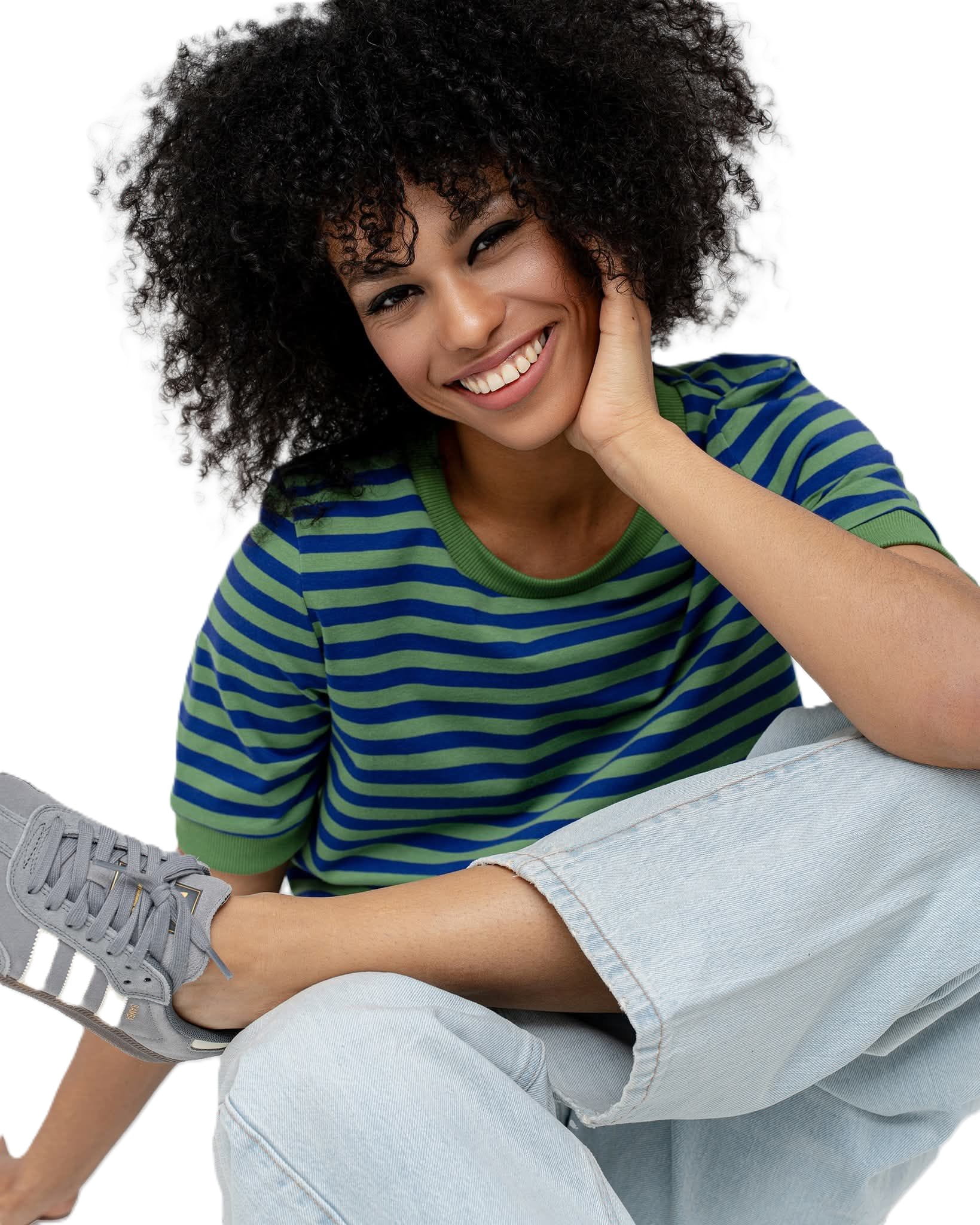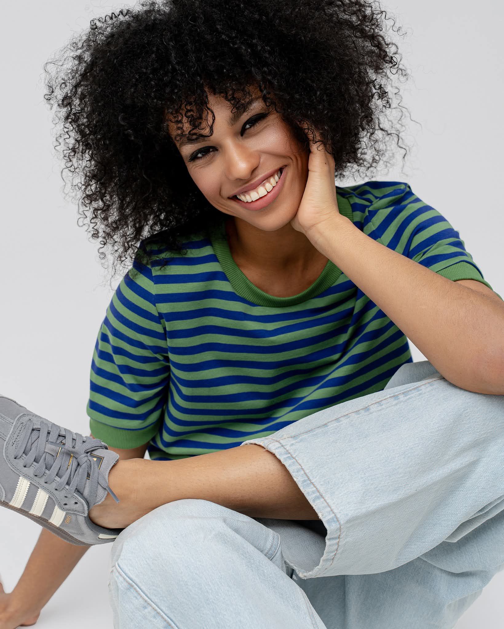 Jeśli szukasz wygodnej, a jednocześnie modnej koszulki na co dzień, to ten t-shirt damski marki Bopoco będzie idealnym wyborem. Klasyczny fason połączony z modnym wzorem w zielono-chabrowe paski sprawia, że koszulka wygląda świeżo, kobieco i pasuje do wielu stylizacji.