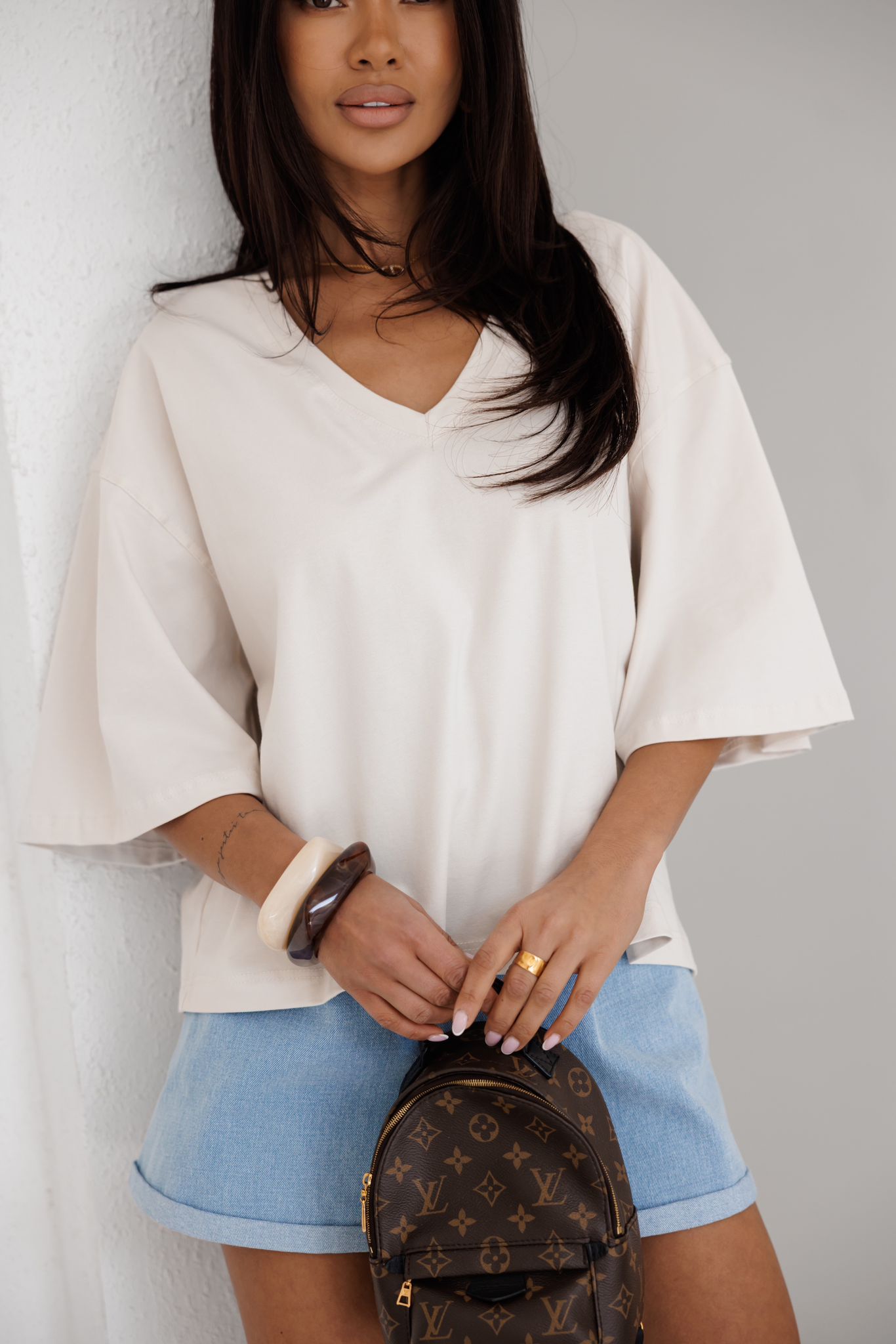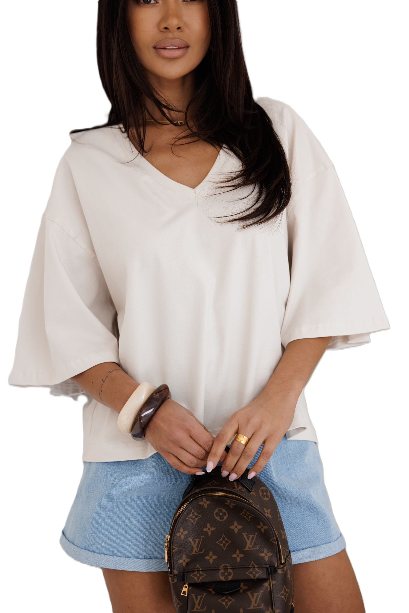 T-shirt damski dekolt V Me Gusta – beżowy, komfort i styl na co dzień