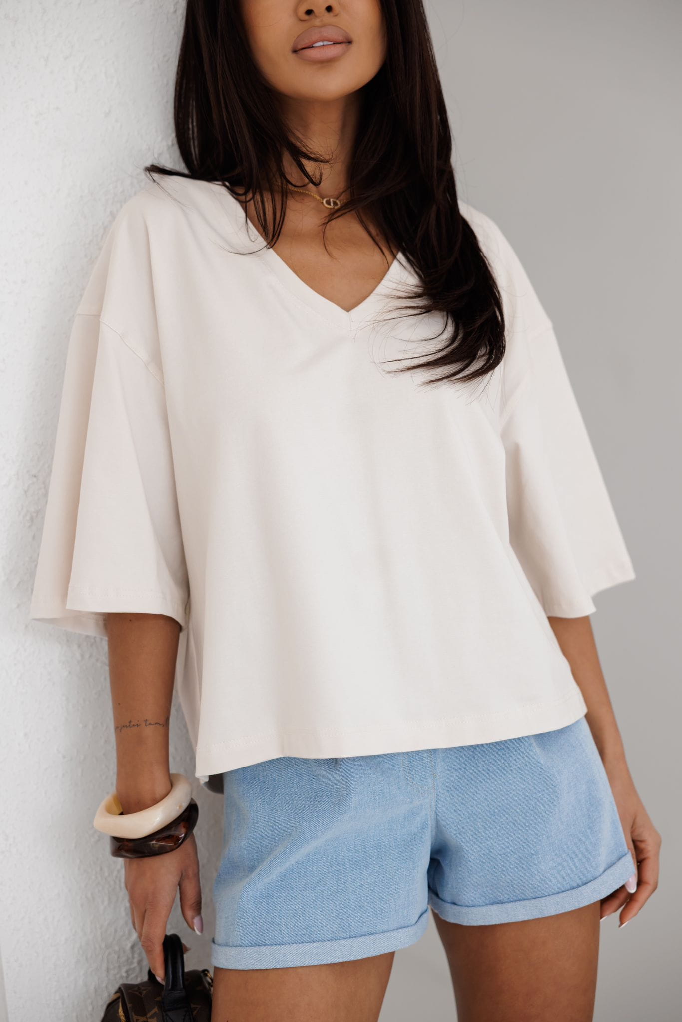 T-shirt damski z dekoltem w serek beżowy Me Gusta