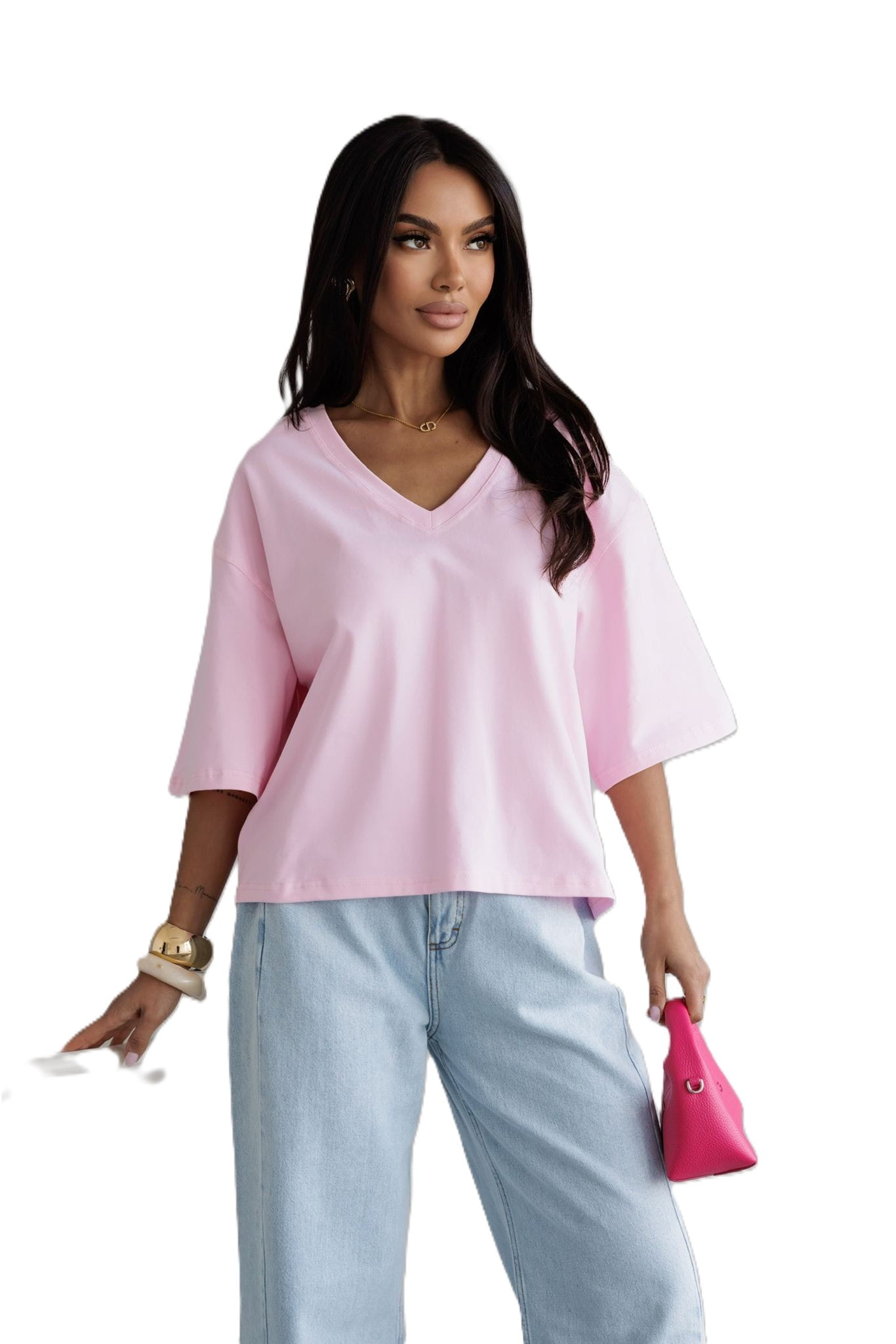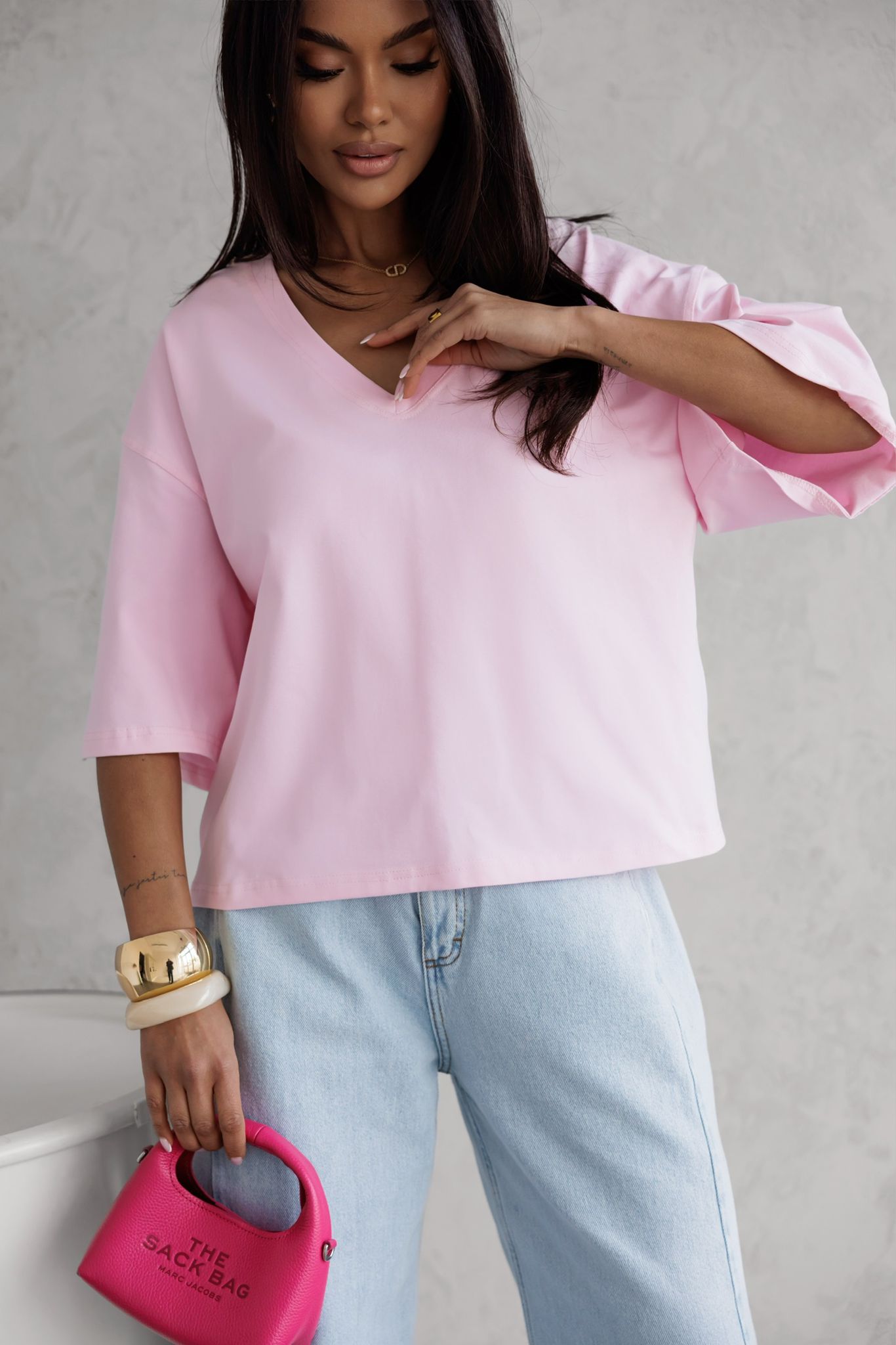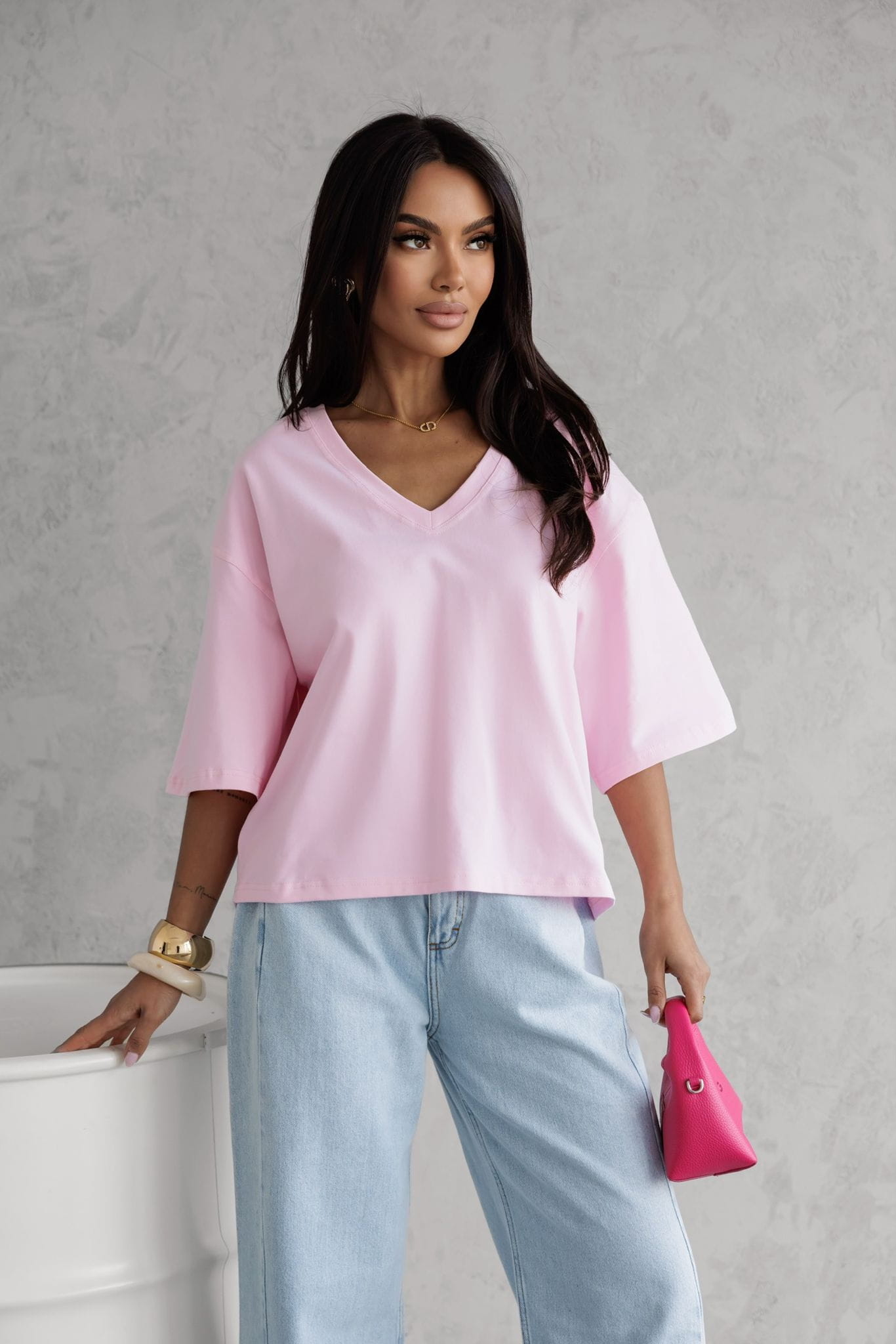 T-shirt damski dekolt V Me Gusta – różowy, komfort i styl na co dzień