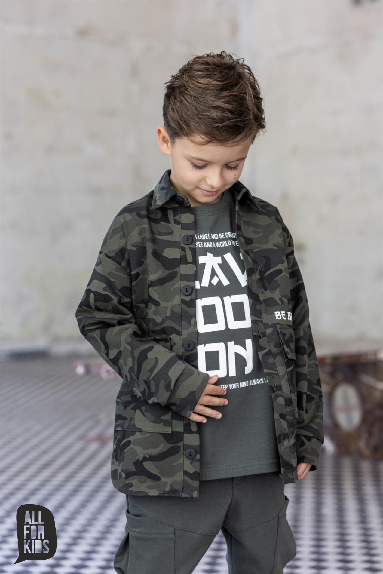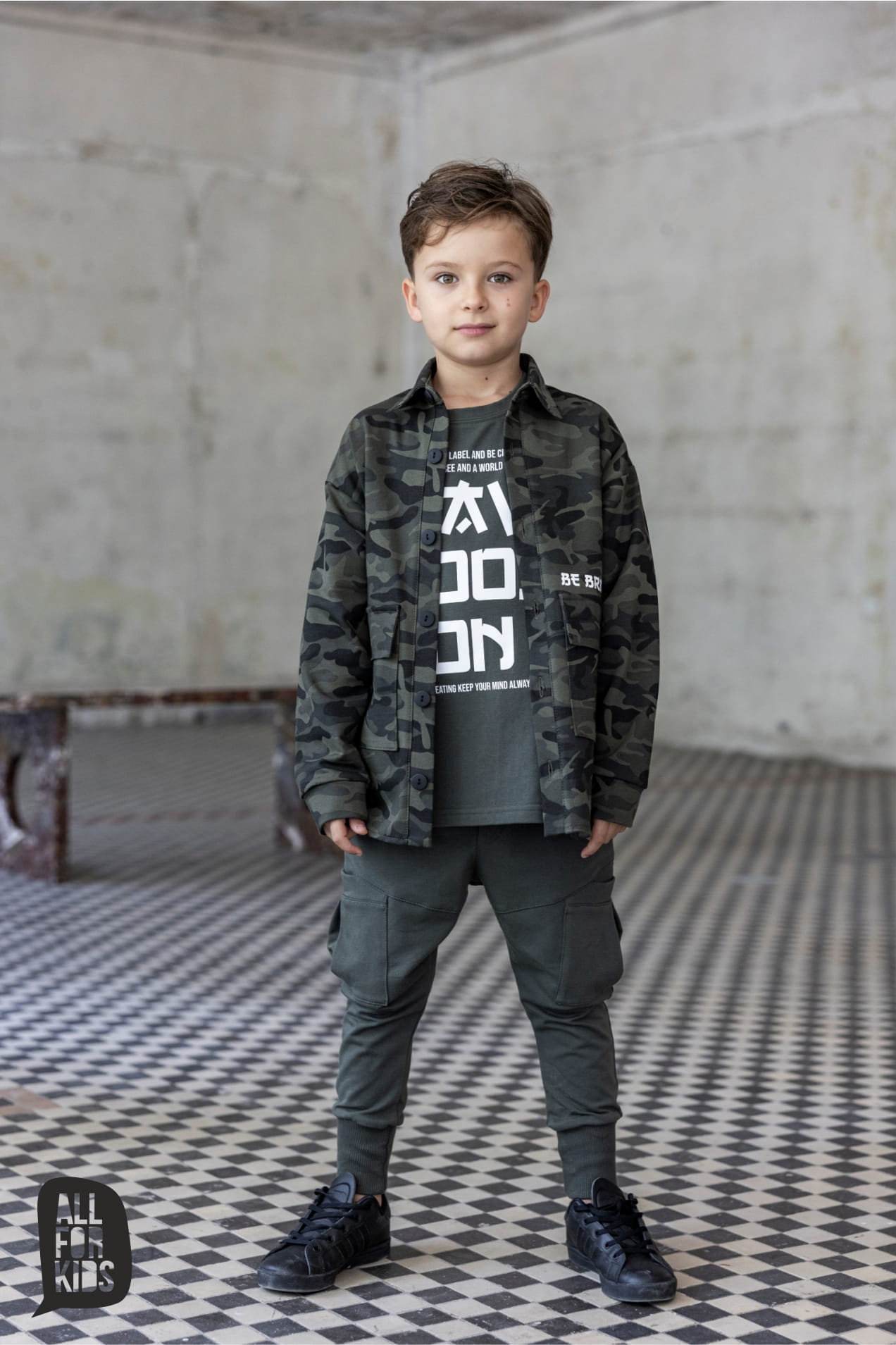Modny t-shirt khaki BRAVE MOOD ON powstał w Polsce przez markę All For Kids z wysokiej jakości, komfortowej w noszeniu bawełny z dodatkiem elastanu.