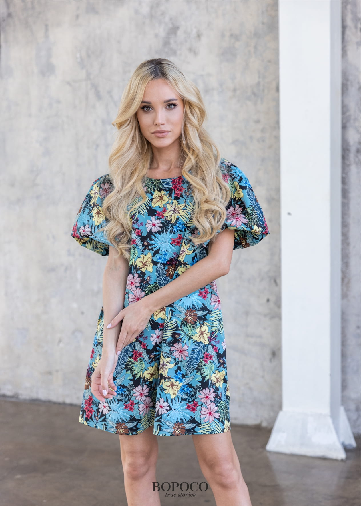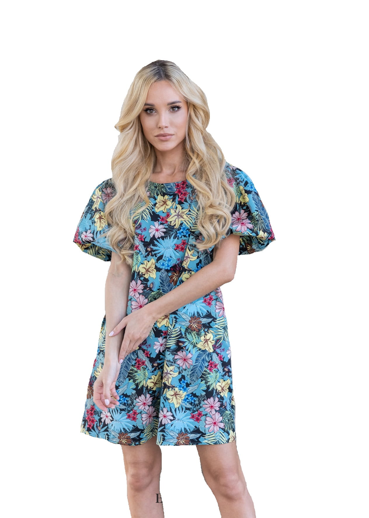 Wzorzysta sukienka z bufiastymi rękawami od polskiej marki BOPOCO true stories. Modna sukienka damska powstała w Polsce z wysokiej jakości materiału w modny roślinny print.
