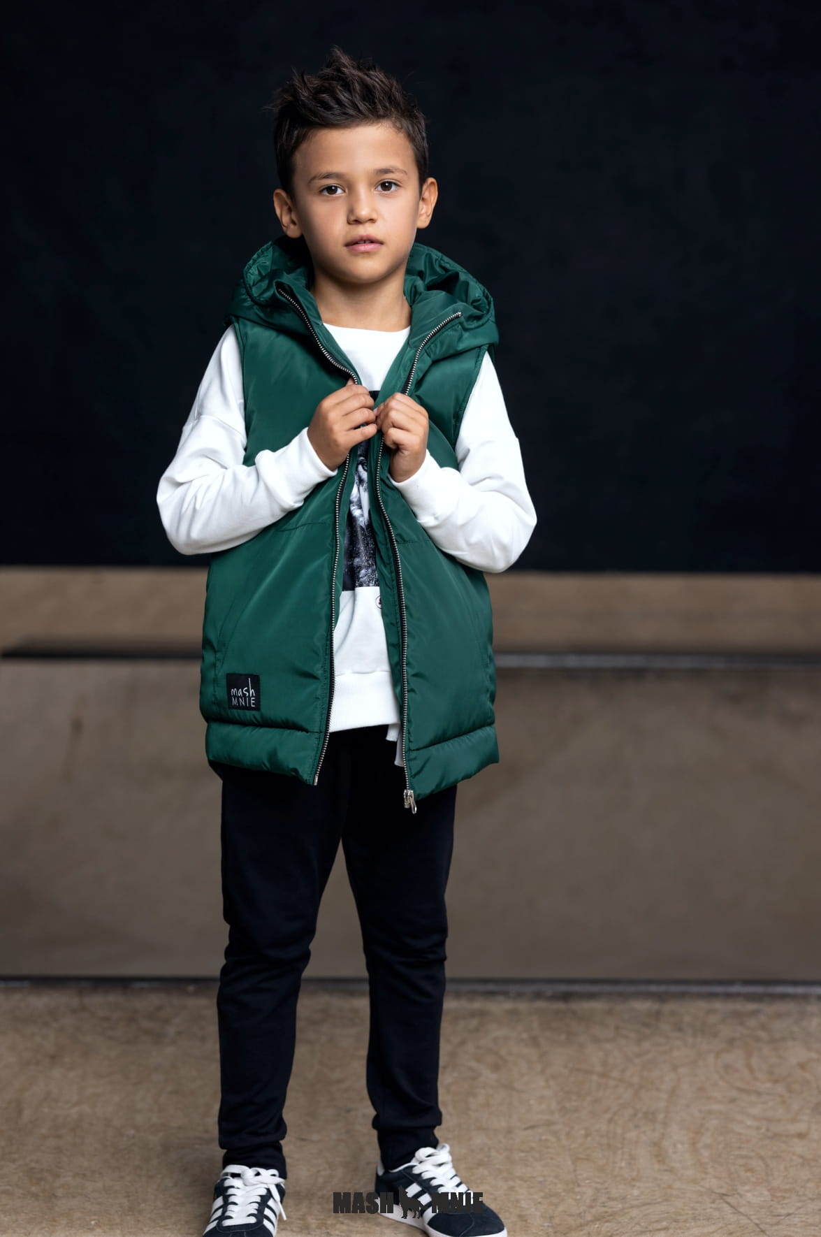 Zielona kamizelka z kapturem i wilkiem powstała w Polsce przez markę Mash MNIE z kolekcji WILD CITY z wysokiej jakości materiałów z dbałością o szczegóły.